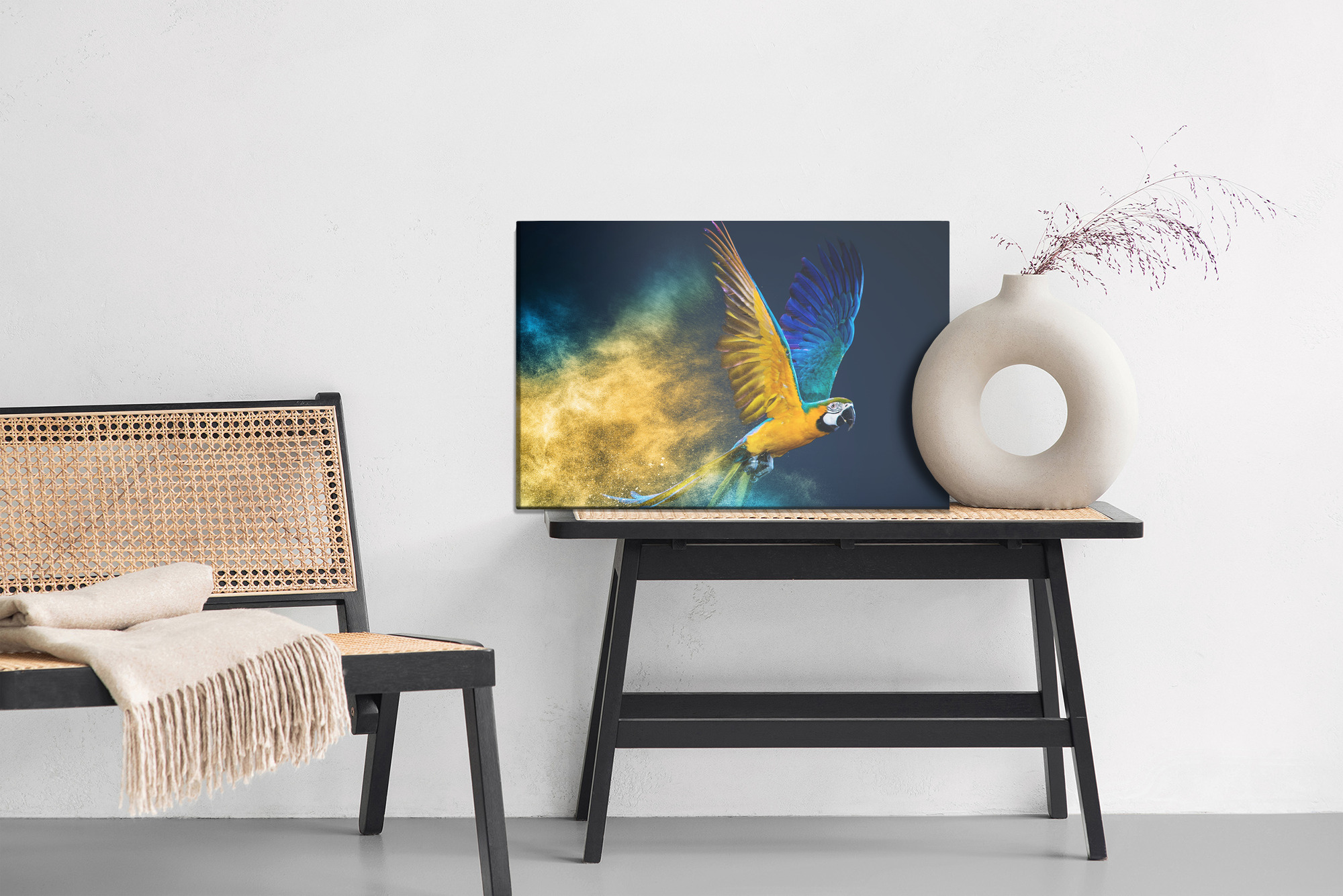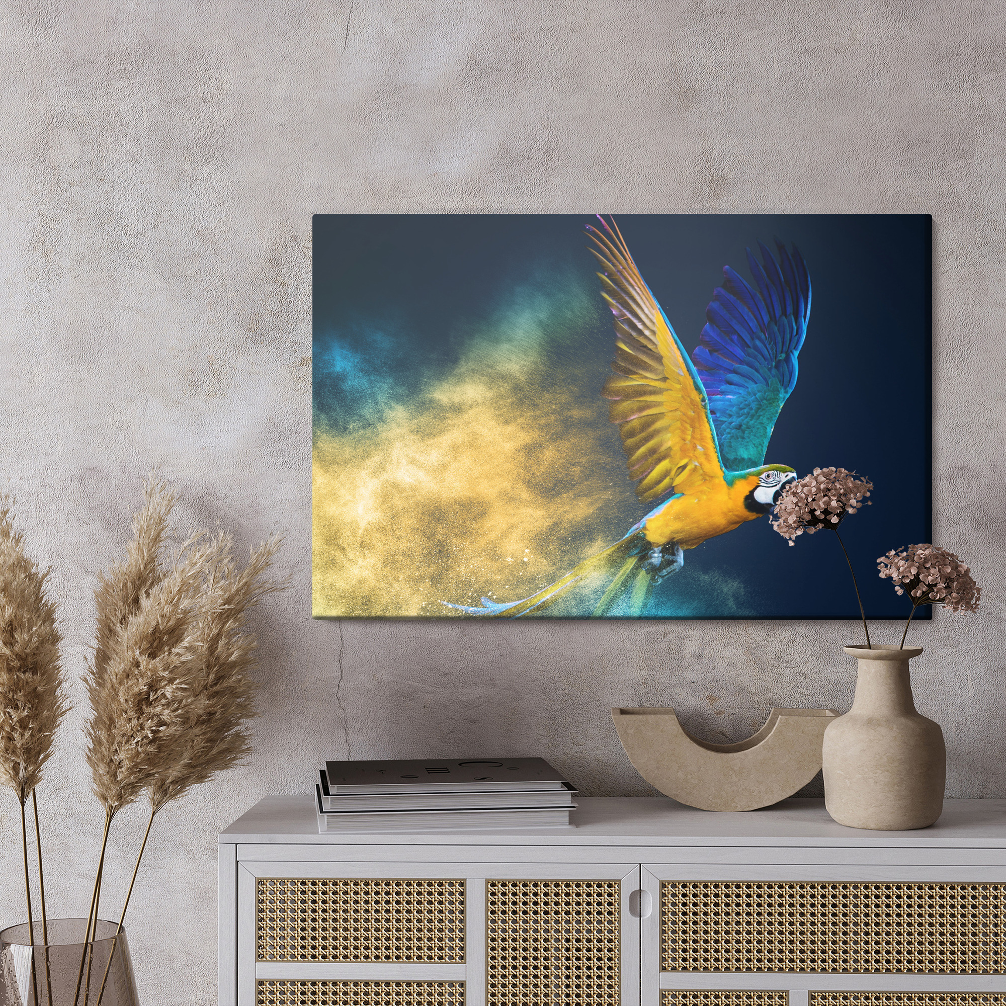 Dodejte interiéru energii a výrazný wow efekt. Tento obraz na plátně zachycuje aru v letu v dynamickém okamžiku, kdy roztažená křídla vytvářejí působivou siluetu na pozadí hluboké námořnické modři. Kompozice zaujme kontrastem a pohybem, proto skvěle zapadne do moderních aranžmá. Barevnost je intenzivní: syté modré a tyrkysové tóny se pojí s teplými žlutými a zlatými odstíny, zatímco za ptákem se rozplývá barevná stopa, která zvýrazňuje dynamiku záběru. Ideální dekorace na stěnu do obývacího pokoje, kanceláře nebo předsíně, hodí se i do hotelu a restaurace jako výrazný prvek.