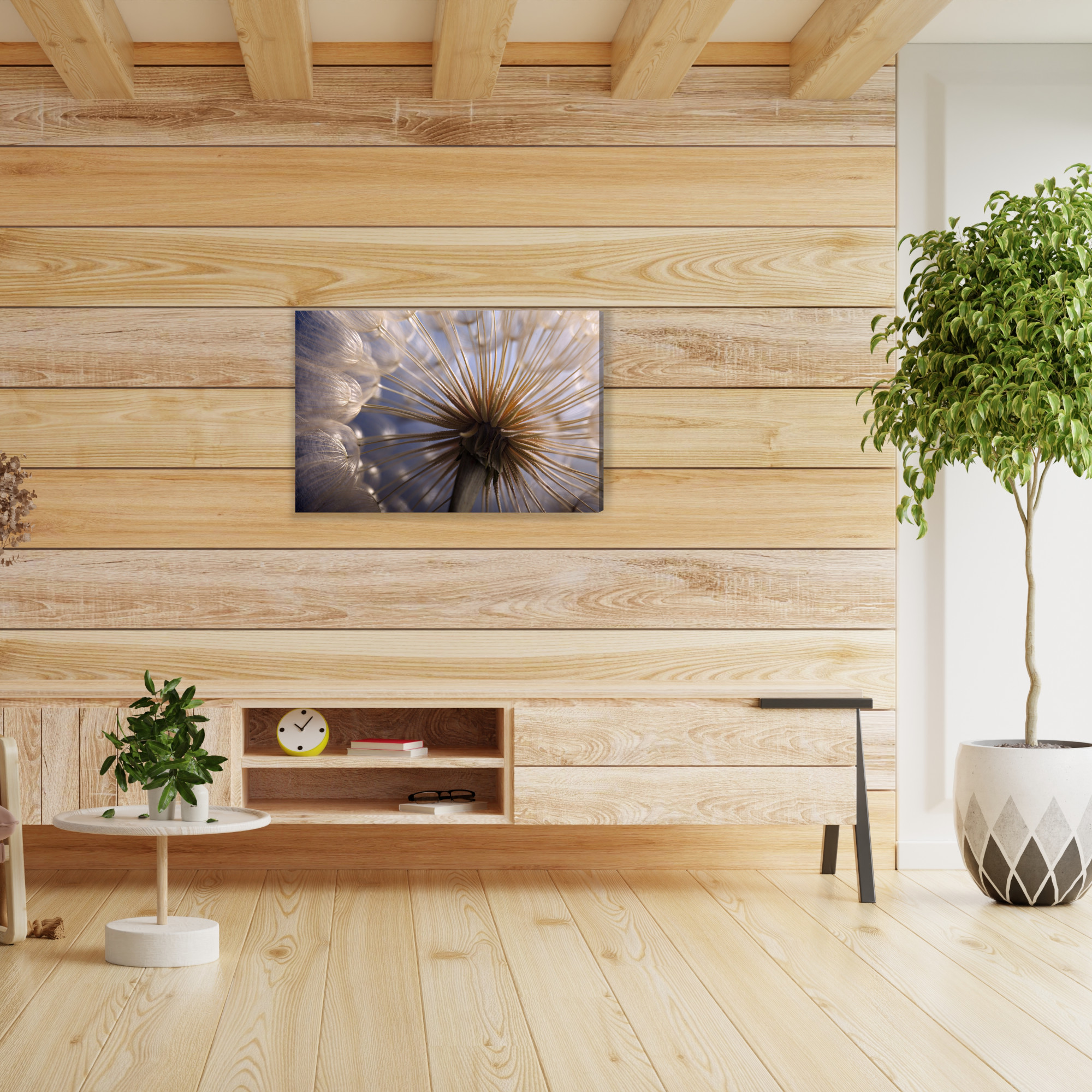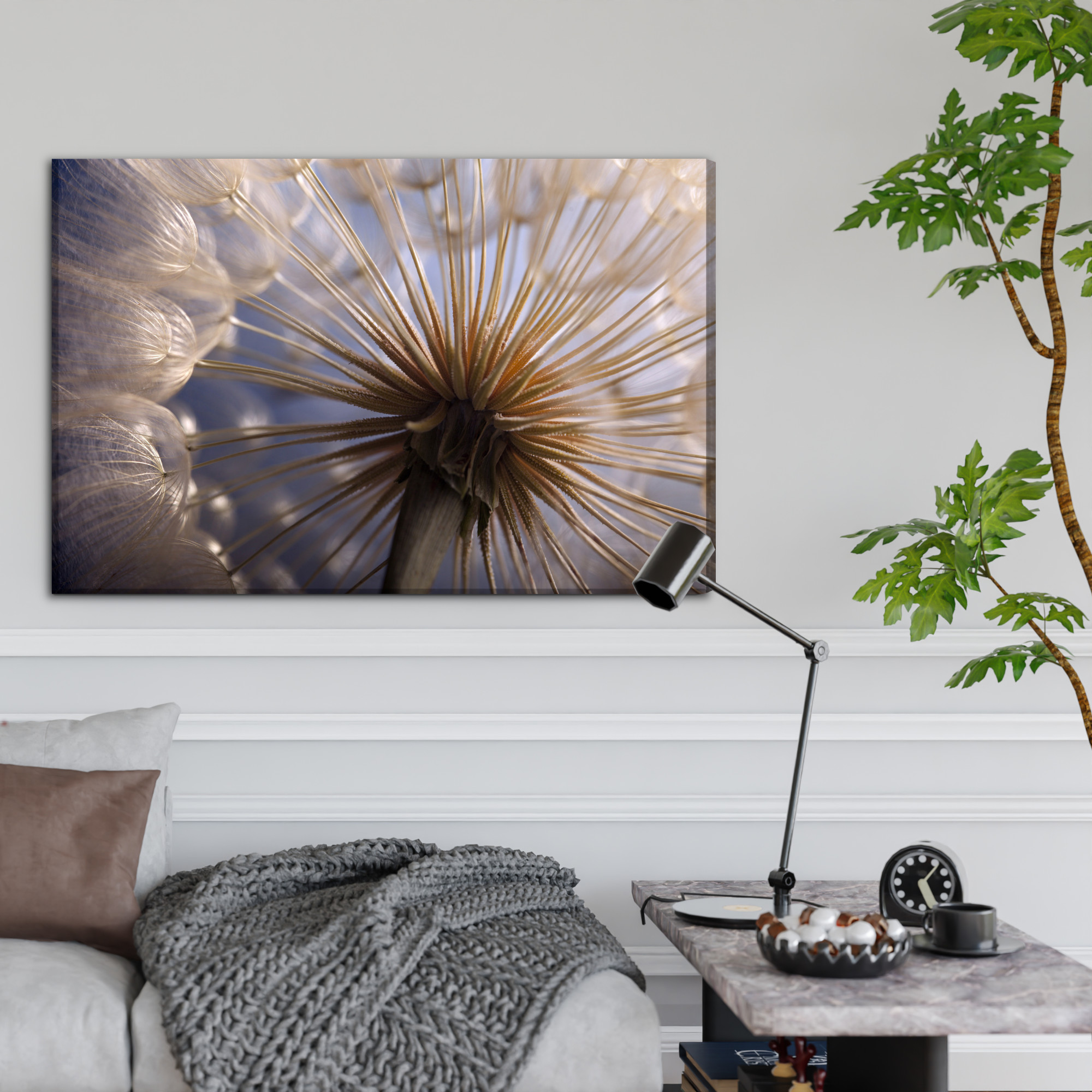 Vysoce kvalitní tisk na plátně dokonale zvýrazňuje detaily struktury rostliny a podtrhuje její přirozenou krásu a lehkost. Pampeliška v makru není jen dekorace, je to poetické ztělesnění křehkosti přírody a harmonie, kterou přináší do každého prostoru.