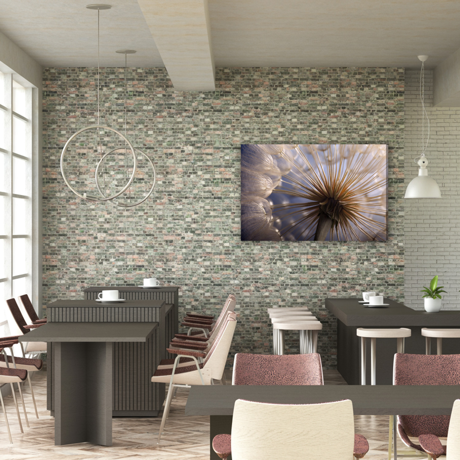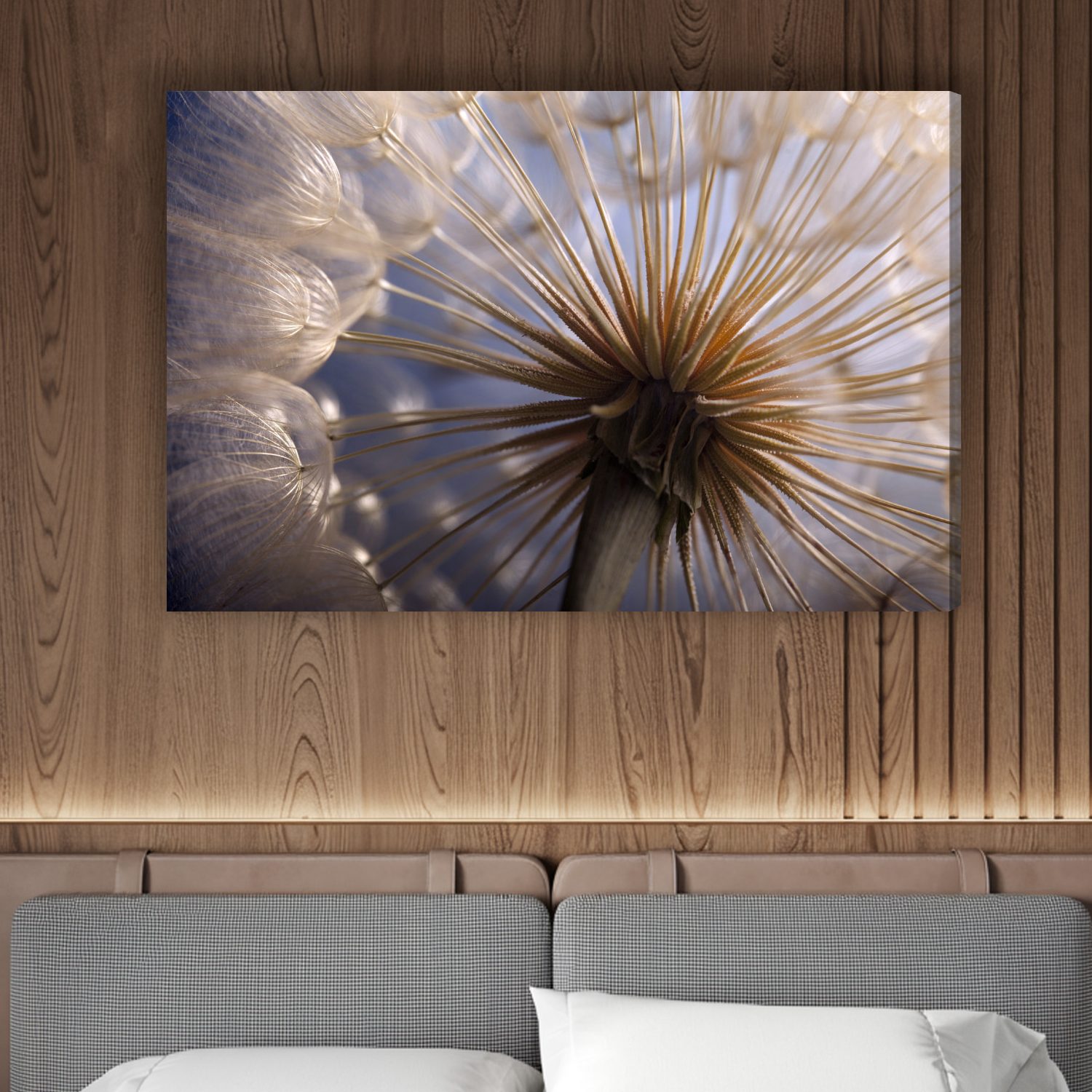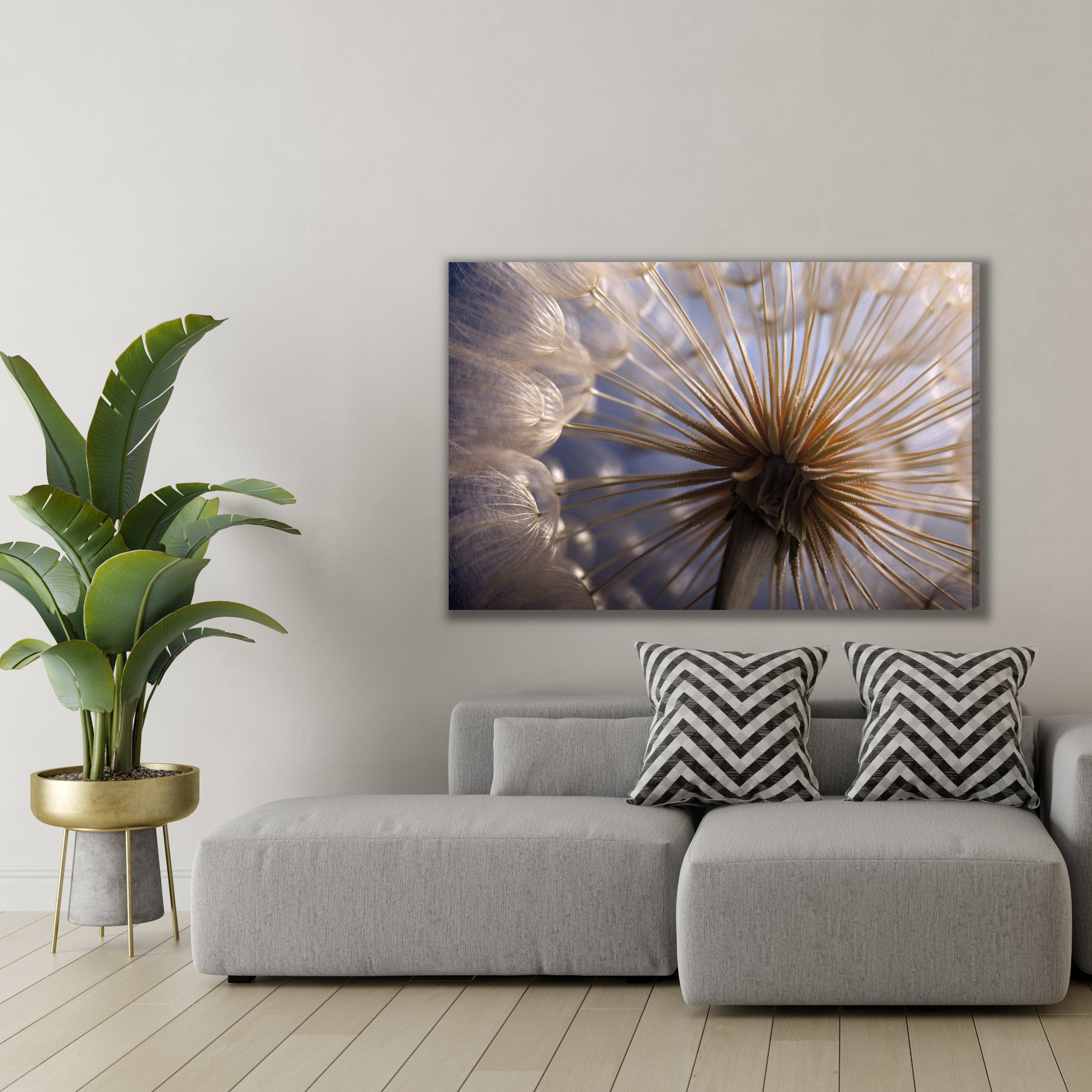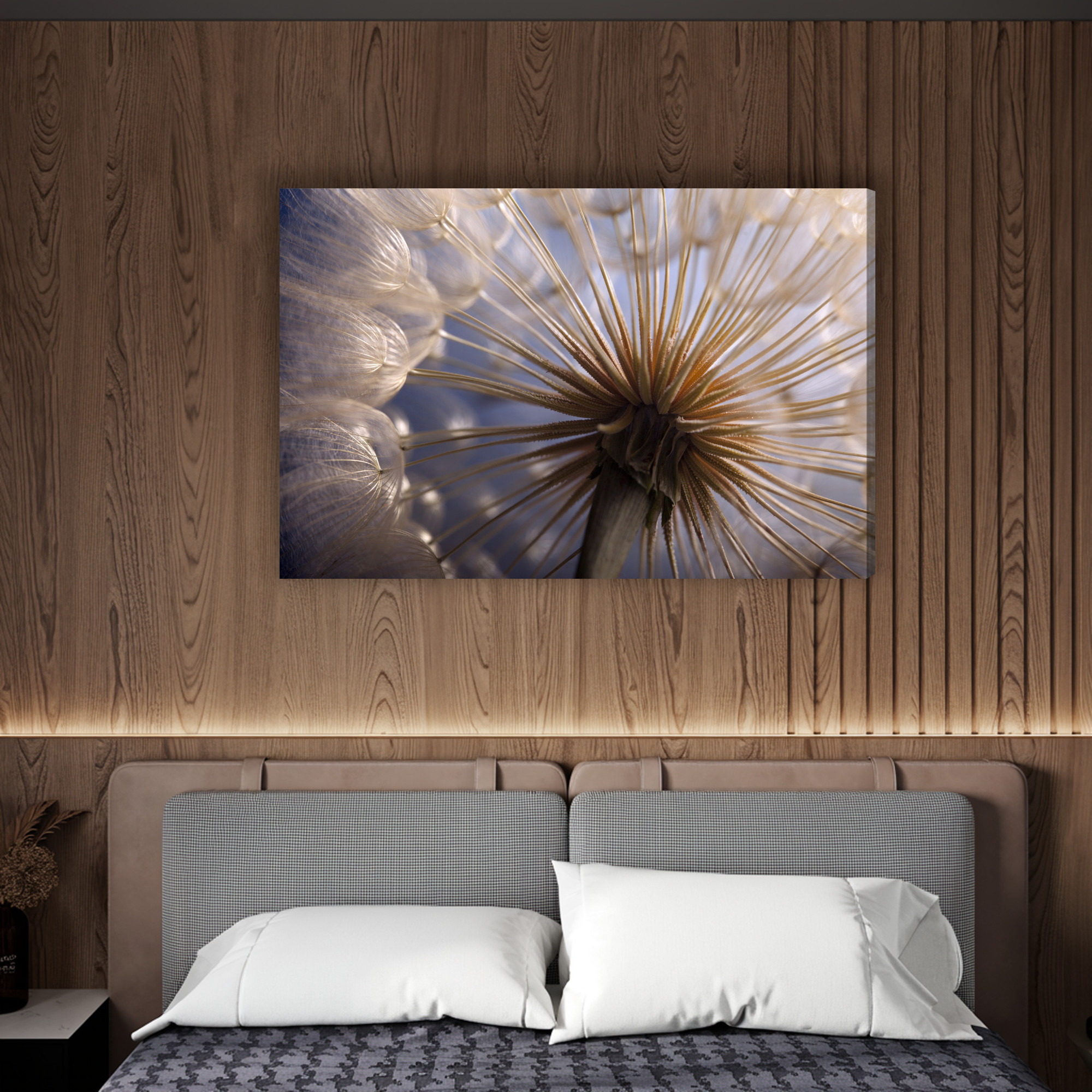 Tento výjimečný obraz na plátně zachycuje křehký svět přírody zblízka – makrofotografie pampelišky v okamžiku její největší lehkosti a jemnosti. Paprskovitá struktura semen vytváří fascinující, téměř abstraktní vzor, zatímco měkké světlo dodává kompozici klid a eleganci.
