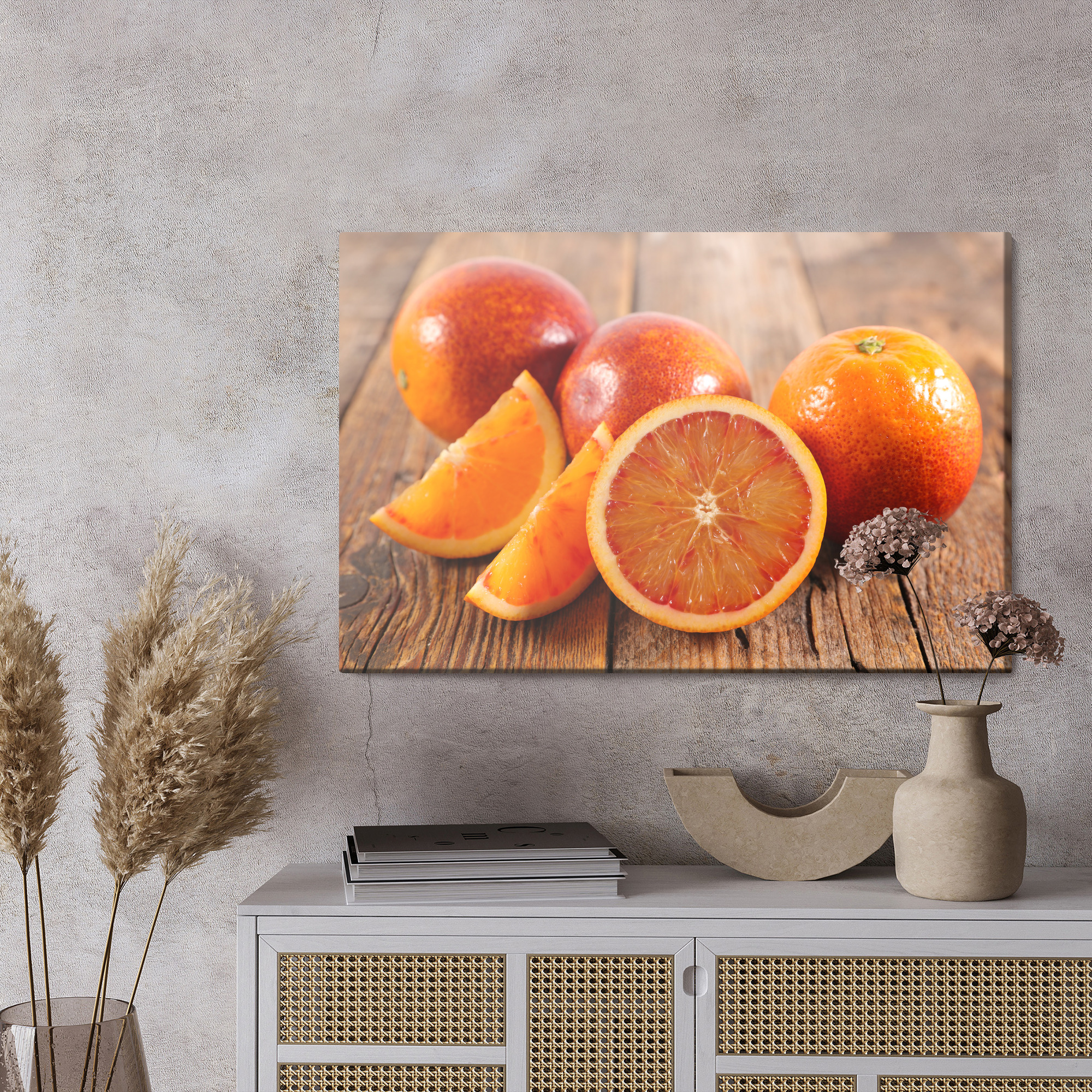 Dieses lebendige Leinwandbild zeigt rote Orangen mit intensiver Farbe und appetitlichem Aussehen, arrangiert auf einer natürlichen Holzoberfläche im warmen Licht. Die Kombination aus tiefem Rot und Orangetönen mit der feinen Holzstruktur schafft eine harmonische Komposition voller Frische und Natürlichkeit. Eine Dekoration, die Freude, Sonne und positive Energie in jeden Raum bringt.