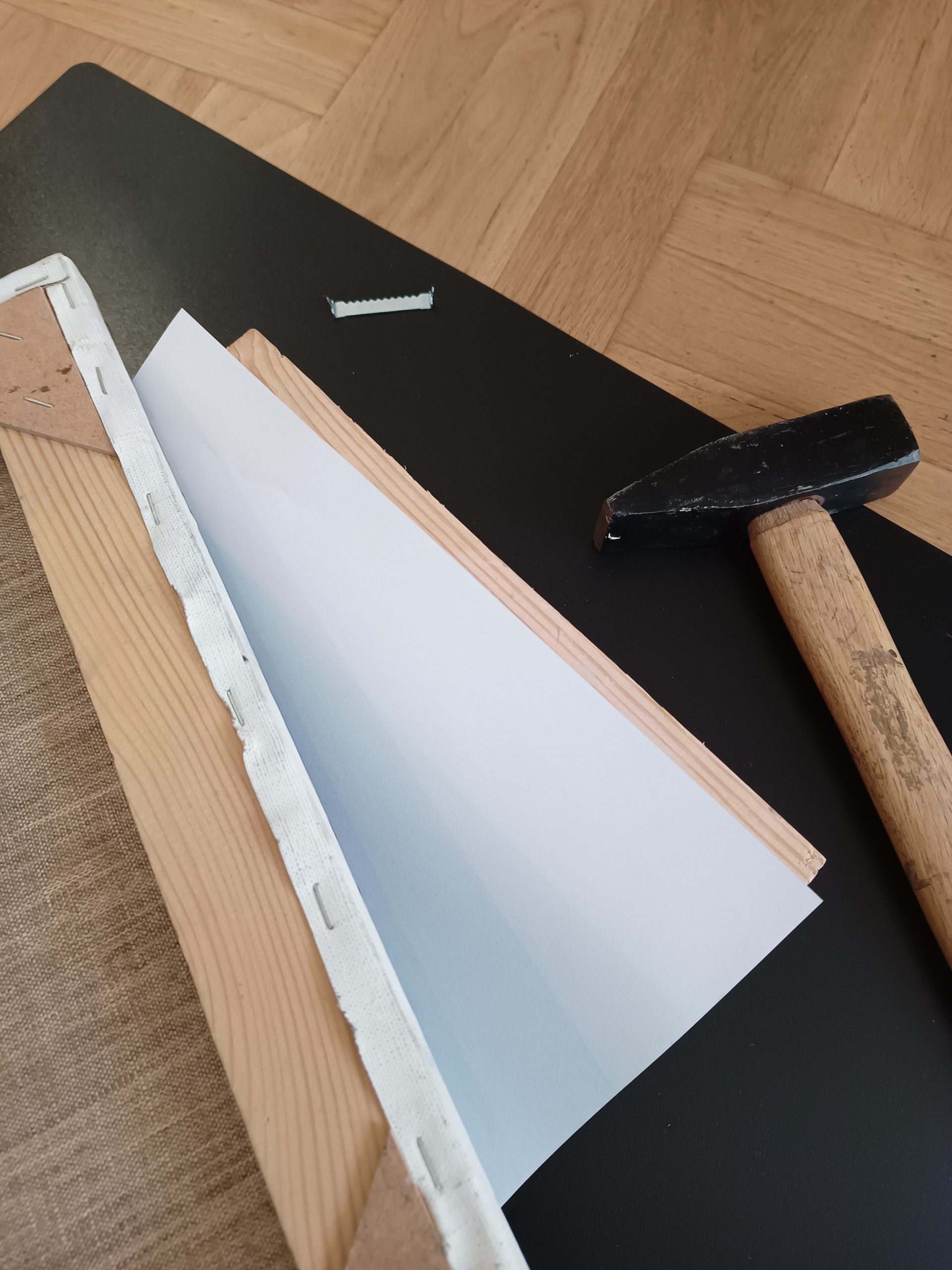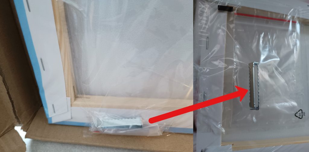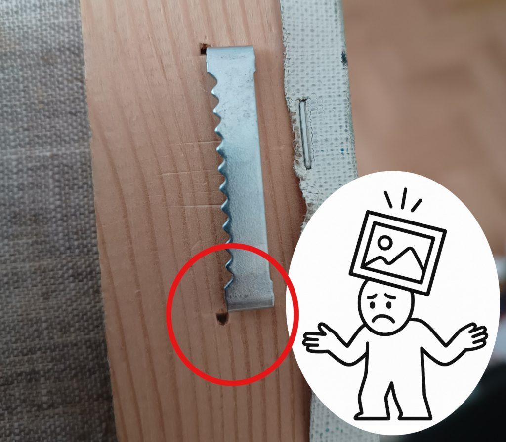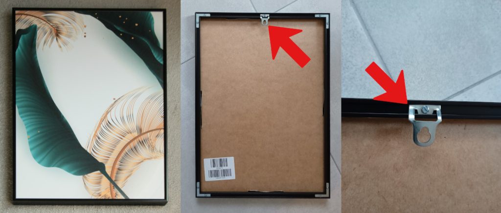 Artworks in wooden frames are delivered with a hanger that needs to be attached to the frame manually. Depending on the size of the artwork, the set may include one or two nail-in hangers: