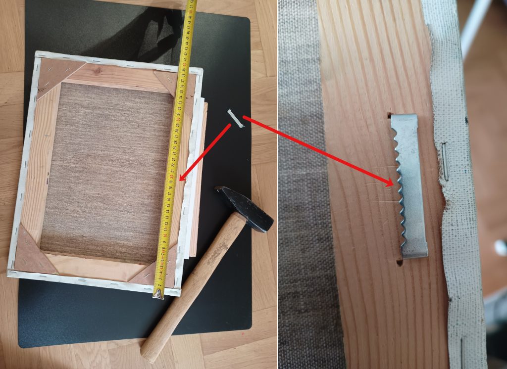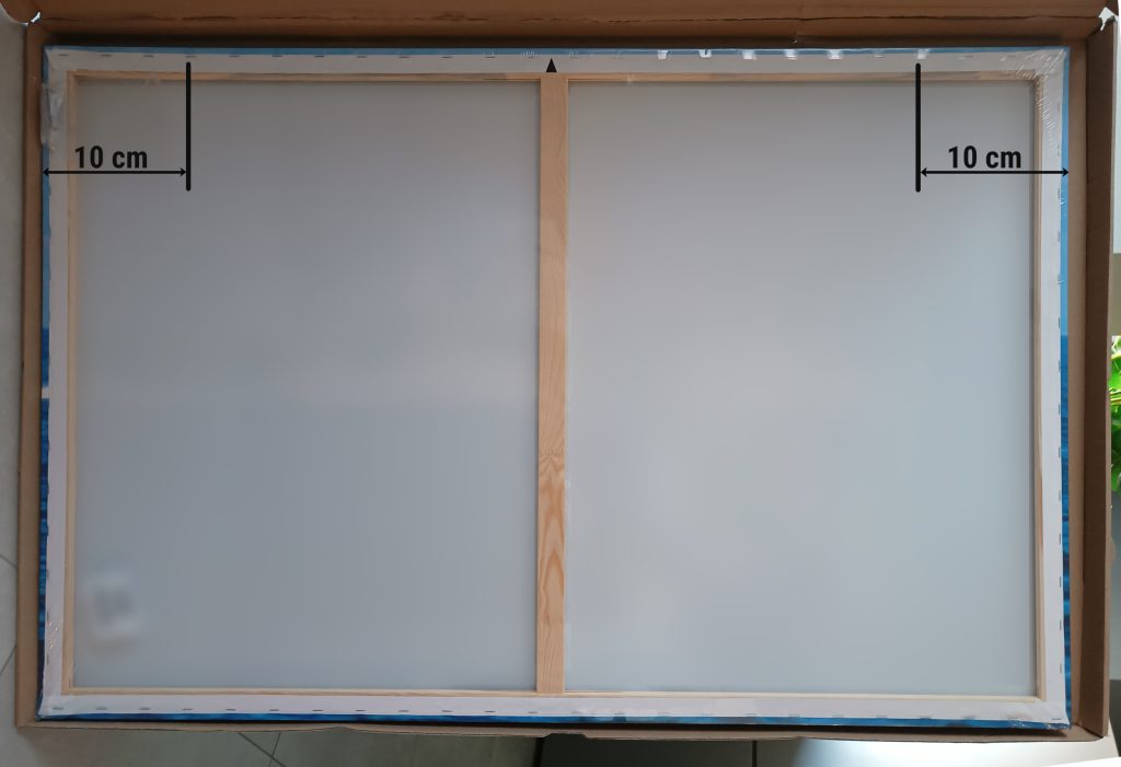 For larger artwork, if two hangers are included in the set, measure 10 cm from the right and 10 cm from the left side of the top wooden bar and insert both hangers symmetrically along the same line on the back of the frame: