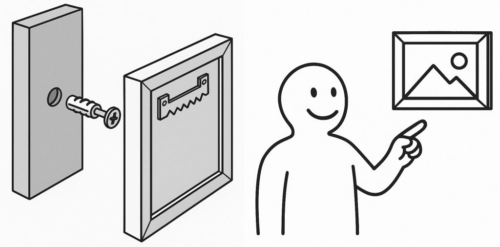 Depending on the type of artwork (painting or poster, frame type) and its dimensions, there are several ways to mount it on the wall.