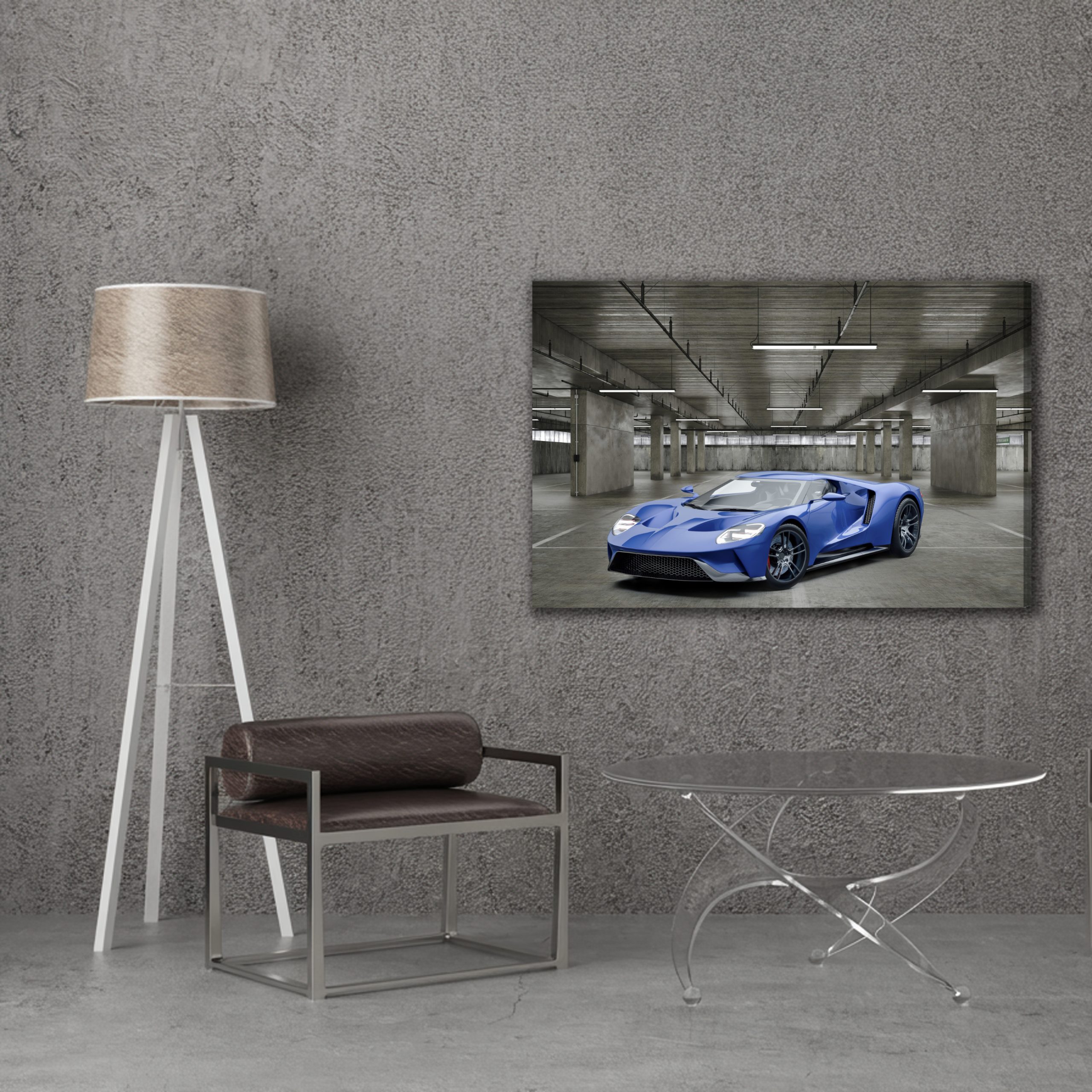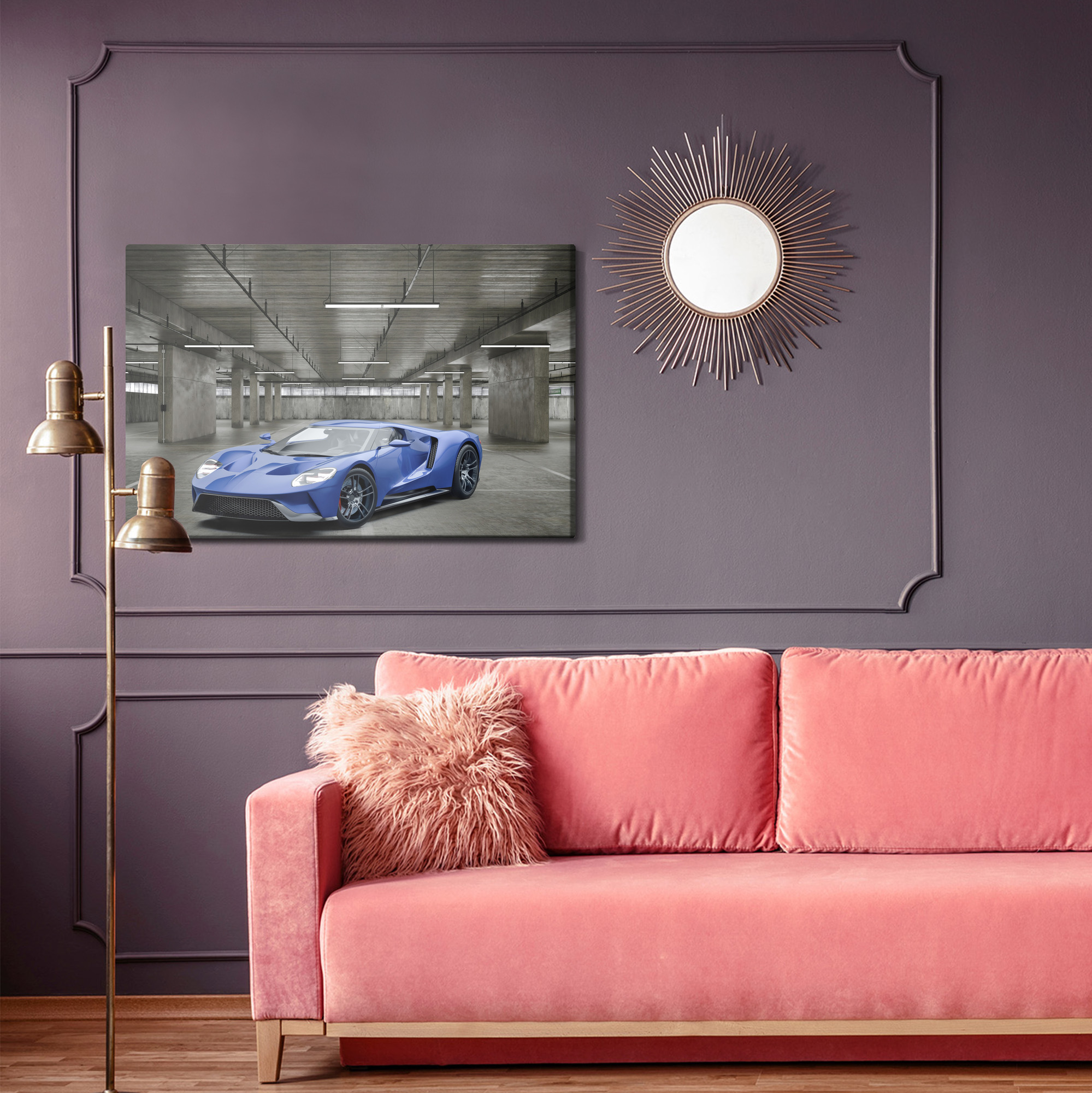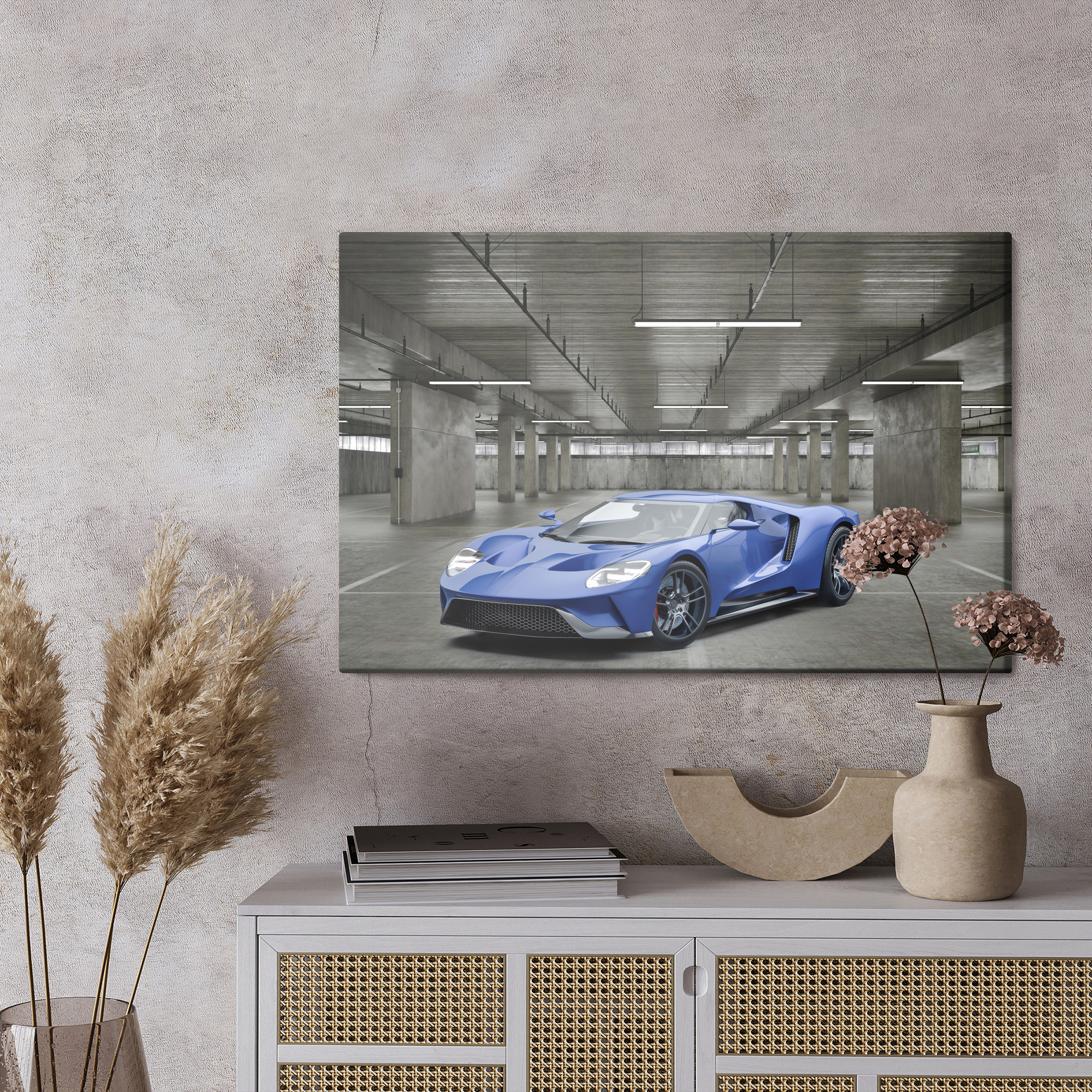Ten obraz na płótnie przedstawia dynamiczną scenę z niebieskim samochodem sportowym zaparkowanym w surowym, betonowym garażu. Połączenie błękitnego lakieru auta z industrialnym tłem tworzy wyjątkowy kontrast, który przyciąga wzrok i emanuje nowoczesną energią. To idealna dekoracja dla miłośników motoryzacji, szybkości i eleganckiego designu. Doskonale sprawdzi się w salonie o nowoczesnym wystroju, w biurze, gabinecie, pokoju młodzieżowym lub w przestrzeniach tematycznych związanych z motoryzacją.