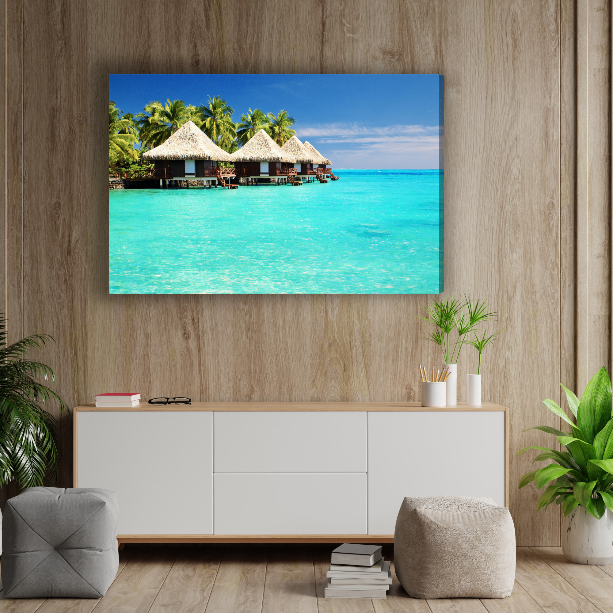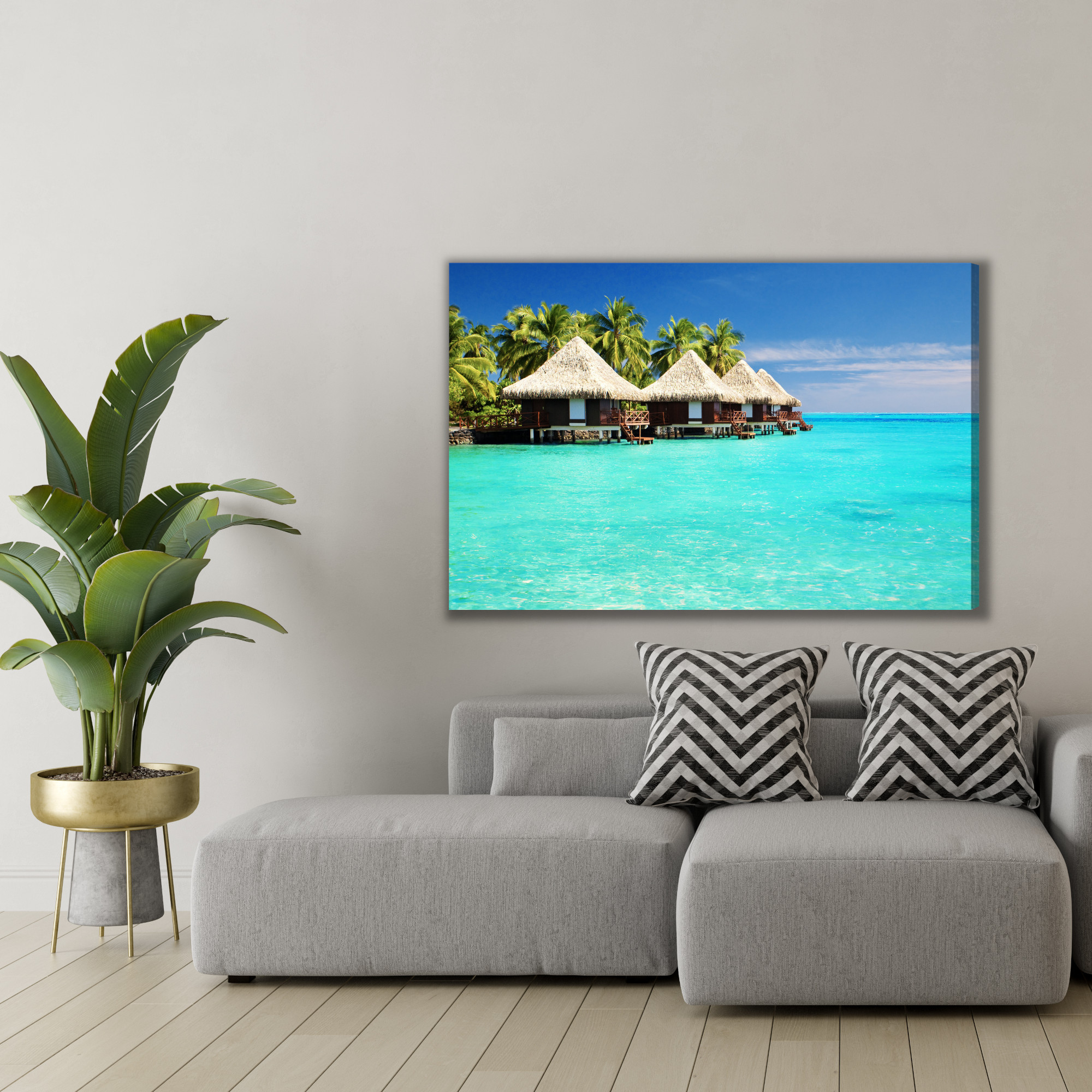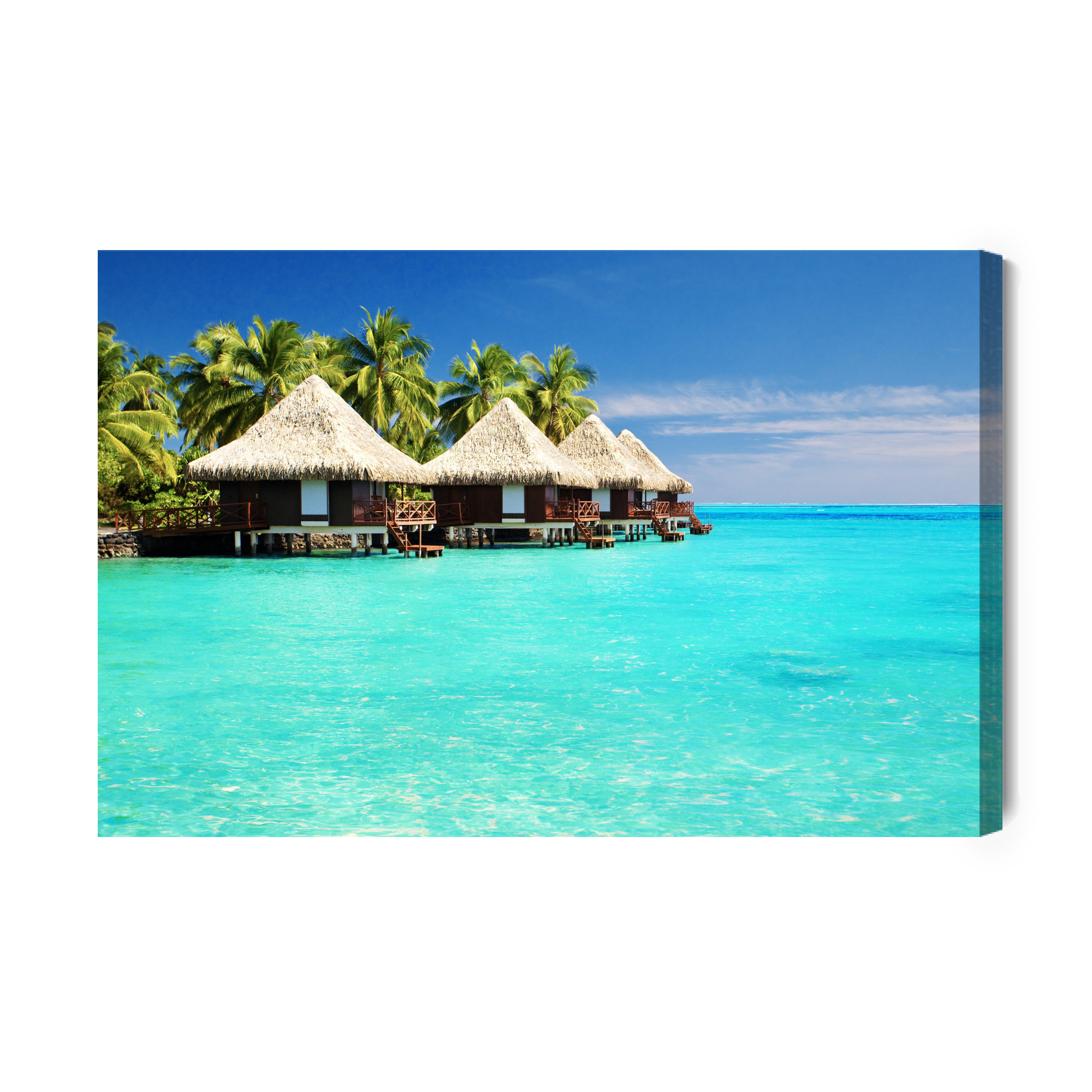 Wnieś do wnętrza klimat luksusowych wakacji: bungalowy na wodzie, palmy i krystalicznie turkusowa laguna tworzą widok, który uspokaja i od razu poprawia nastrój. Ten obraz na płótnie rozświetla przestrzeń, dodaje jej lekkości i wprowadza wrażenie bezkresu, idealne do strefy relaksu. Świeża paleta turkusów, błękitów i zieleni przełamana beżem strzech i ciepłym brązem zabudowy pięknie współgra z naturalnymi materiałami oraz nowoczesnymi aranżacjami. Świetny jako obraz do salonu, sypialni, biura, hotelu, restauracji lub przedpokoju, gdy szukasz eleganckich obrazów na ścianę z motywem morza.