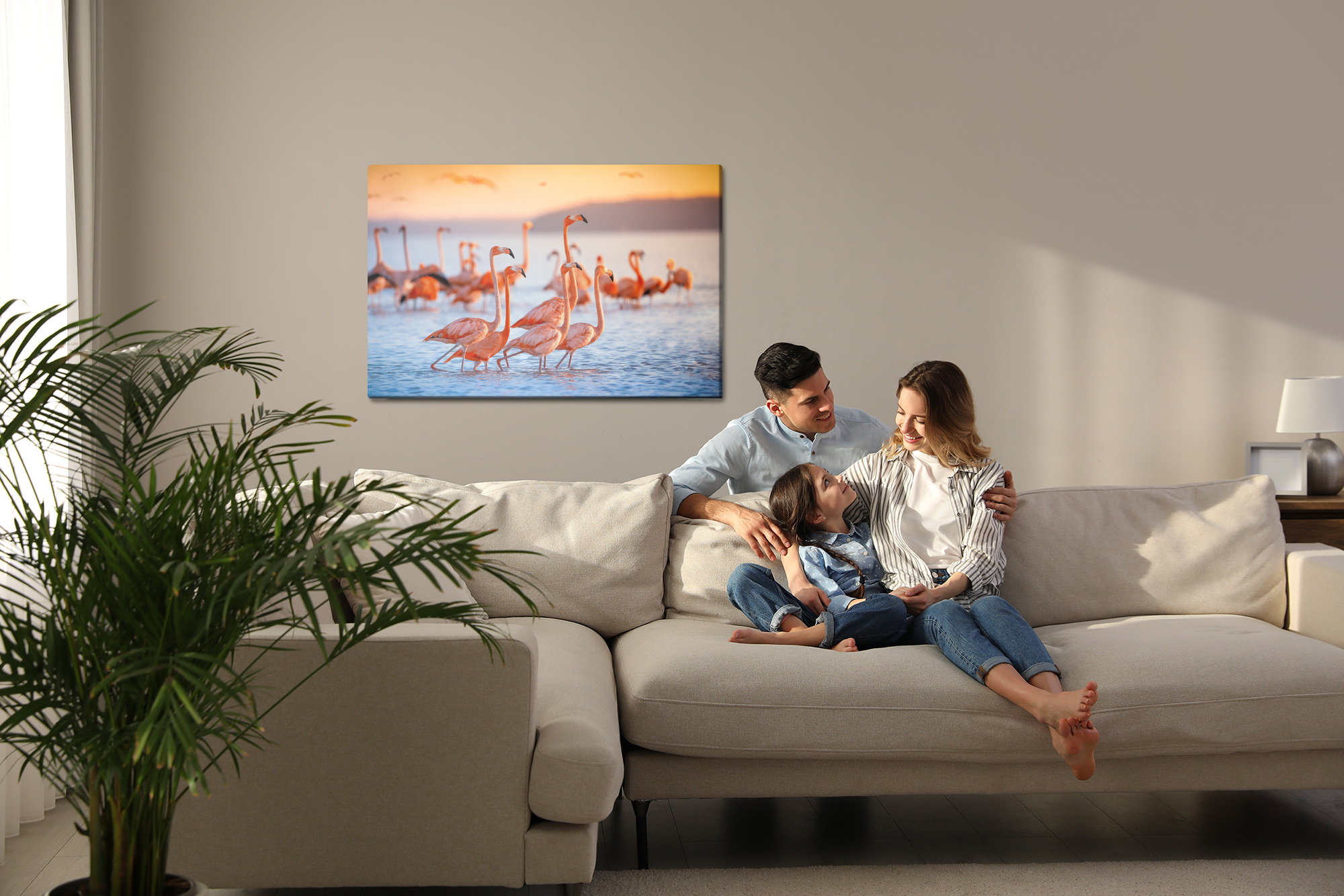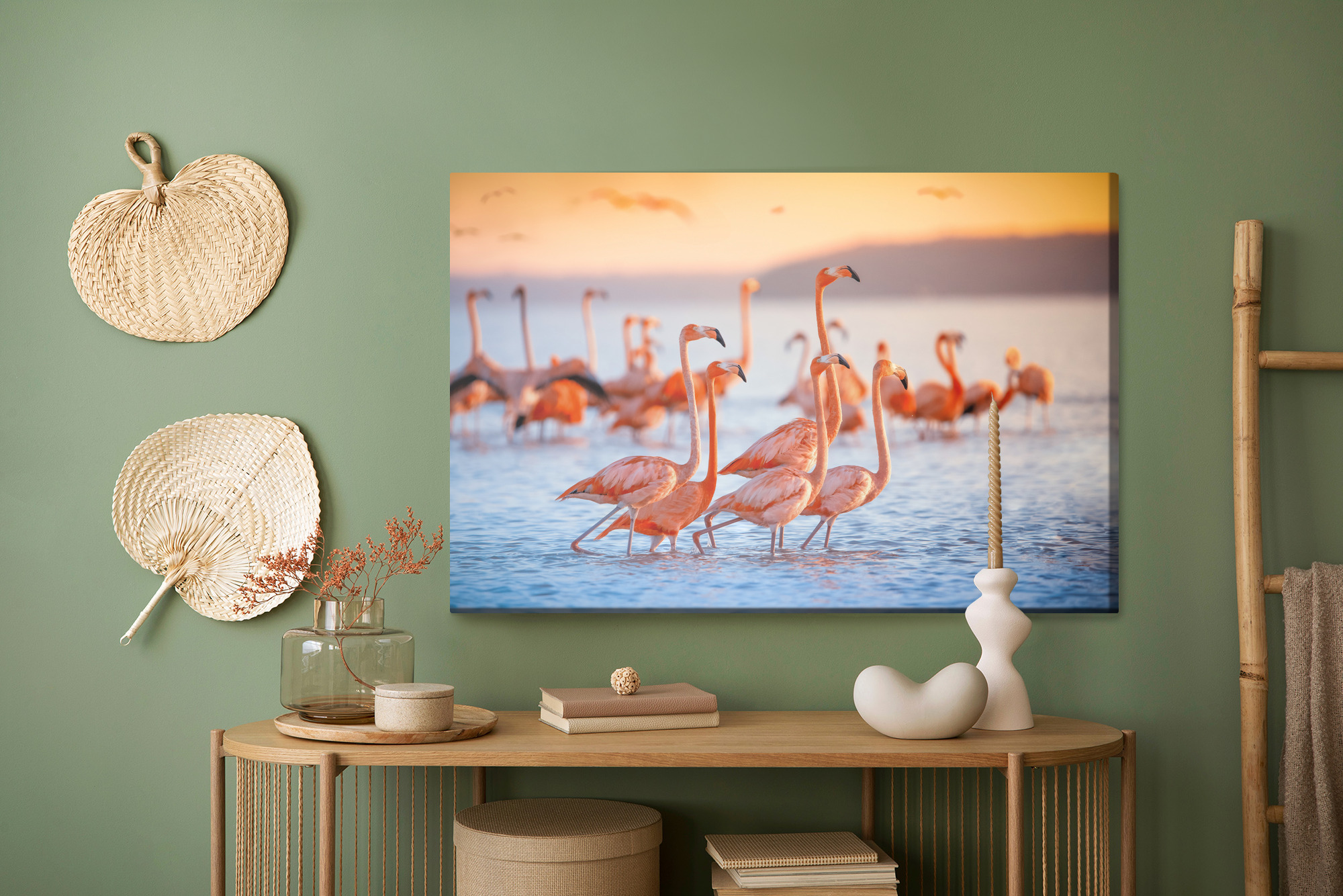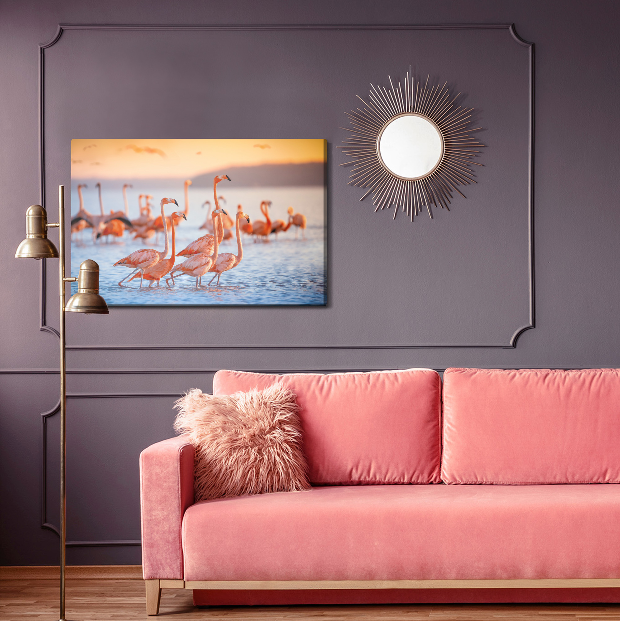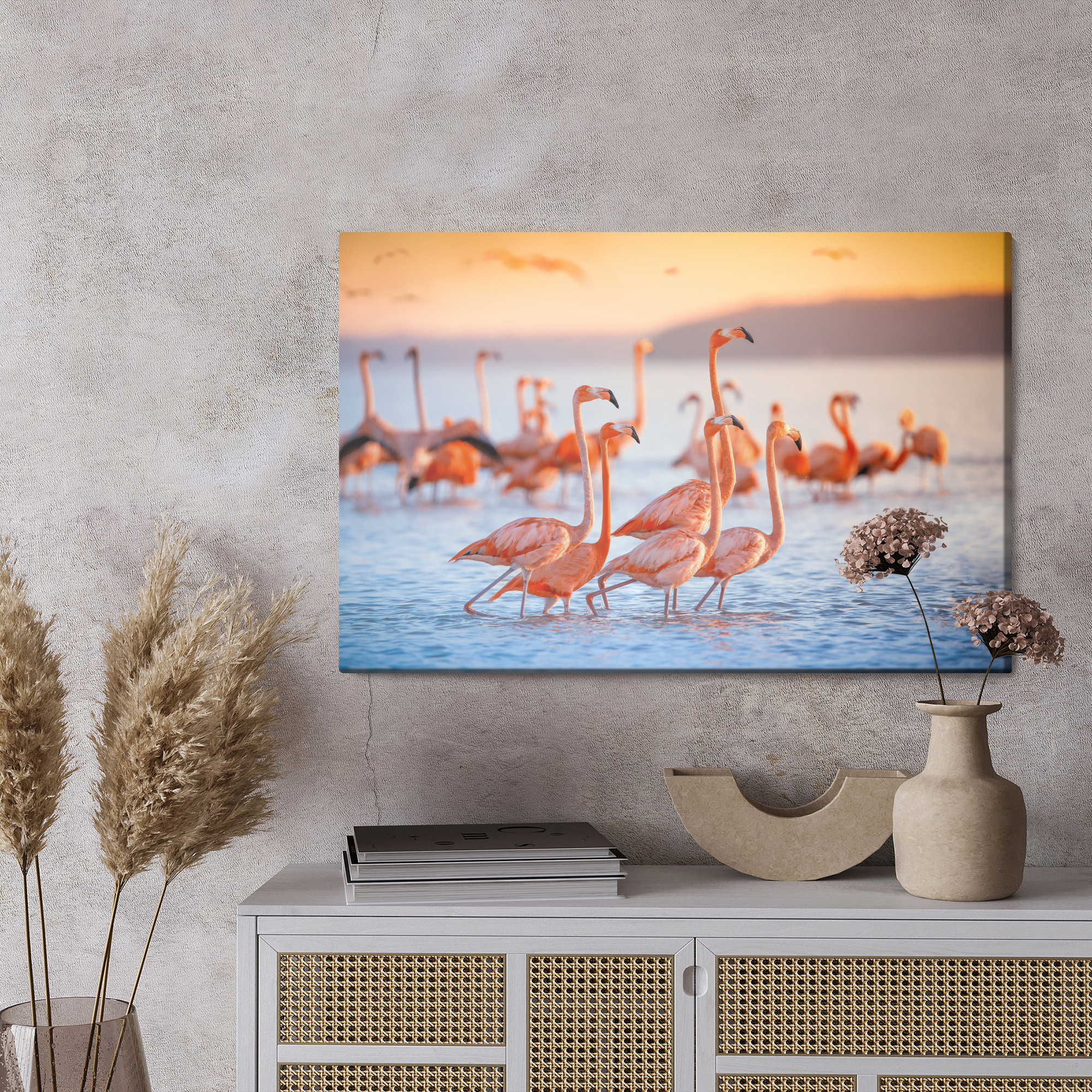 Ten obraz na płótnie przedstawia stado flamingów brodzących w spokojnej wodzie, skąpanych w ciepłym świetle zachodzącego słońca. Delikatne rozmycie tła podkreśla elegancję sylwetek i sprawia, że scena wygląda lekko, a jednocześnie przyciąga uwagę kolorem. To świetny wybór jako obraz do salonu, sypialni, przedpokoju, biura, hotelu lub restauracji, gdy chcesz dodać wnętrzu stylu i pozytywnej energii. Kolorystyka jest ciepła i nasycona: koralowe róże i pomarańcze łączą się z błękitami wody oraz złotą poświatą. Idealny akcent na ścianę dla miłośników natury i podróży.