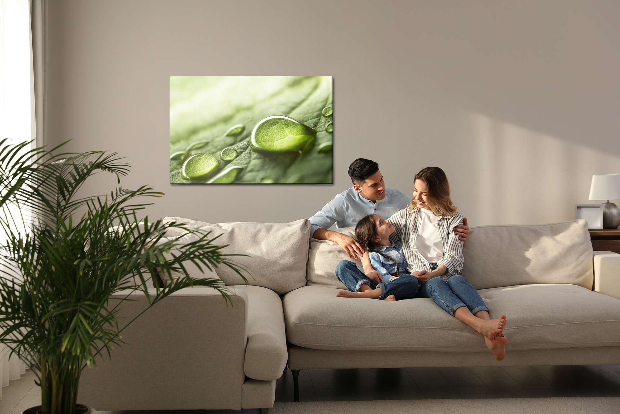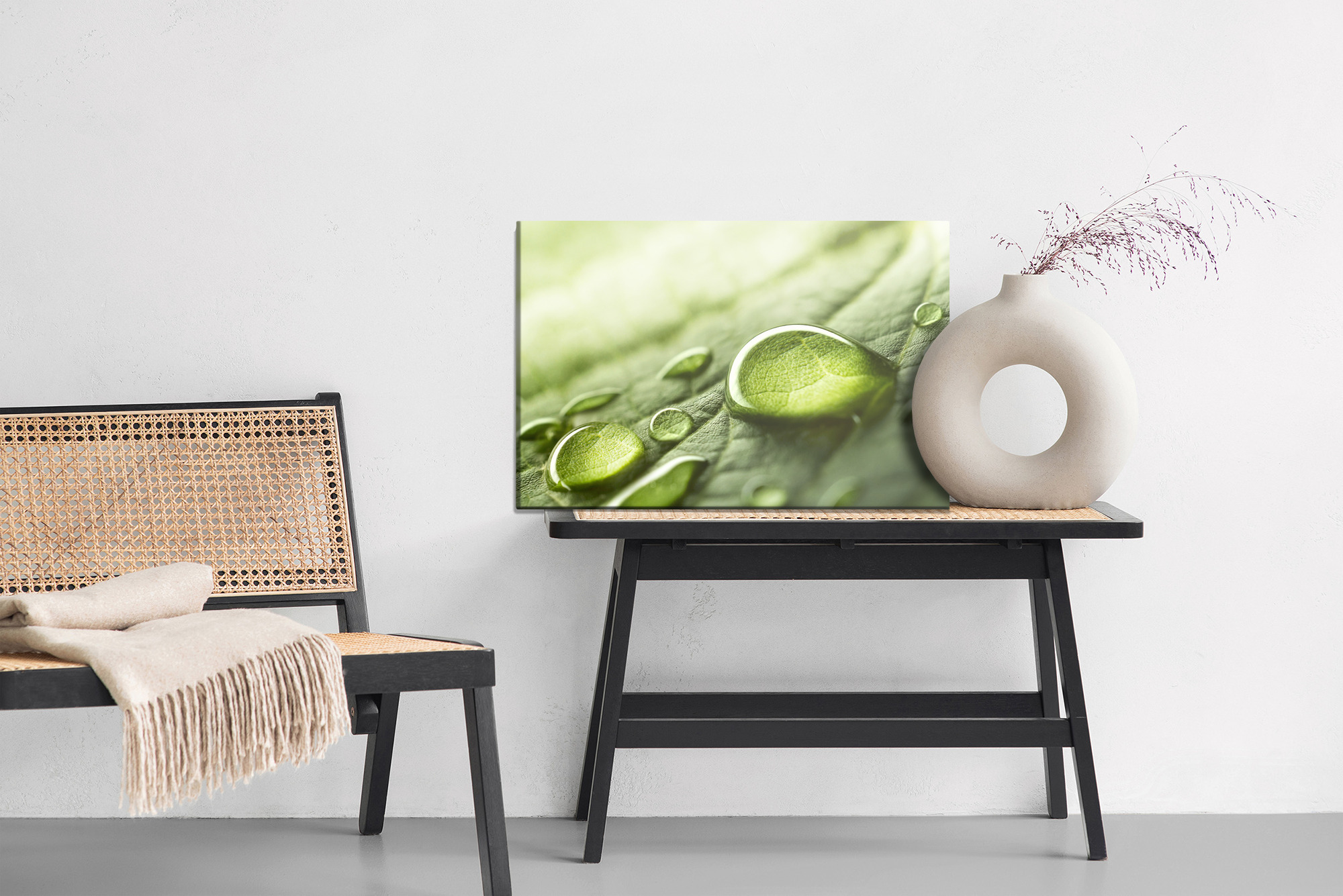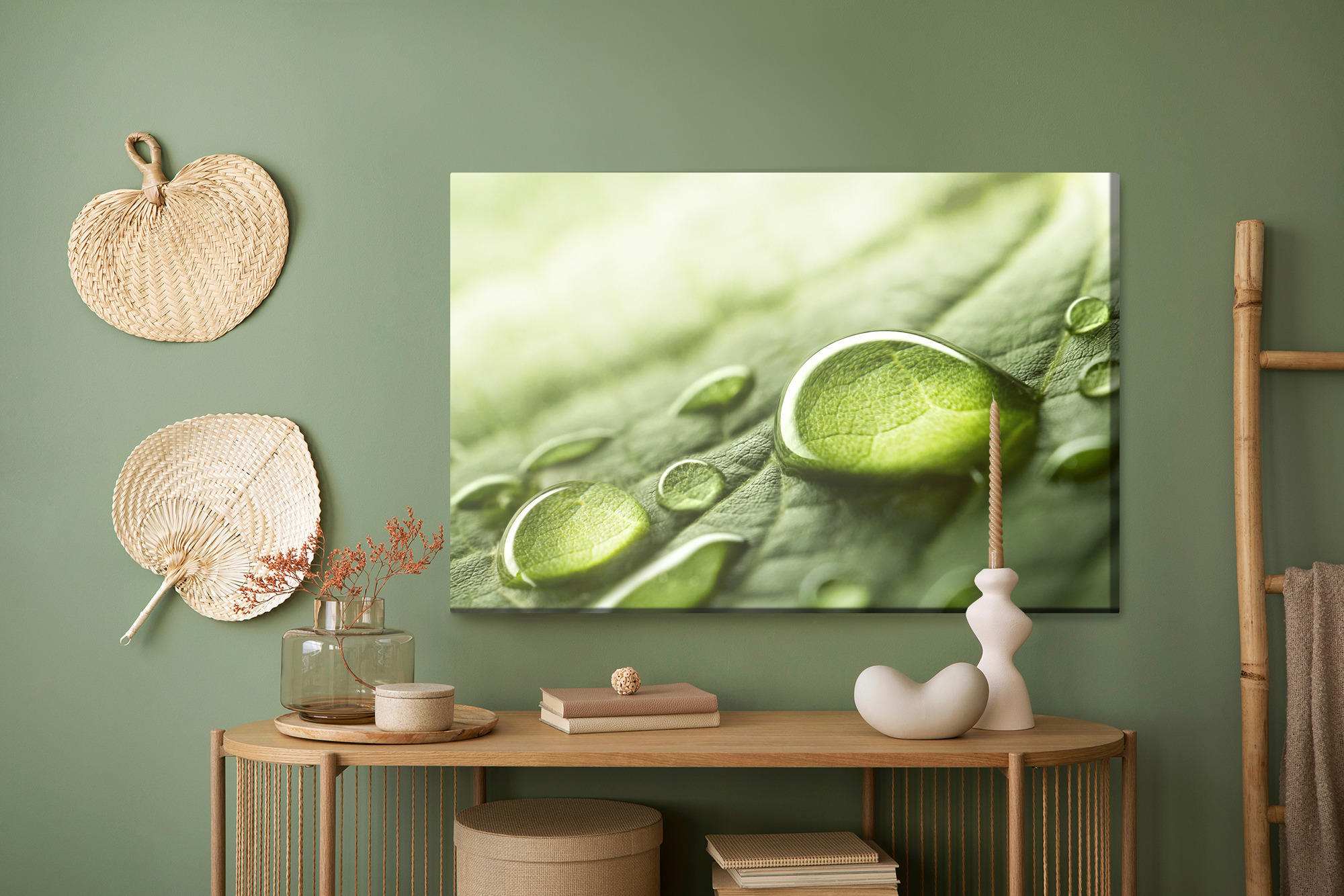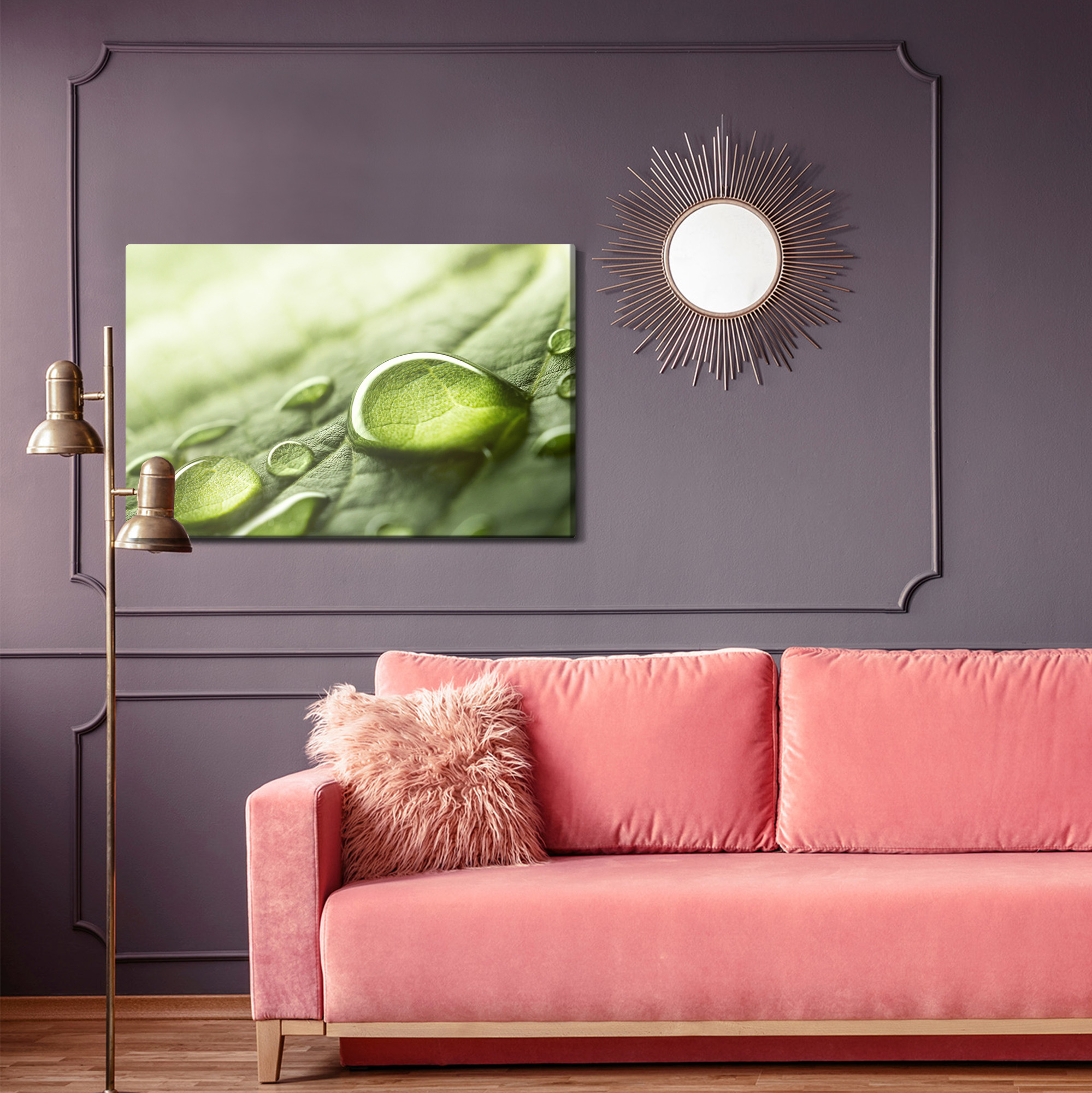 Wprowadź do wnętrza świeżość natury i kojący spokój. Ten obraz na płótnie pokazuje makro ujęcie zielonego liścia z lśniącymi kroplami wody, które pięknie łapią światło i tworzą wrażenie czystości oraz harmonii. Kolorystyka jest jasna i naturalna, oparta na odcieniach zieleni z delikatnymi, świetlistymi przejściami. To świetny wybór jako obraz do salonu, sypialni lub biura, a także do łazienki, hotelu czy przedpokoju, gdzie podkreśli wrażenie świeżości. Minimalistyczna forma i detal sprawiają, że pasuje do aranżacji nowoczesnych i skandynawskich.