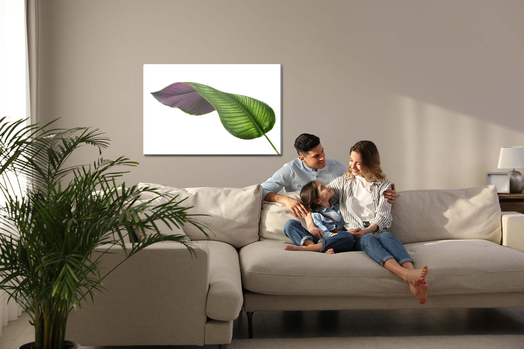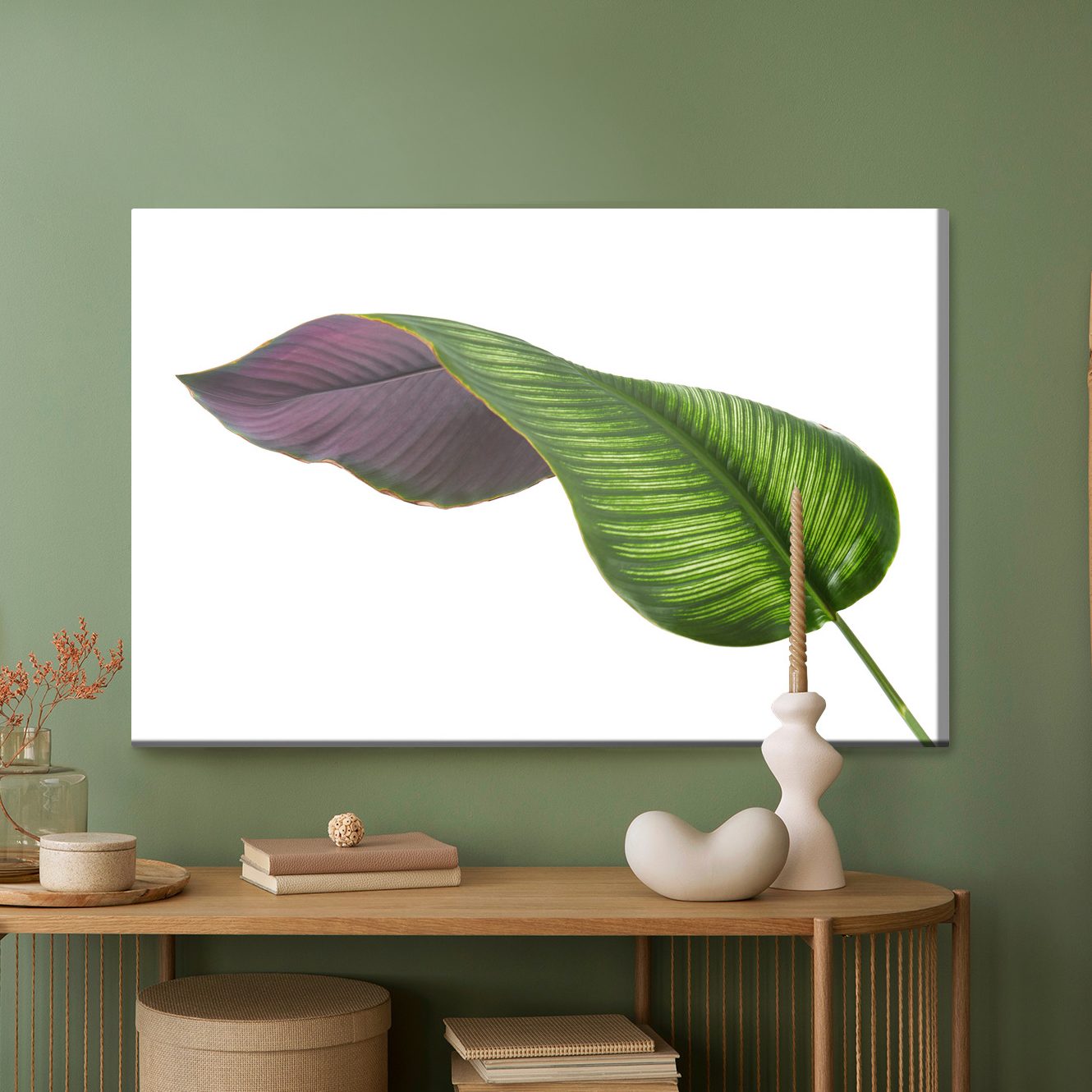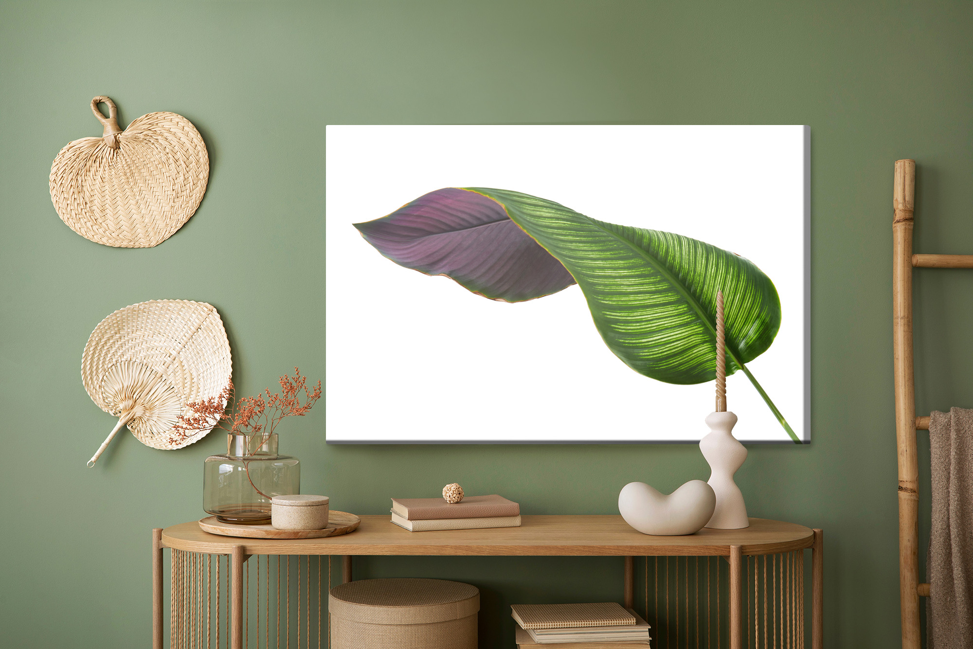 Dodaj wnętrzu spokój i odrobinę egzotycznej elegancji. Ten obraz na płótnie przedstawia pojedynczy, wyrazisty liść kalatei na jasnym tle, dzięki czemu wygląda lekko i nowocześnie, a jednocześnie przyciąga wzrok detalem. Kolorystyka jest świeża i harmonijna: soczysta zieleń z delikatnymi pasiastymi przejściami oraz głęboki fiolet po drugiej stronie liścia. Dekoracja świetnie pasuje jako obraz do salonu, sypialni i biura, a także do przedpokoju, hotelu czy łazienki, gdzie podkreśli naturalny charakter aranżacji. Idealny wybór do wnętrz minimalistycznych, skandynawskich i nowoczesnych.