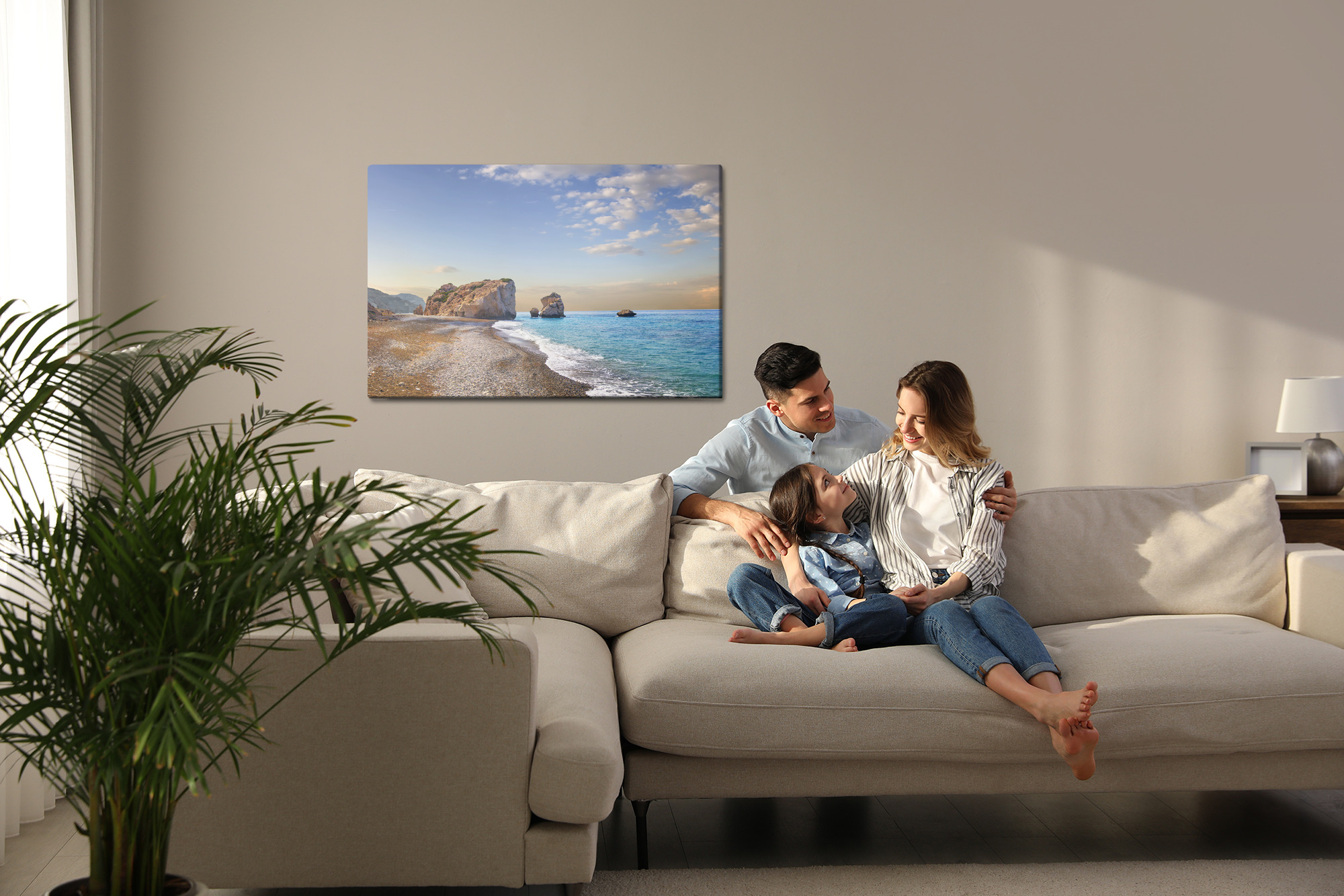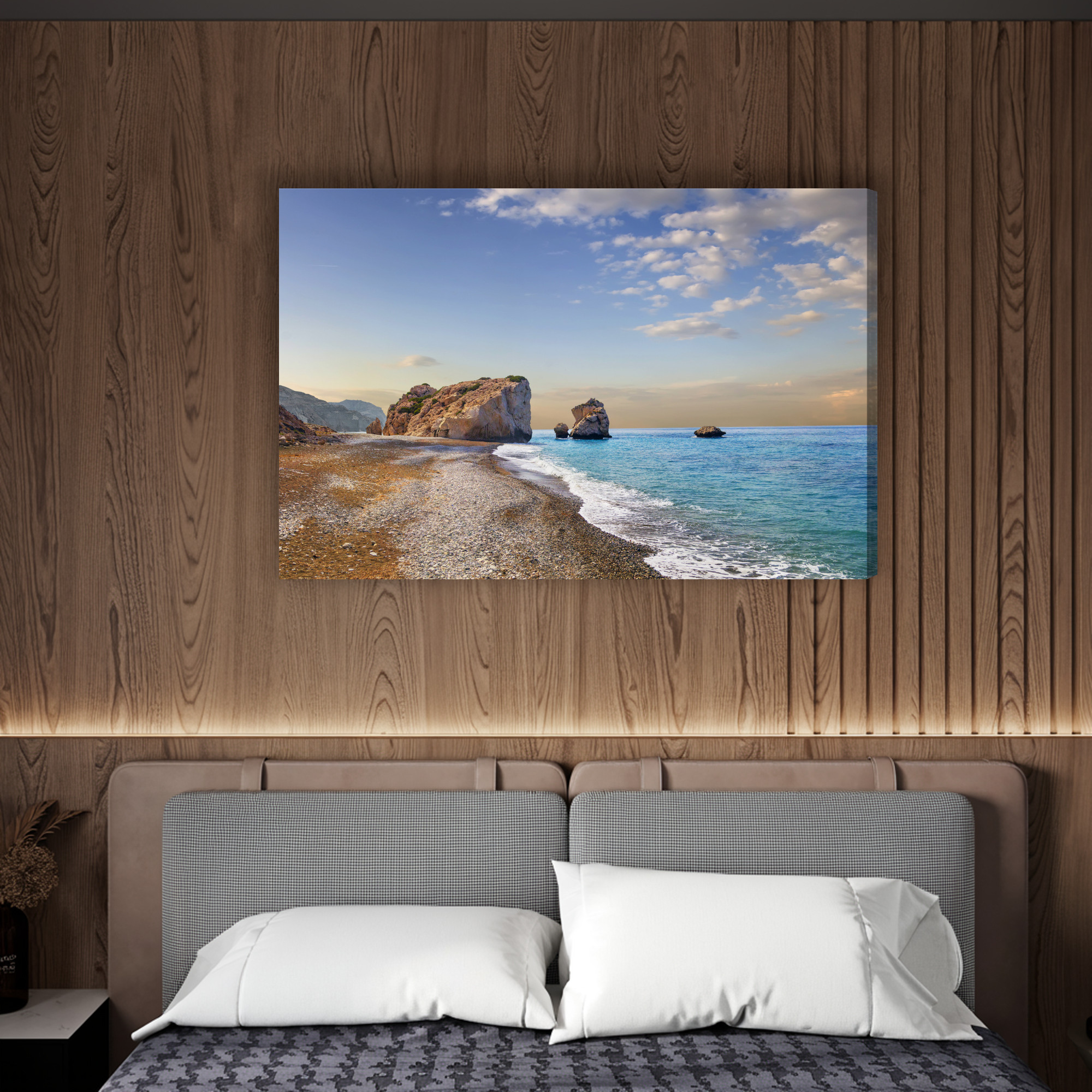 Wprowadź do wnętrza lekkość śródziemnomorskiego wybrzeża: łagodna linia plaży prowadzi wzrok ku monumentalnym skałom i spokojnemu, turkusowemu morzu. Ten obraz na płótnie dodaje przestrzeni oddechu i naturalnej elegancji, idealnie budując atmosferę relaksu. Jasna, naturalna paleta błękitów i turkusów, beżów piasku oraz szarości skał przełamana bielą fal i delikatnym, pastelowym niebem świetnie rozświetla ścianę. Sprawdzi się jako obraz do salonu, sypialni, biura, hotelu, restauracji lub przedpokoju, gdy szukasz nowoczesnych obrazów na ścianę z motywem morza.