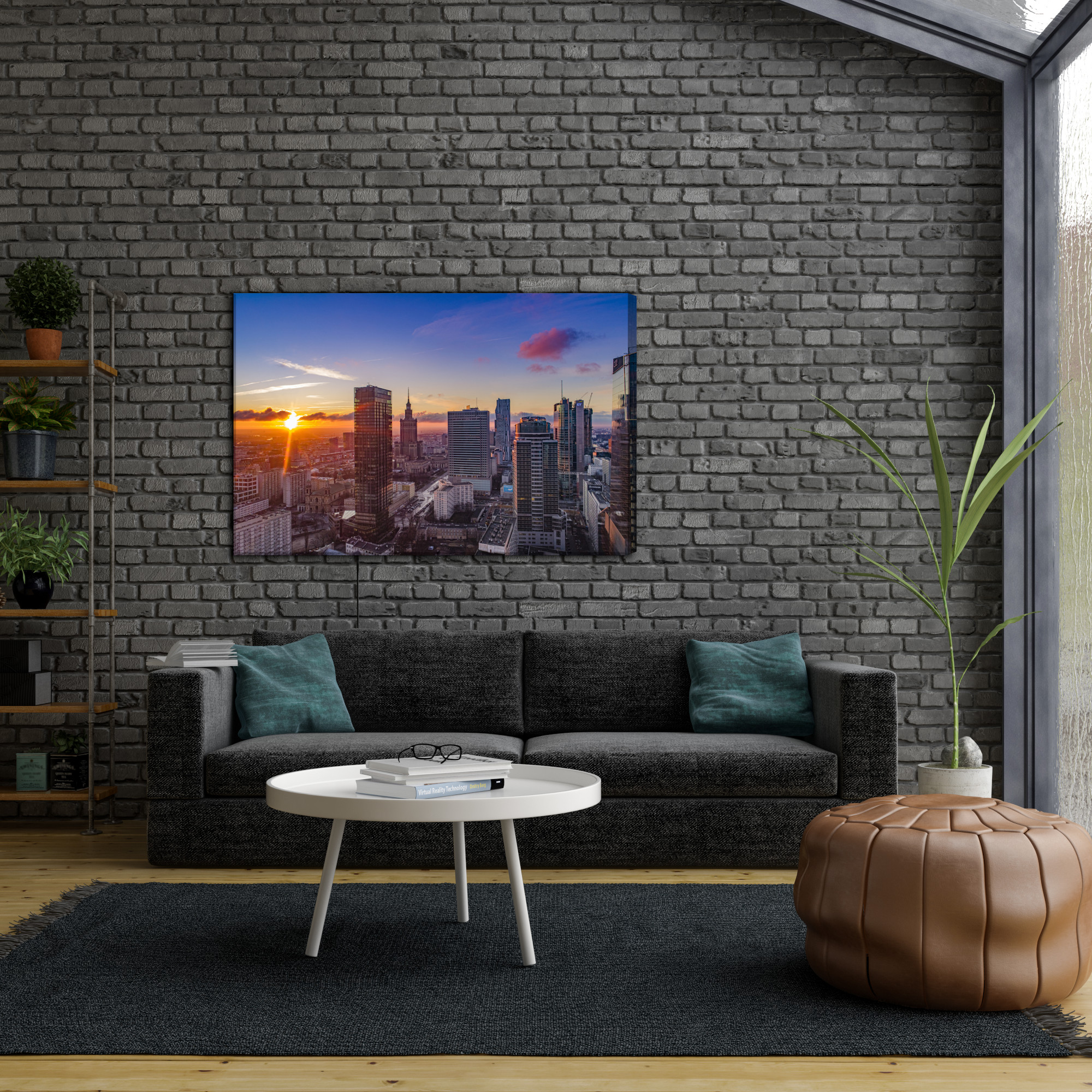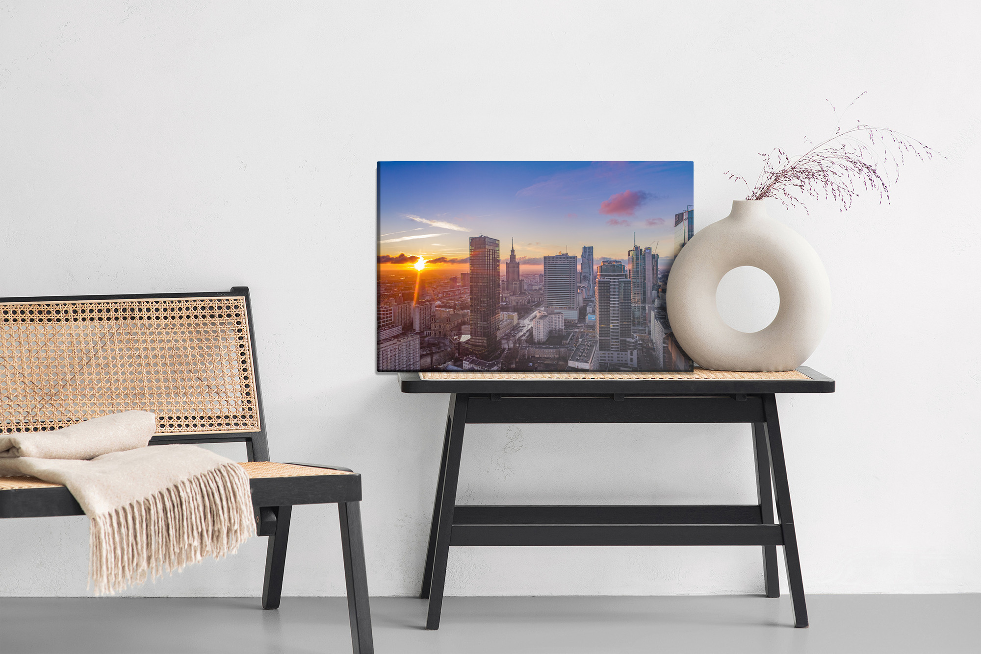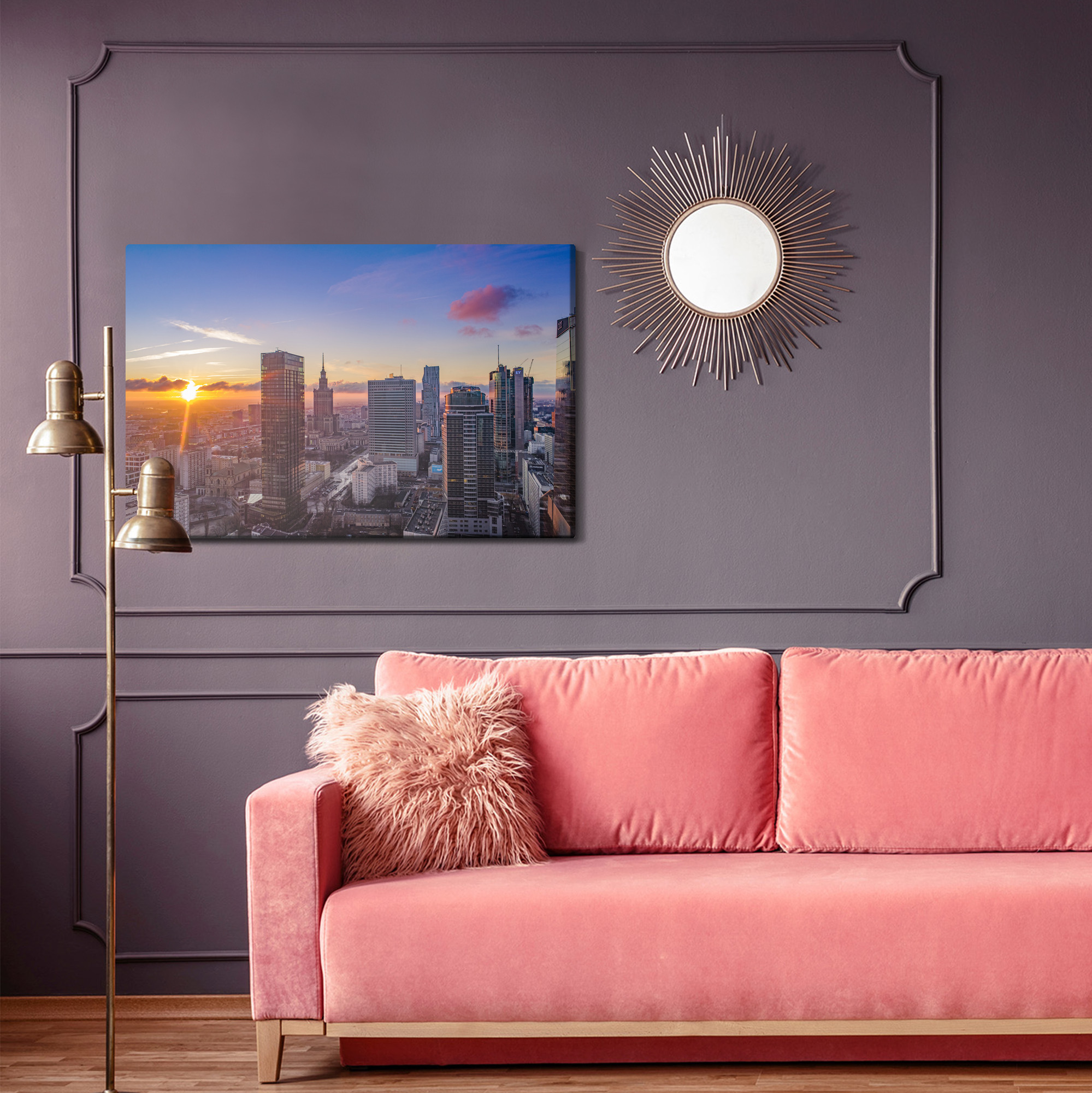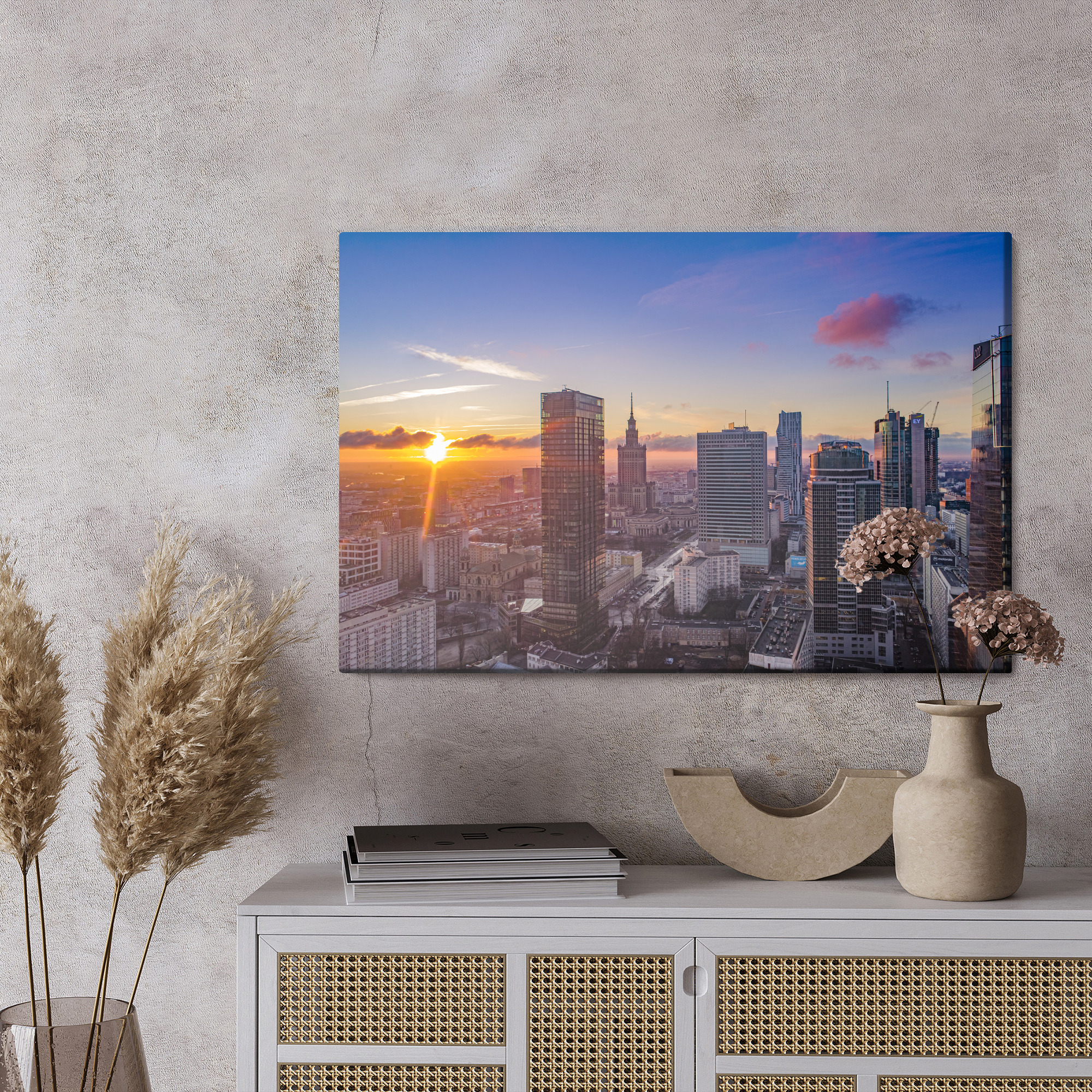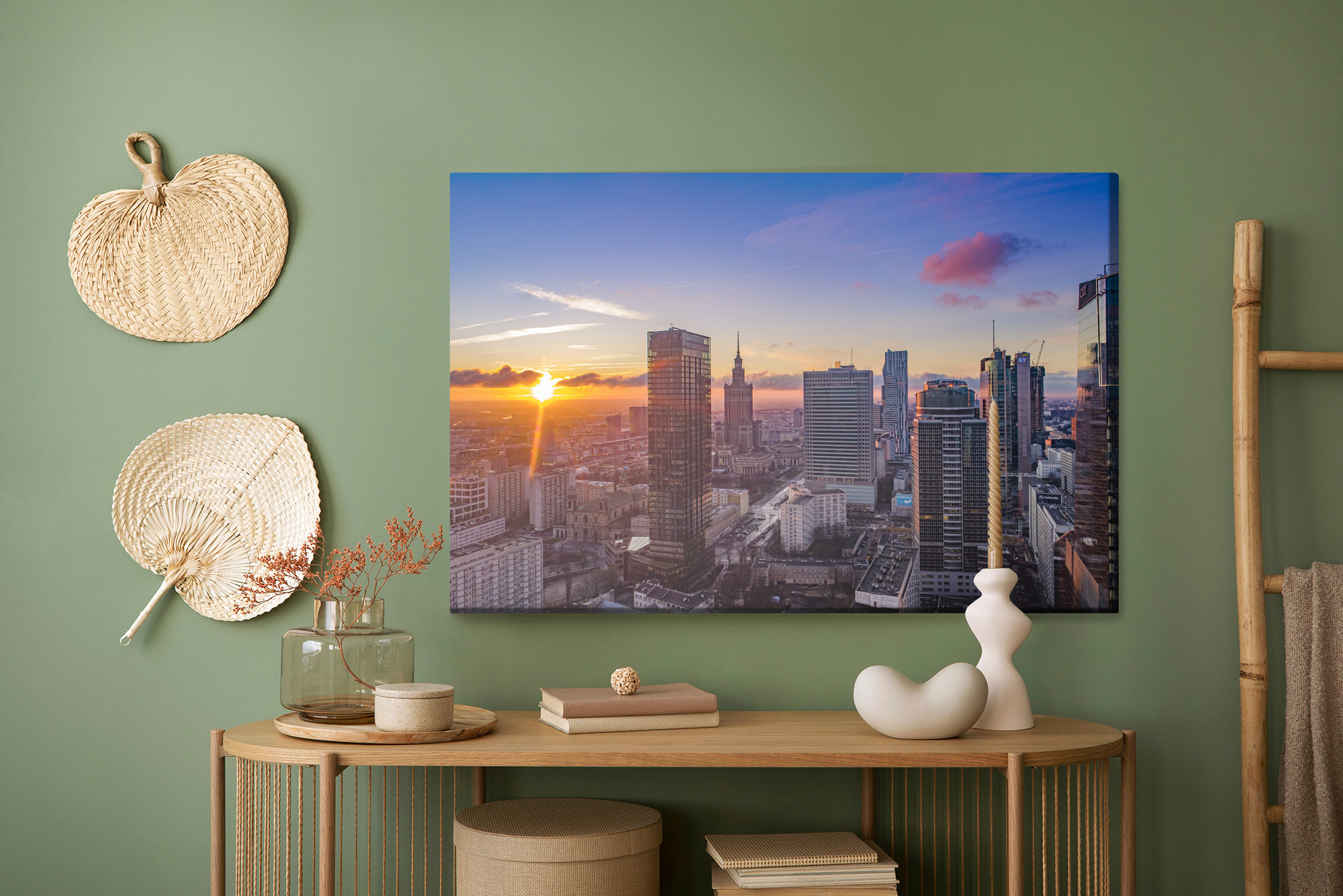 Fotografia przedstawiająca panoramę Warszawy o zachodzie słońca to obraz na płótnie, który wnosi do wnętrza wielkomiejski klimat i elegancką energię. Ciepłe złoto i pomarańcz zachodu łączą się z chłodnymi błękitami nieba oraz grafitową architekturą wieżowców, tworząc efektowny, kontrastowy układ kolorów. Ten obraz do salonu świetnie podkreśli nowoczesne aranżacje, a w biurze doda motywacji i profesjonalnego charakteru. Pasuje też do sypialni, przedpokoju, hotelu i restauracji jako wyrazista grafika na ścianie dla miłośników miast.