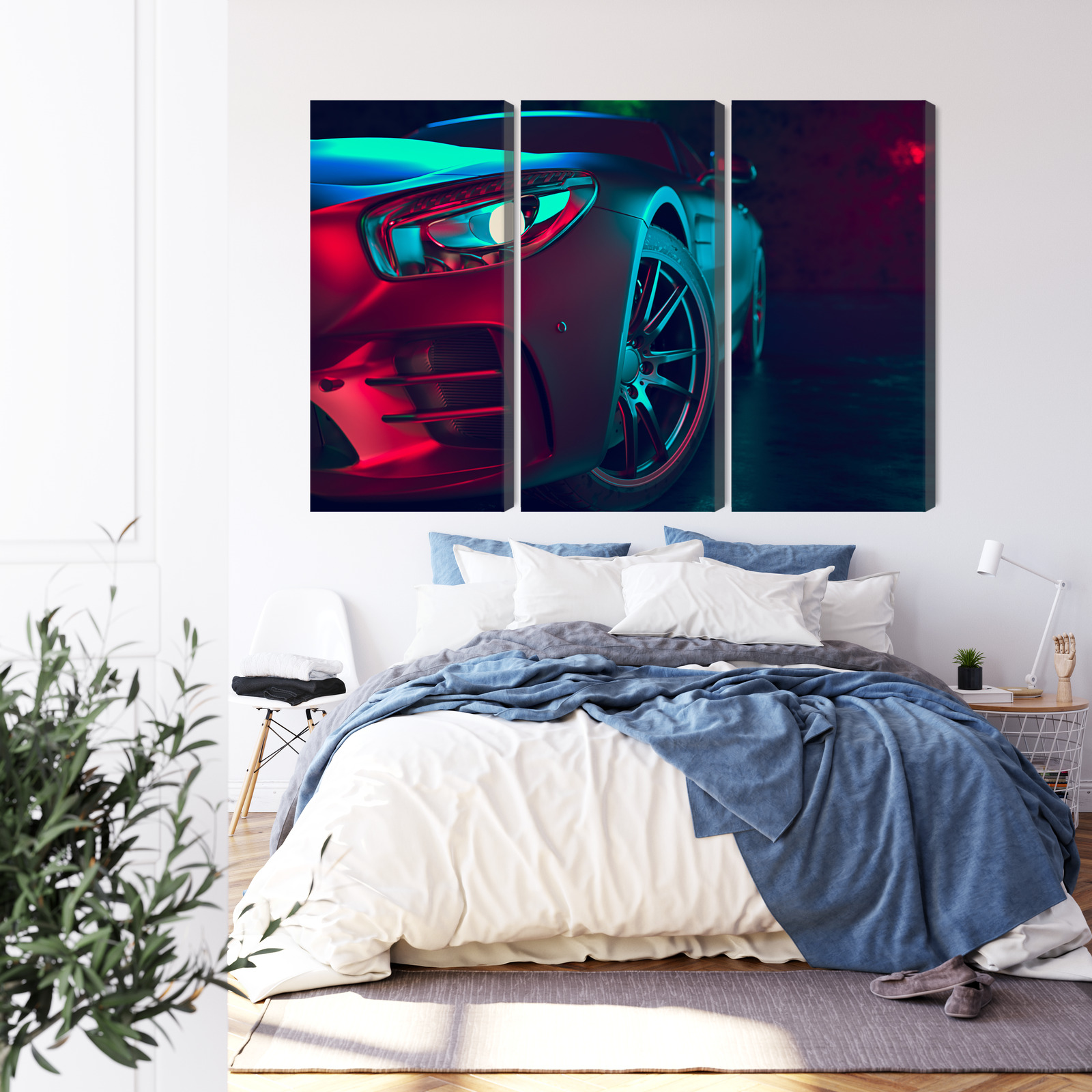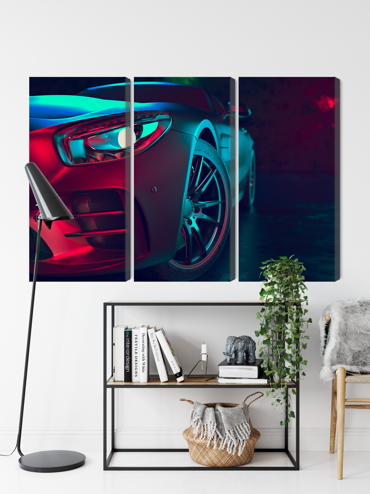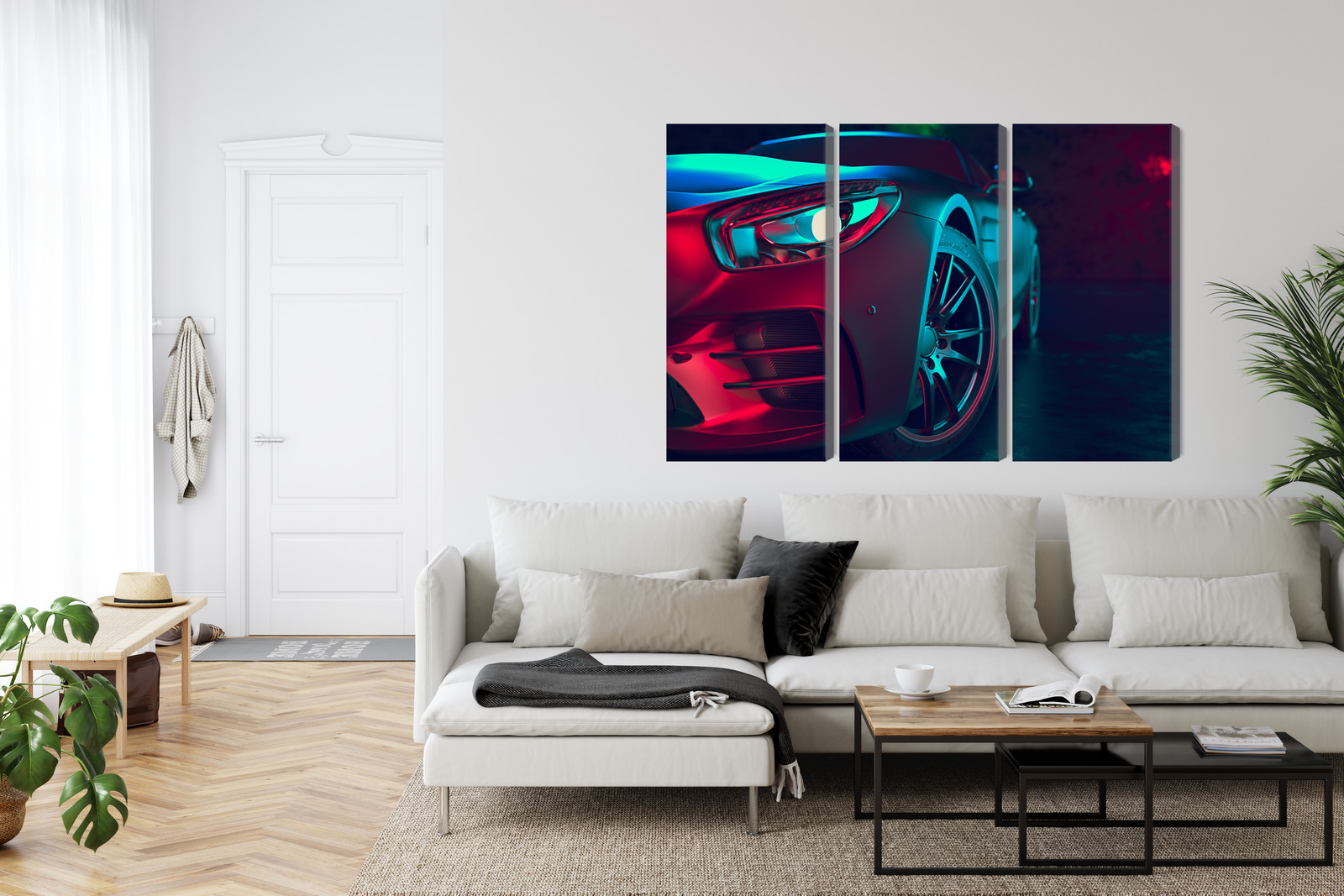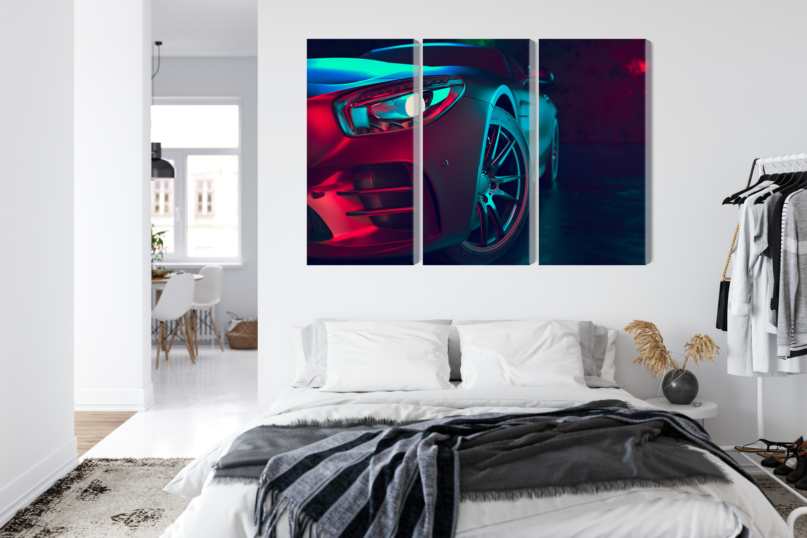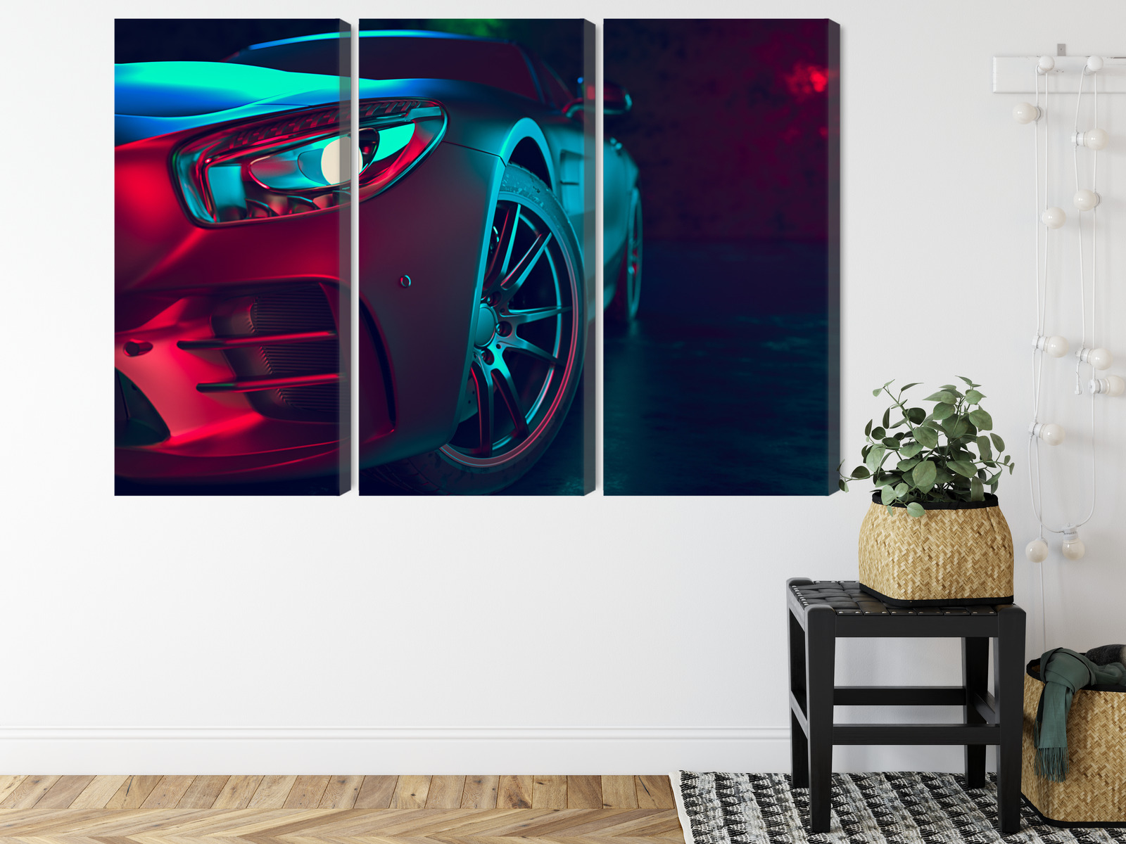 This triptych is a modern, urban frame filled with bold light. Across three panels you see a close-up of the front of a sports car: the headlight line, a solid bumper, and the wheel detail that together create a dynamic, cinematic scene. The real impact comes from the neon glow—pink-red and turquoise light reflects off the bodywork, highlighting the shapes and giving the artwork a night-city mood. The triptych layout keeps the composition balanced: the left panel focuses on the front, the center builds depth with the wheel detail, and the right leaves more space with a softly blurred background, making the wall art feel light and very contemporary.
