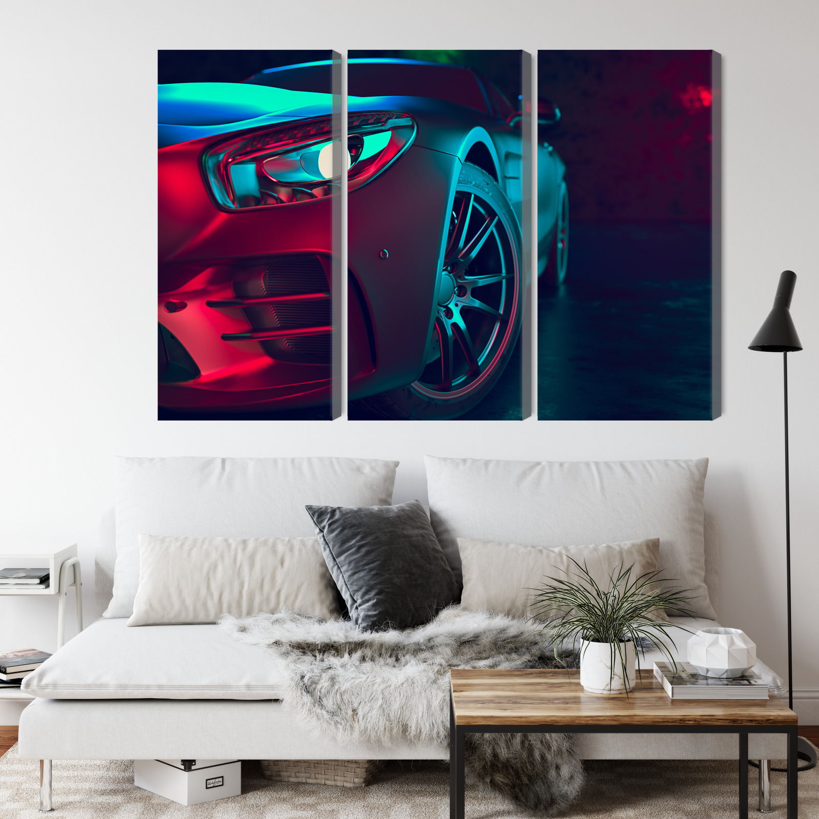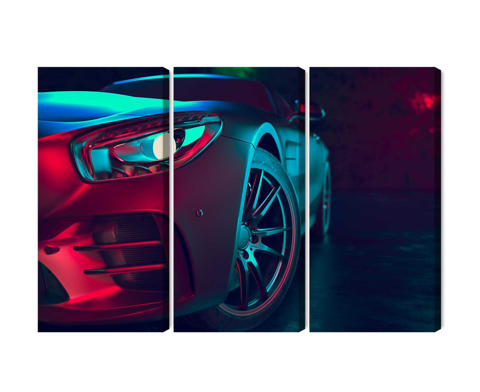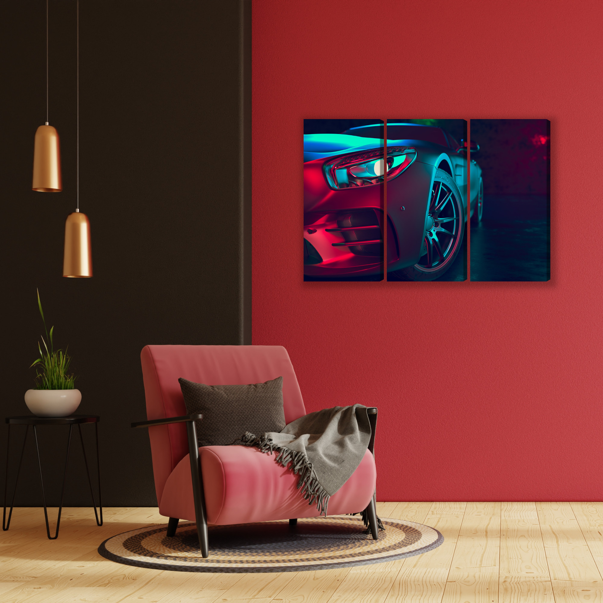 Car in Neon Lights – Triptych Canvas Wall Art for Living Room