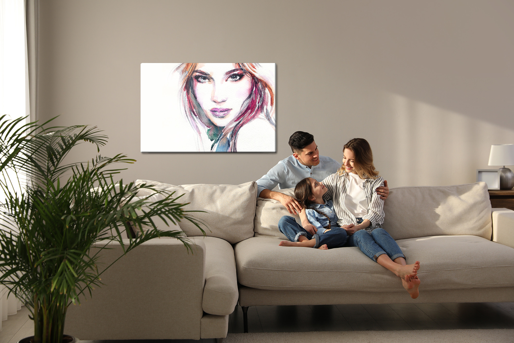 If you’re searching for elegant living room wall art or more unusual statement pieces, this portrait is a strong yet still refined choice. Modern wall art with a feminine face creates a clear focal point while staying timeless. It’s a beautiful canvas piece that gives the space character, brightens the room, and makes your wall décor feel truly expressive.