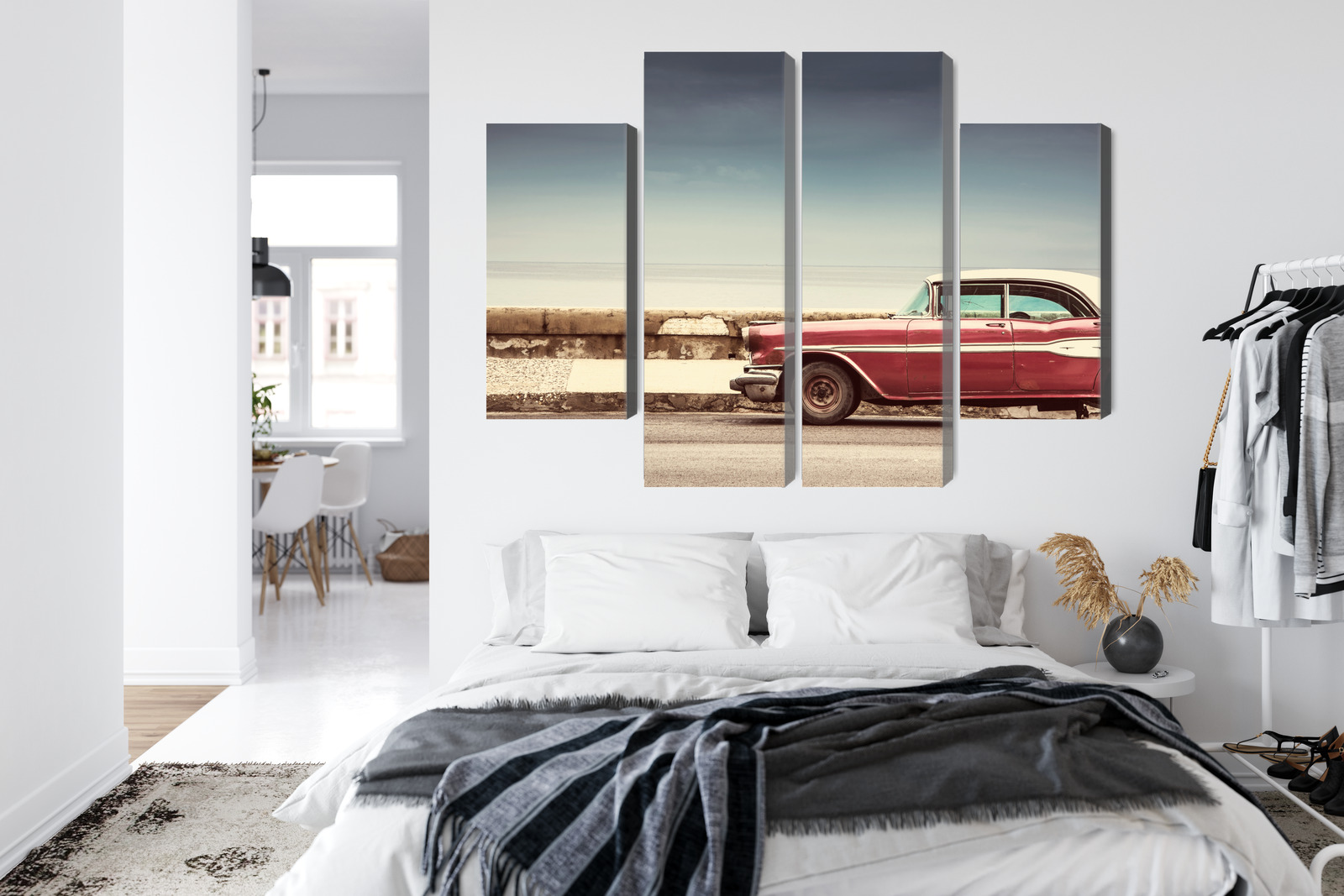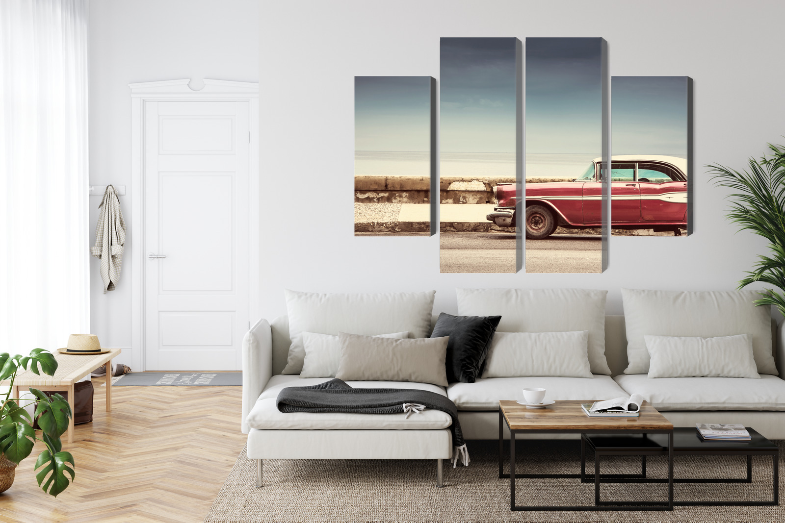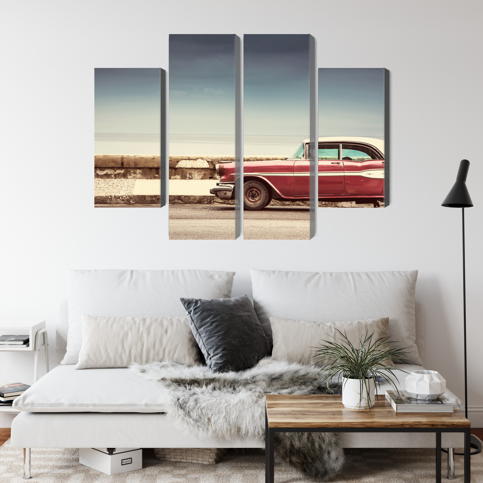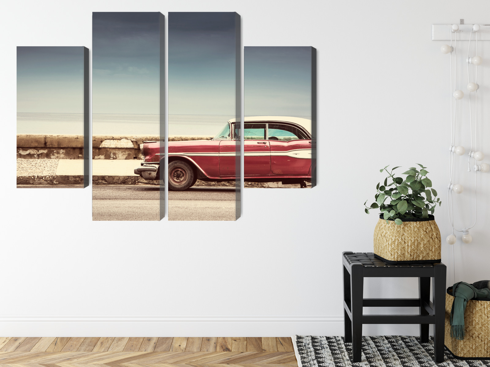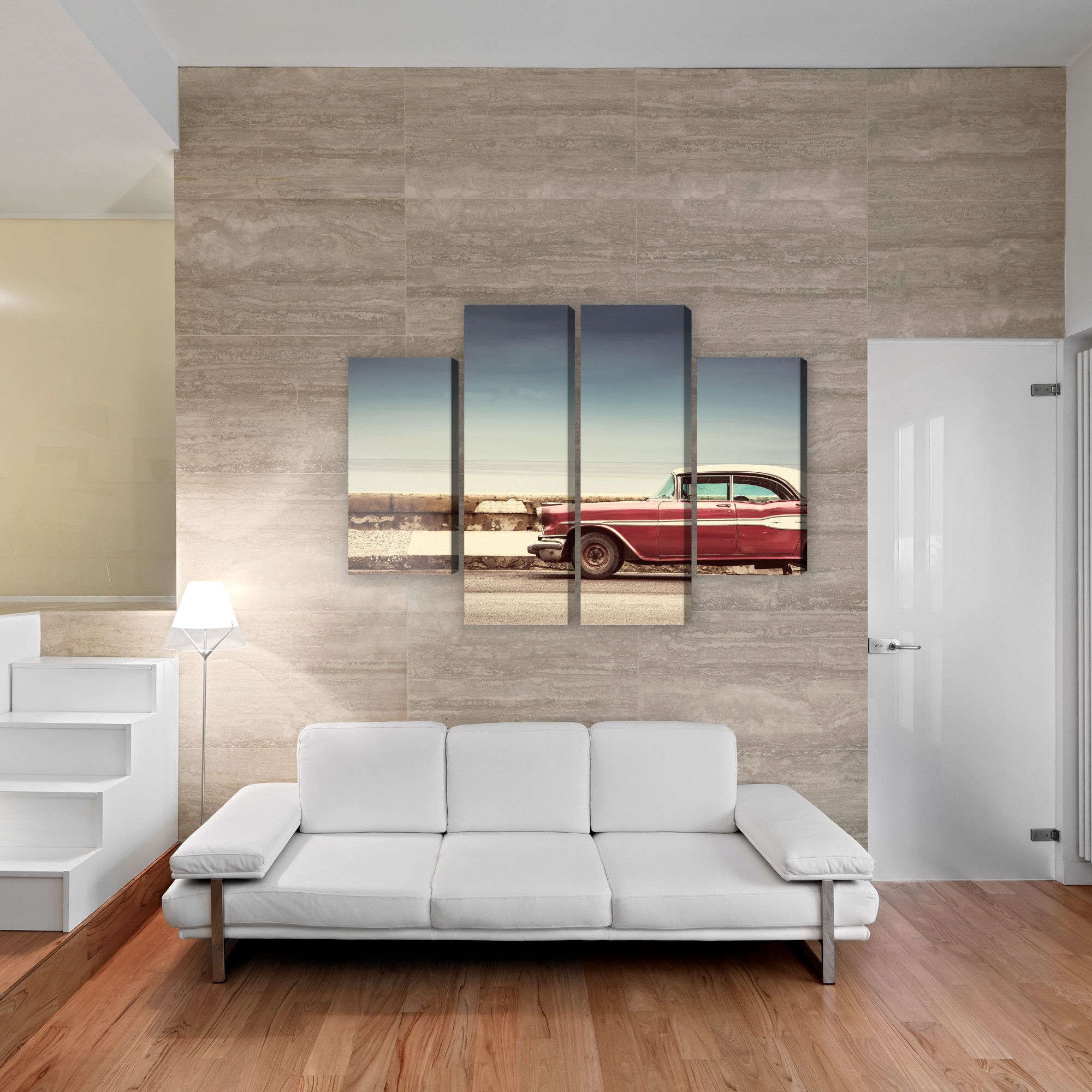 This four-panel canvas wall art brings a retro vibe straight to your wall. The scene shows a classic red car parked by a seaside wall – a calm view with a wide horizon and soft light that feels like travel and summer ease. The composition is minimal yet very stylish: plenty of open space in the sky and sea balances the stronger accent of the car, while the four-panel layout adds a modern rhythm and a gallery-like effect.