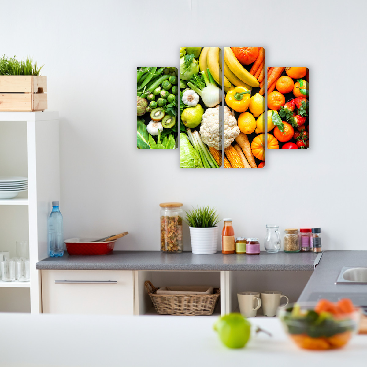 This four-panel canvas wall art is an explosion of freshness and color that instantly brightens an interior. The composition looks like a perfectly arranged basket of seasonal ingredients: green vegetables and kiwi, pale cauliflower, corn, citrus, bananas, and juicy reds of strawberries and tomatoes. The four-panel layout adds lightness and rhythm—each section has its own “flavor”, yet together they create one cohesive, appetizing scene. It’s wall art that fits naturally where everyday life happens: cooking, gathering, and shared meals.