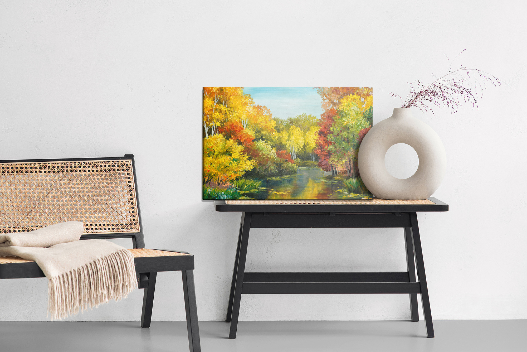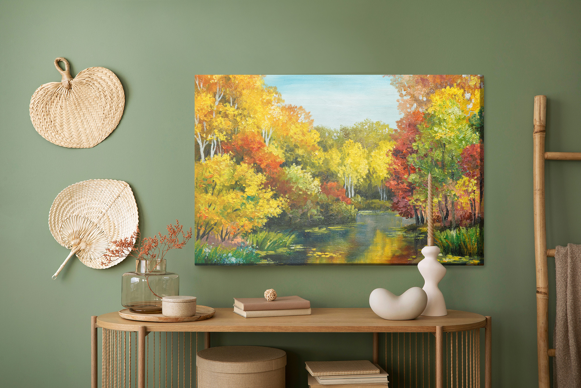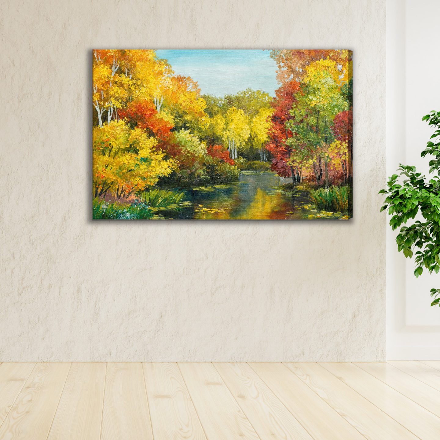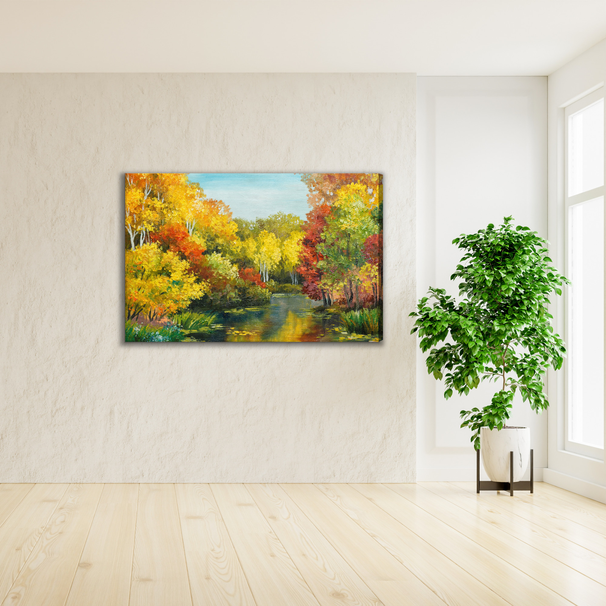 Woodland silence, warm light, and still water – this artistic canvas print takes you to a place where autumn feels at its most beautiful. The composition draws the eye into the landscape: on both sides of the pond, dense trees rise with crowns glowing in shades of gold, yellow, orange, and deep red. In the foreground, the painterly texture is clearly visible, along with fresh green accents of grasses and plants along the shore that balance the intense autumn foliage. The water reflects the colors of the trees and sky, creating a natural, harmonious contrast where warm autumn tones meet cooler blues and muted greens. Thanks to this balance, the wall art brings energy to the room while remaining calm and soothing.