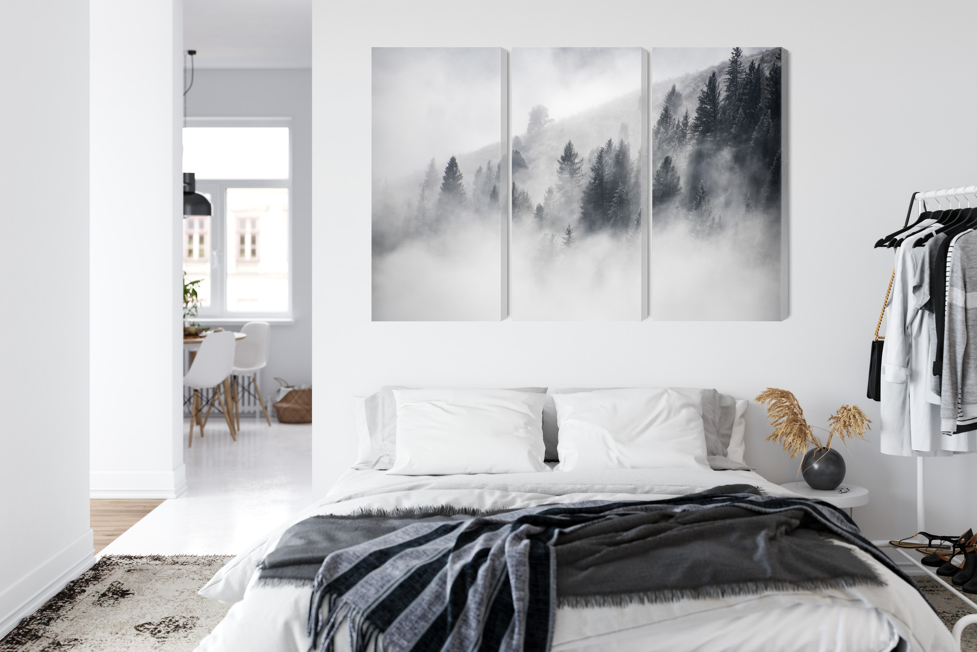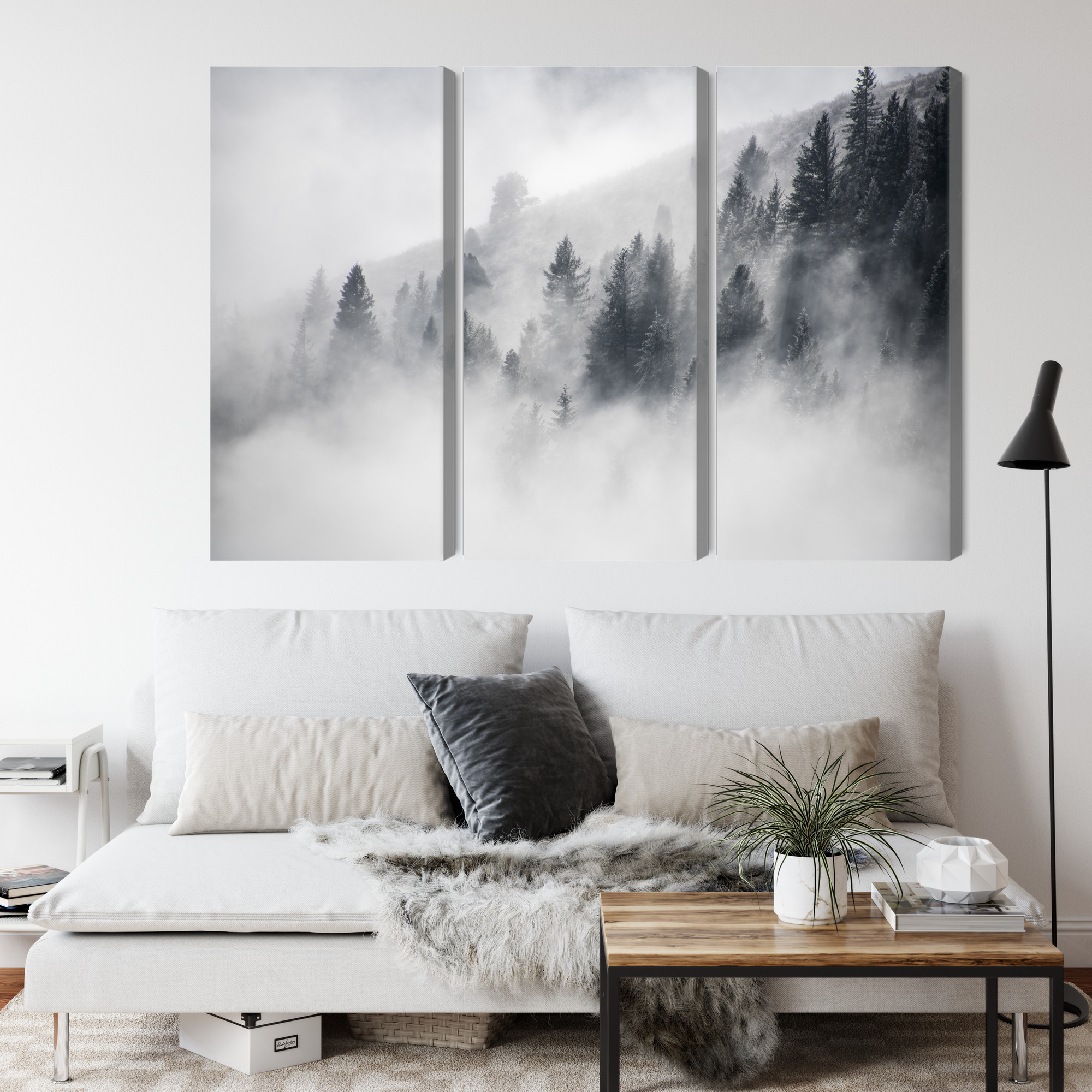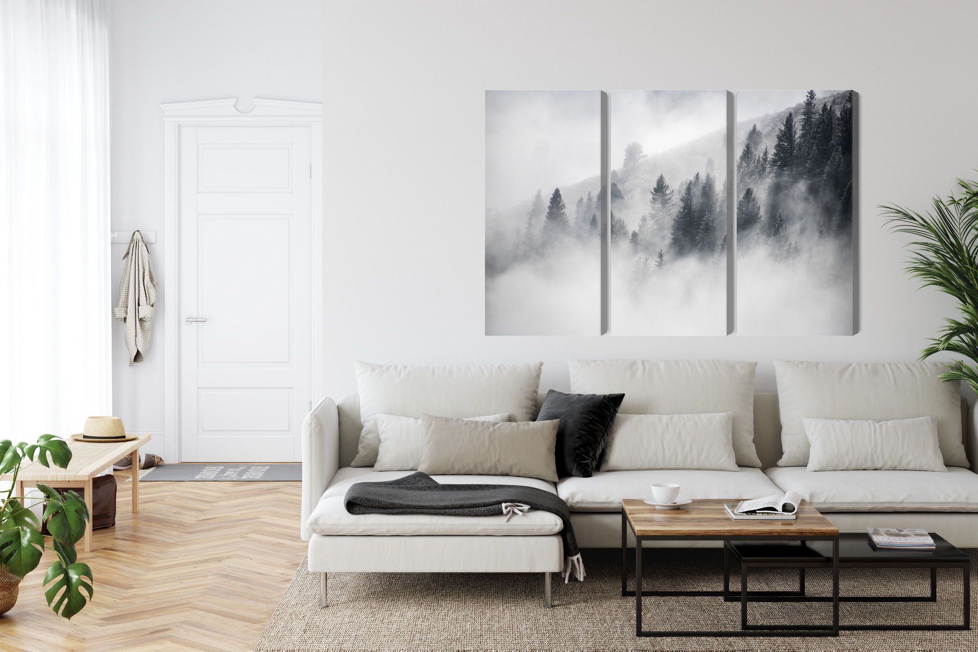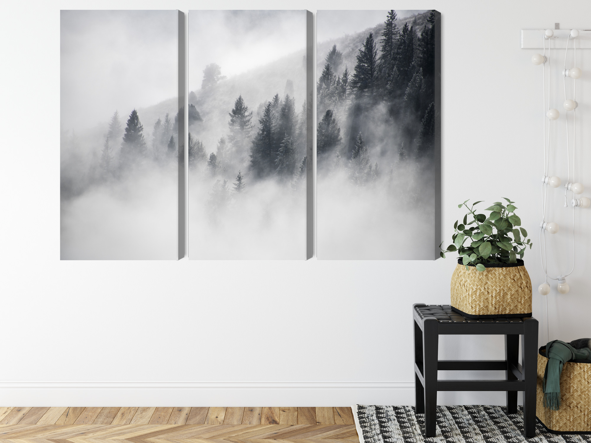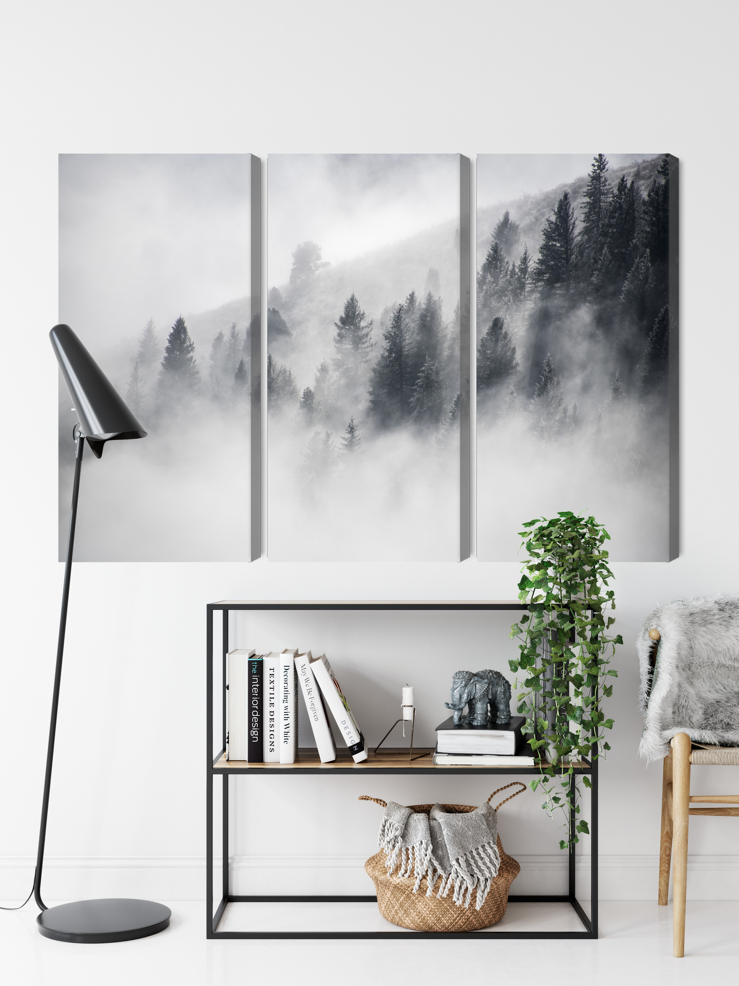 Some artworks calm a room the moment you look at them. This three-panel canvas wall art shows a mountain conifer forest wrapped in dense mist—like a quiet pause among the trees, when everything feels softer and slower. The triptych format creates a strong sense of depth: across the panels, layered slopes and spruce silhouettes emerge from the white haze, while gentle tonal transitions guide the eye upward, as if toward cool morning air. It’s wall art that doesn’t overpower the space, but gives it character and a feeling of order.