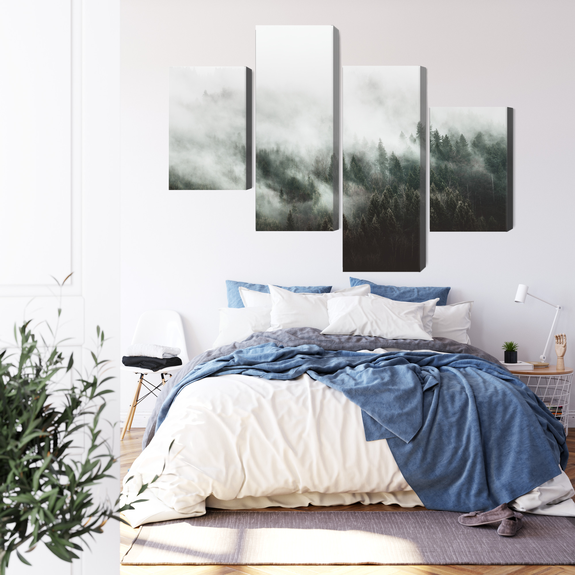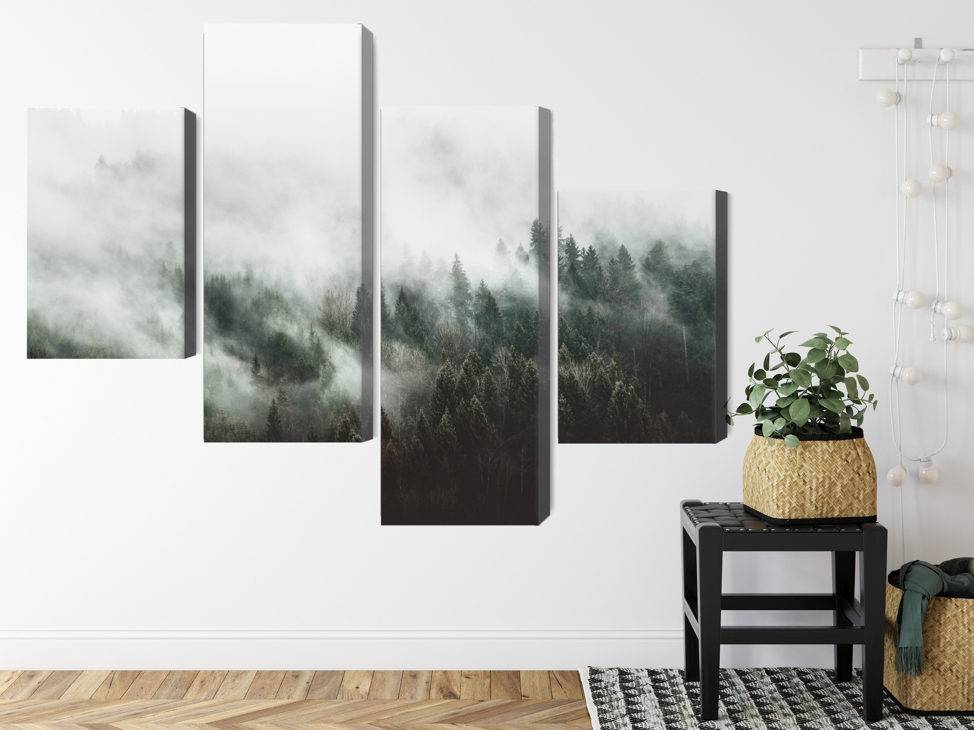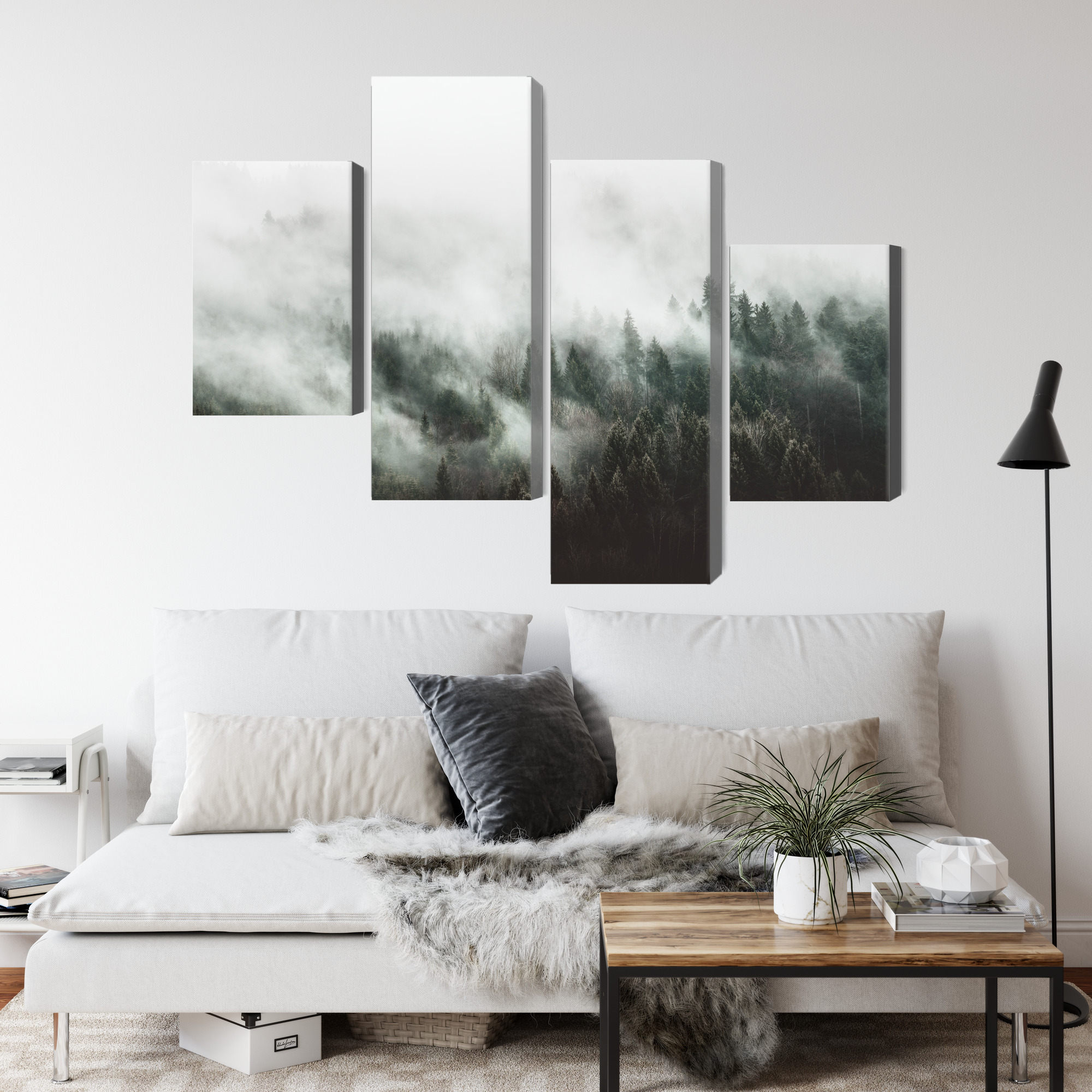 This four-panel canvas wall art brings a calm feeling you can sense in the room right away. It shows a conifer forest wrapped in dense mist—soft layers of white and grey blend into darker treetops, creating an atmospheric, “breathing” landscape. The four-part layout adds lightness and depth: your eyes move through successive planes, and the whole piece feels like a wide view taken from a mountain walk or a quiet forest morning. It’s wall art that doesn’t need strong colors to stand out—it works through mood and simplicity.