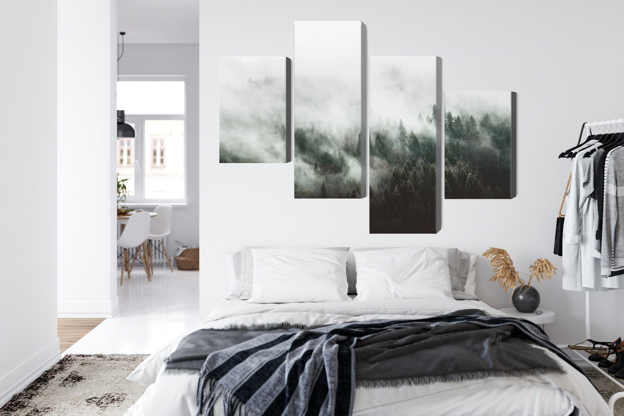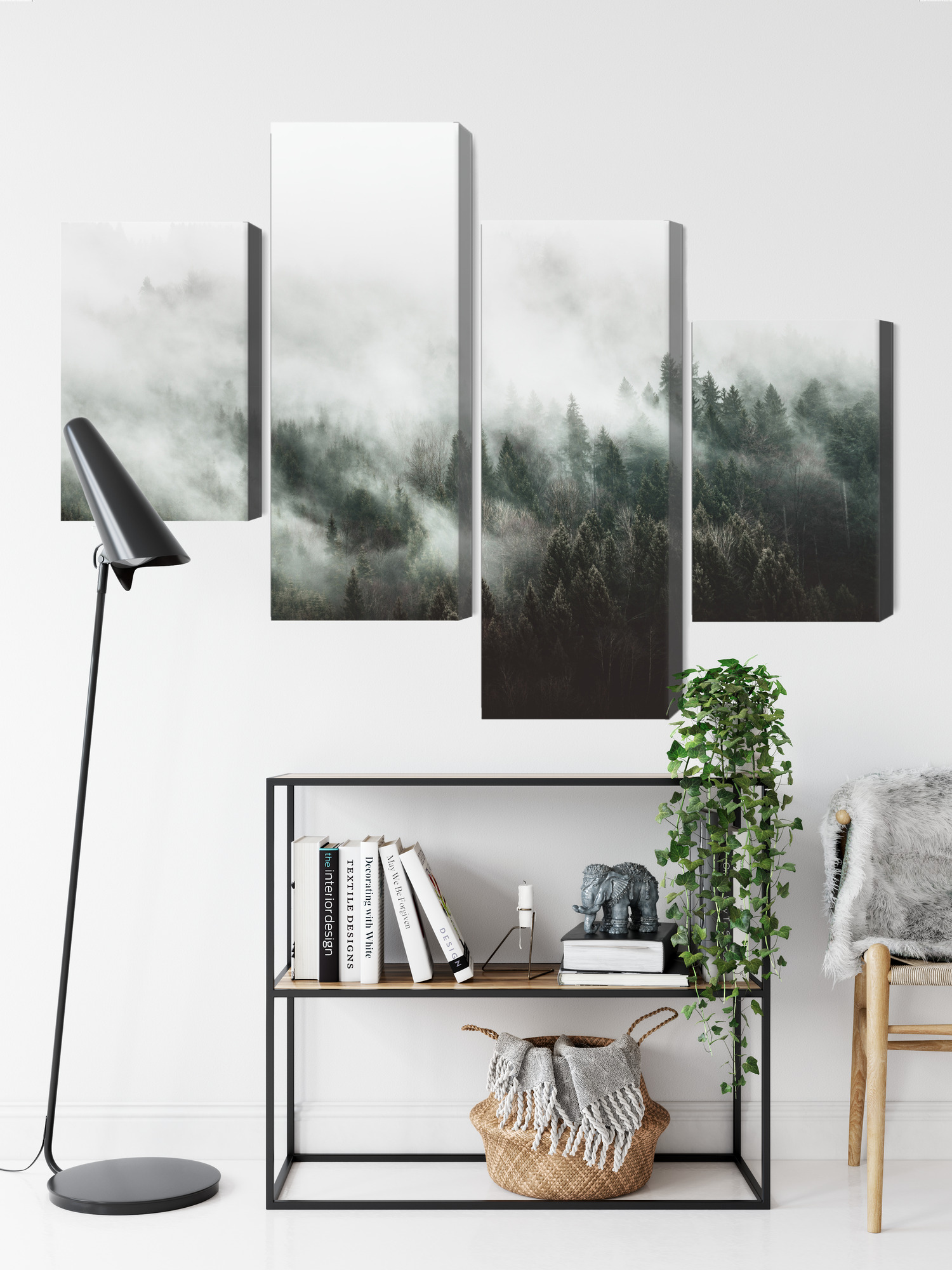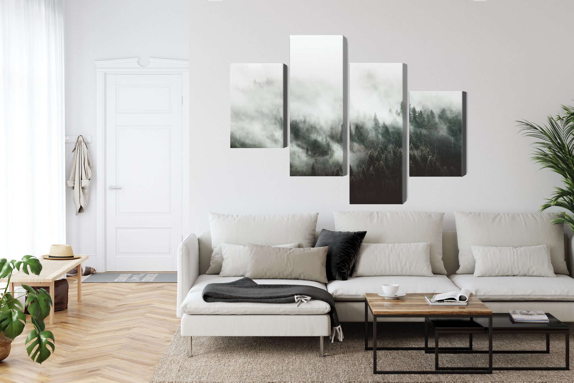 This four-panel canvas wall art brings a calm feeling you can sense in the room right away. It shows a conifer forest wrapped in dense mist—soft layers of white and grey blend into darker treetops, creating an atmospheric, “breathing” landscape. The four-part layout adds lightness and depth: your eyes move through successive planes, and the whole piece feels like a wide view taken from a mountain walk or a quiet forest morning. It’s wall art that doesn’t need strong colors to stand out—it works through mood and simplicity.