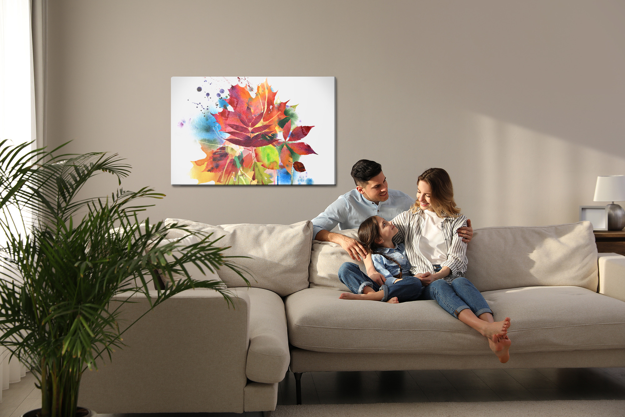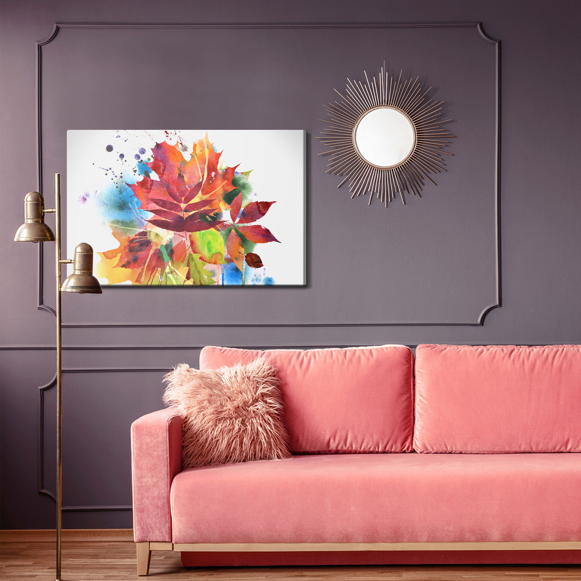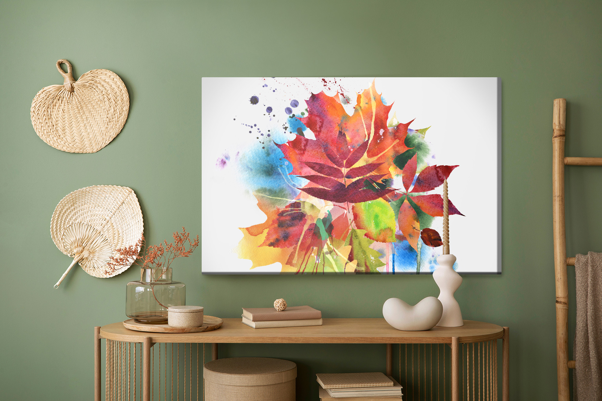 This watercolor-style canvas print with colorful leaves is an excellent choice for those who wish to brighten up their home and add a touch of artistic charm. A wonderful gift idea for art and nature lovers.