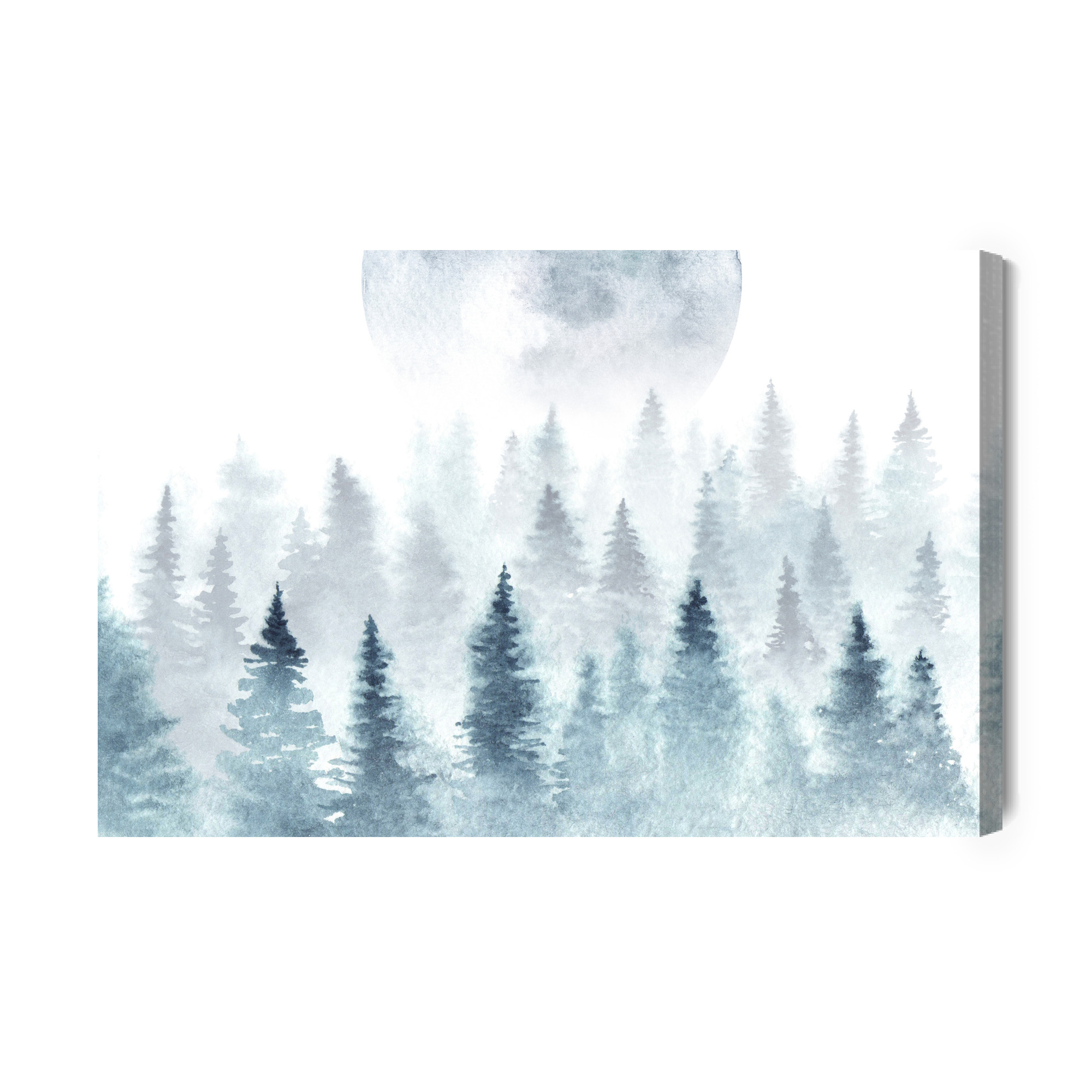 This exceptional canvas wall art depicts a serene forest immersed in mist, with a gently outlined moon in the background. The composition is maintained in bright, cool tones – shades of blue, gray, and muted green create a harmonious and soothing whole. The subtle brightness of the image gives it a light and ethereal character, evoking the calm of a quiet morning fog over the woods.
