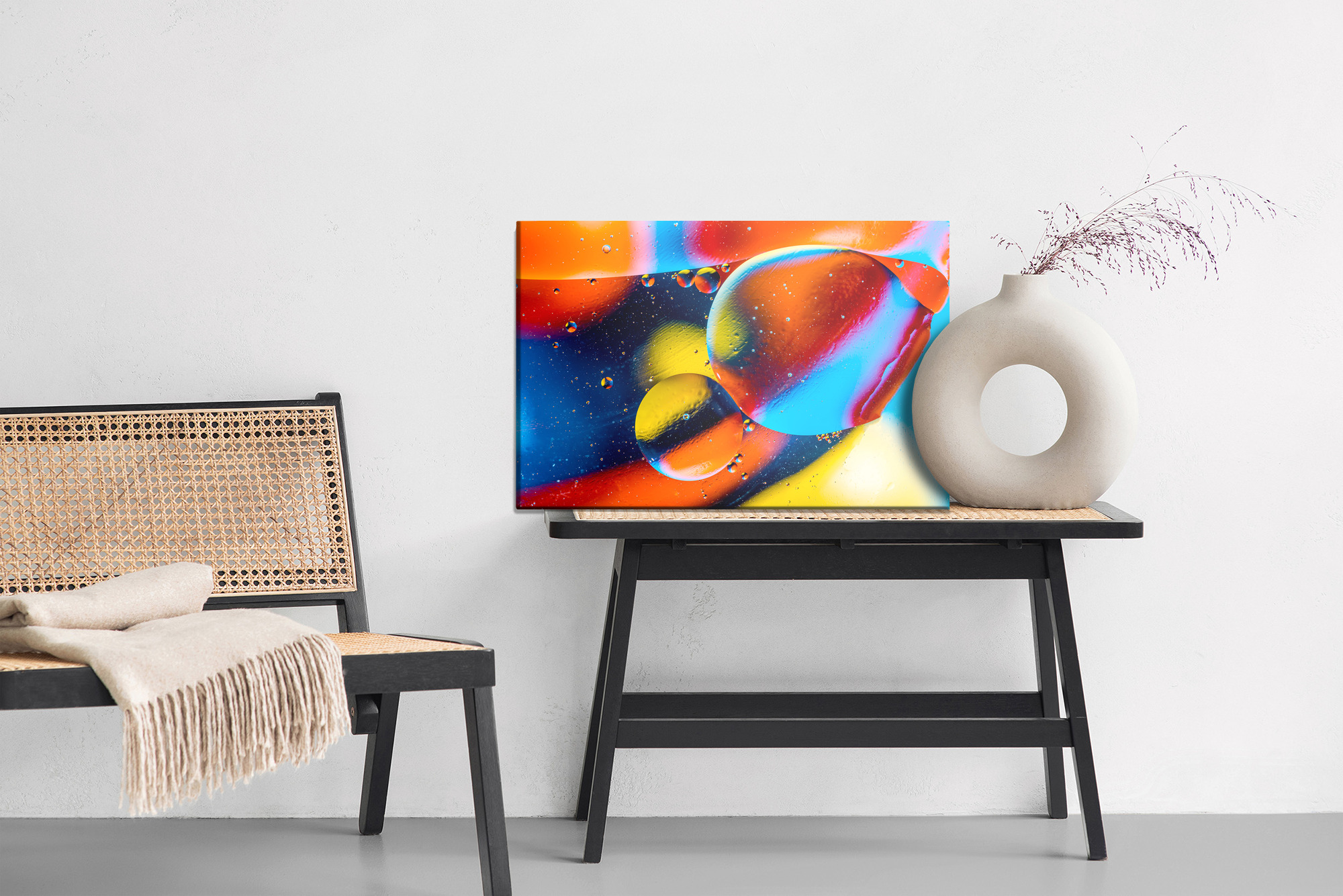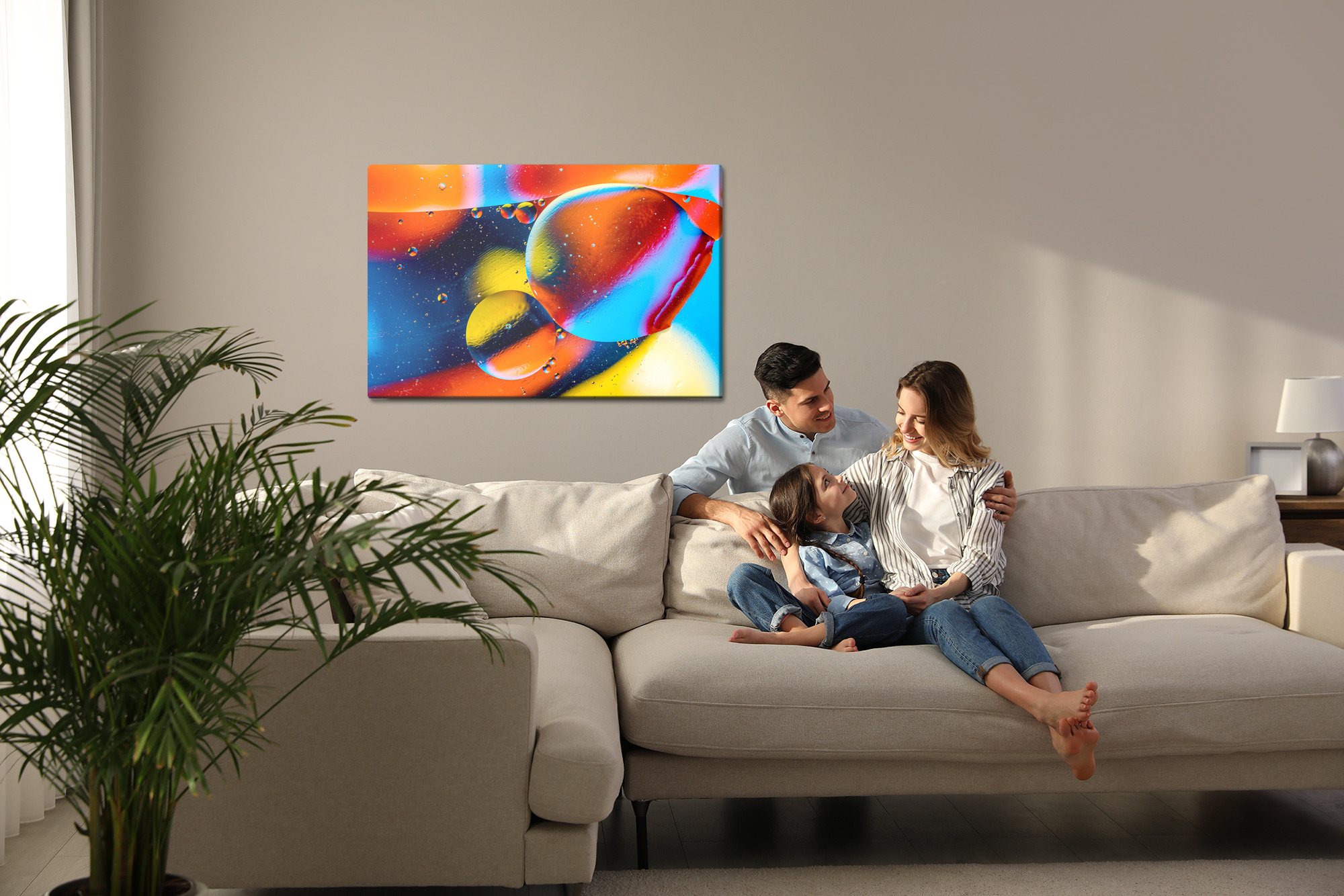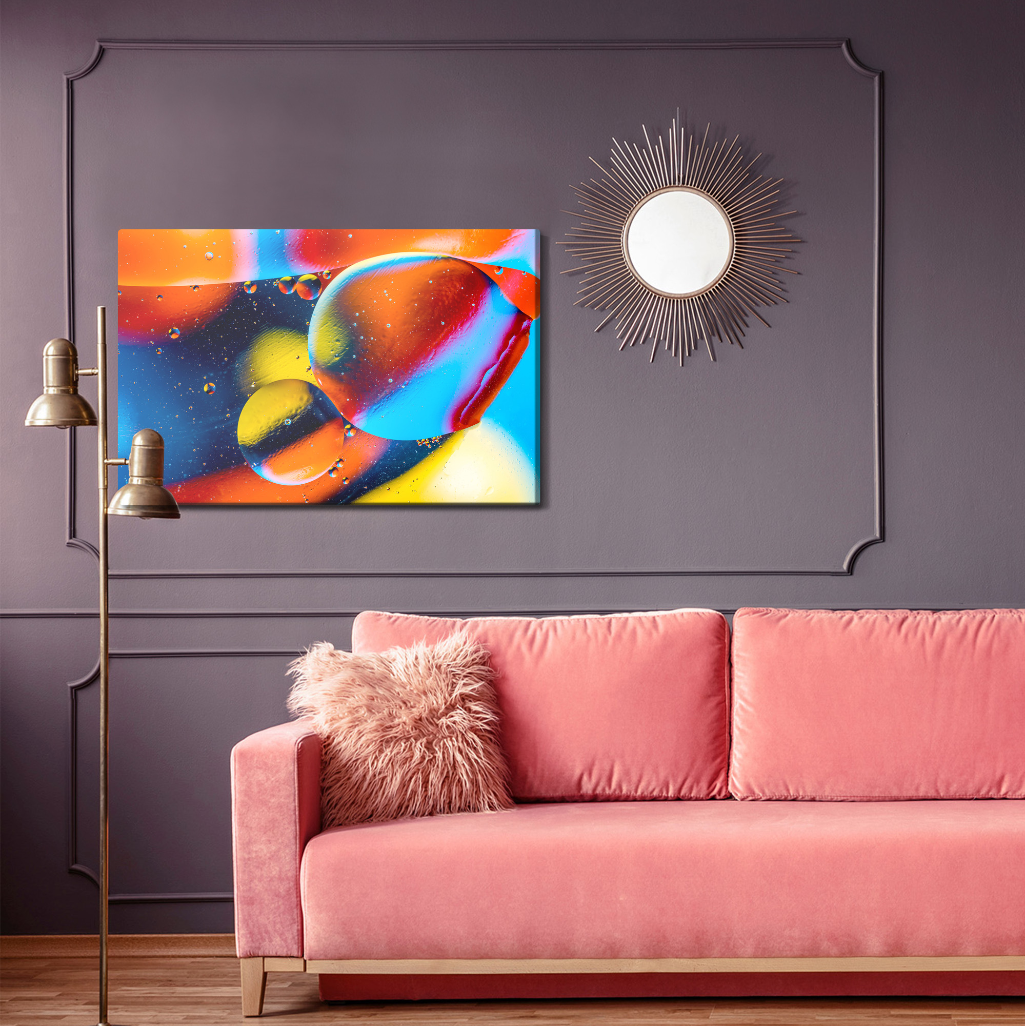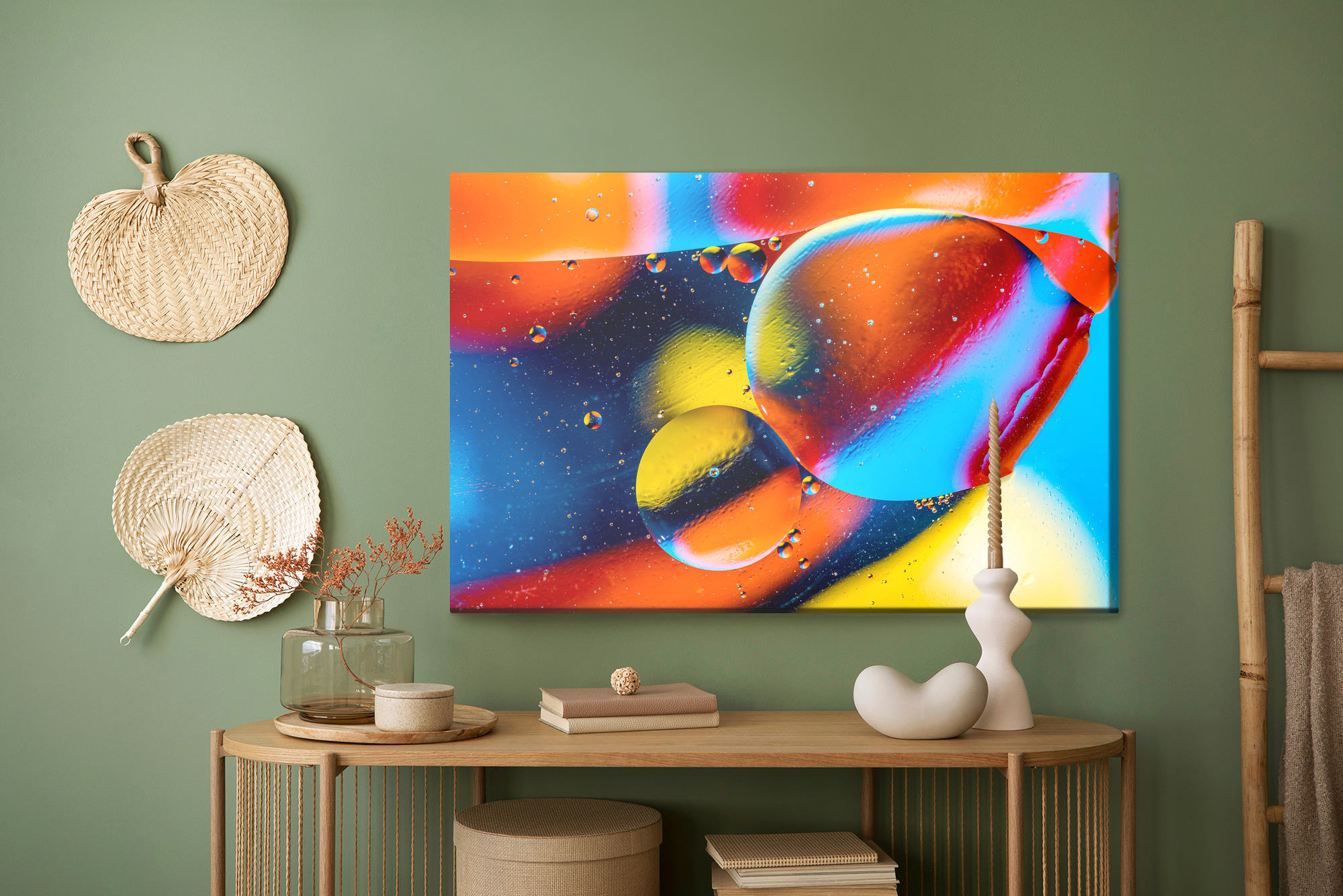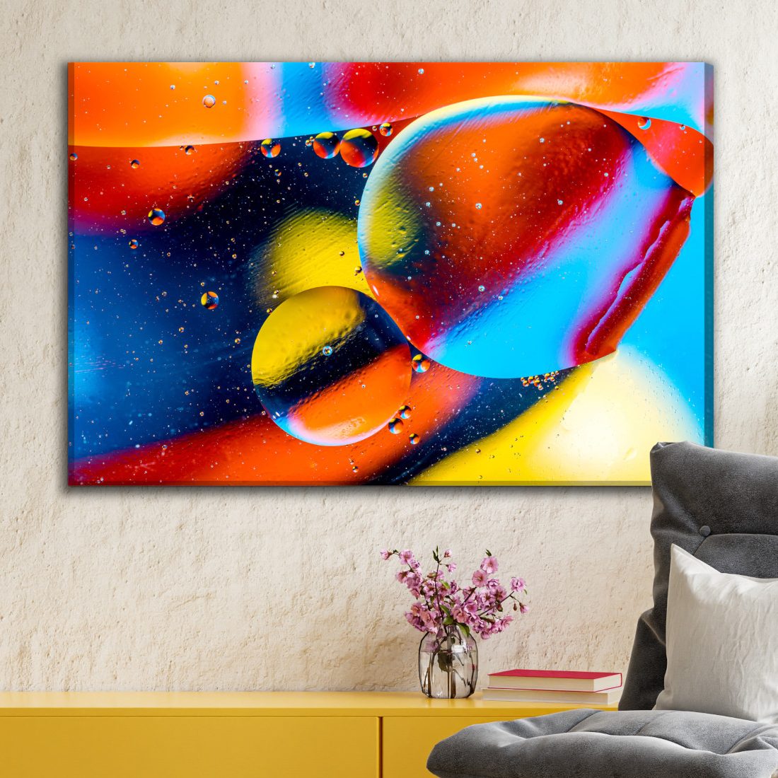 This striking canvas art is an explosion of color and contemporary expression. The abstract composition, inspired by macro photography, features drops and bubbles that, when touched by light, create a dynamic dance of vivid hues. Intense shades of blue, red, orange, and yellow blend together in a harmonious yet energetic visual balance.
