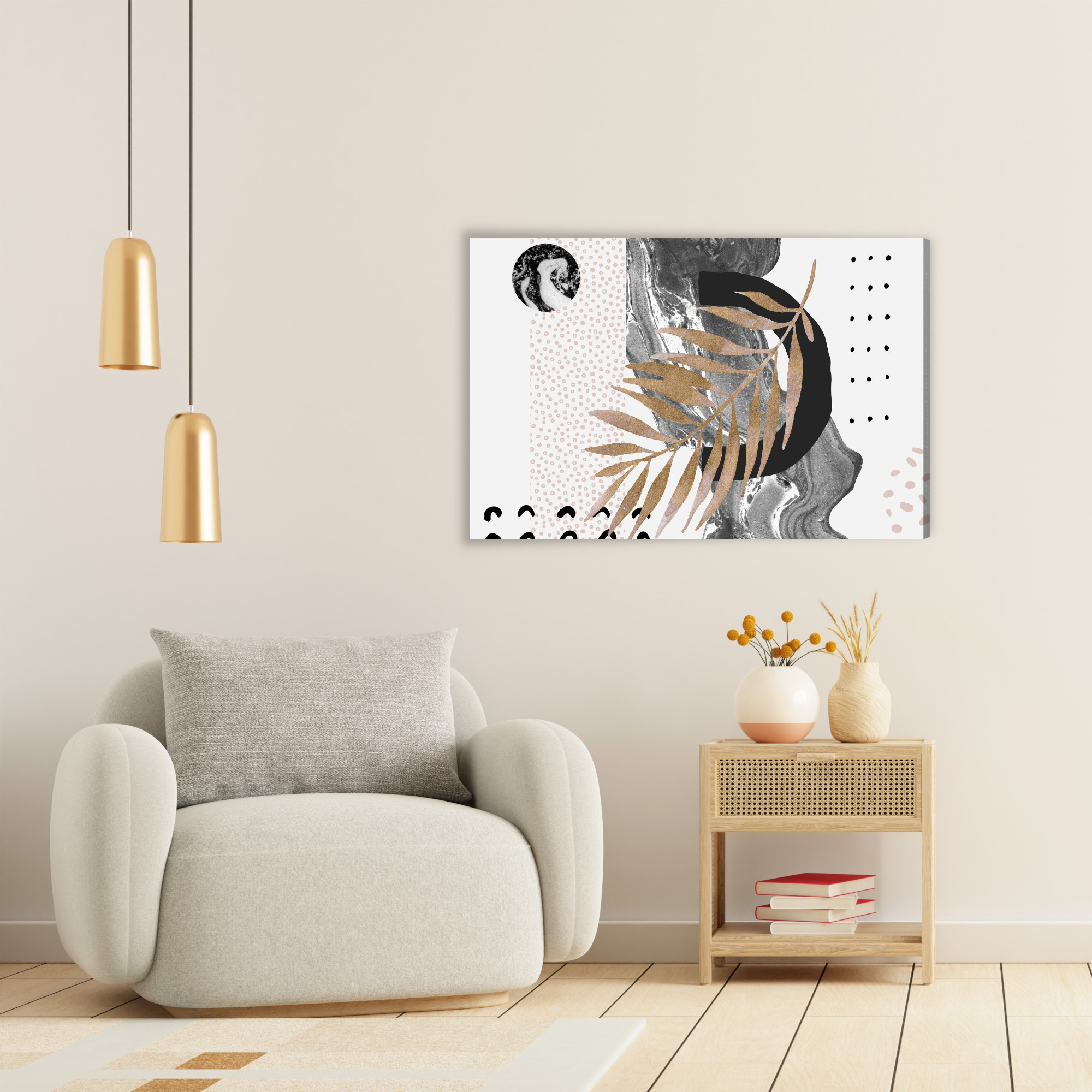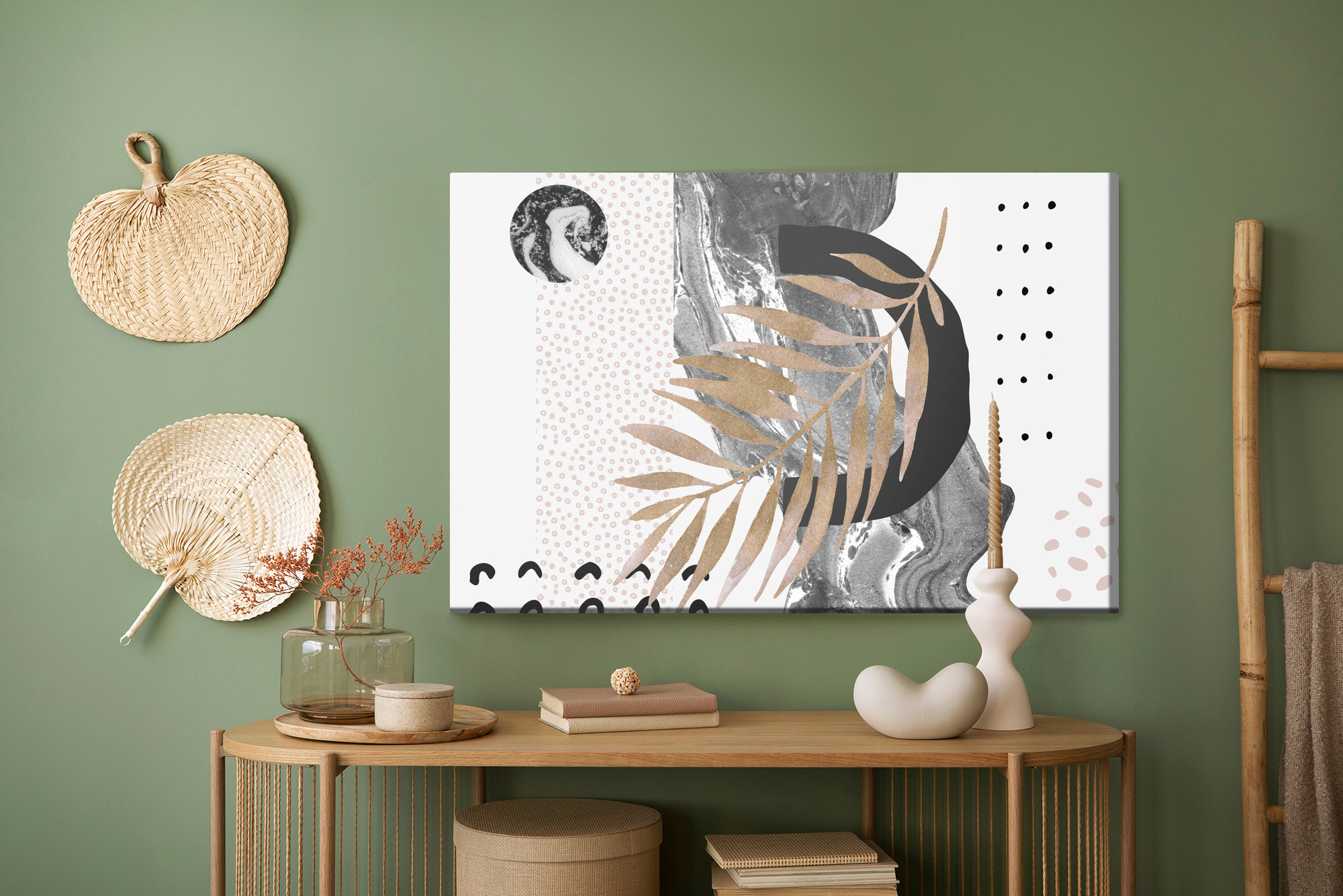 Add elegance and lightness to your interior in a modern style. This canvas print combines abstract forms with a botanical leaf motif to create a trendy, decorative composition. Graphic dots and contrasting shapes in the background add rhythm and a designer feel. The palette is muted and refined: white and marble-like greys are balanced by deep black, while the golden leaf brings a warm glamour accent. It’s a great wall art choice for the living room, bedroom, and office, and it also suits a hallway, hotel, or restaurant. A decoration that looks stylish and naturally draws attention.
