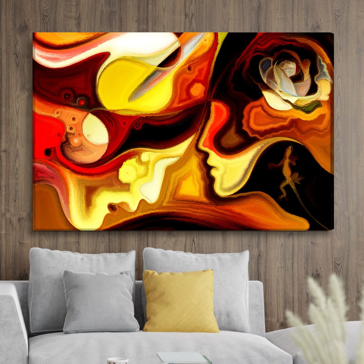 This modern canvas wall art invites you into a world of imagination and emotion. At first glance, two abstract human faces stand out, but the longer you look, the more details and hidden forms begin to emerge. Gentle, flowing lines and rounded color shapes create a smooth, cohesive composition that captivates the eye.