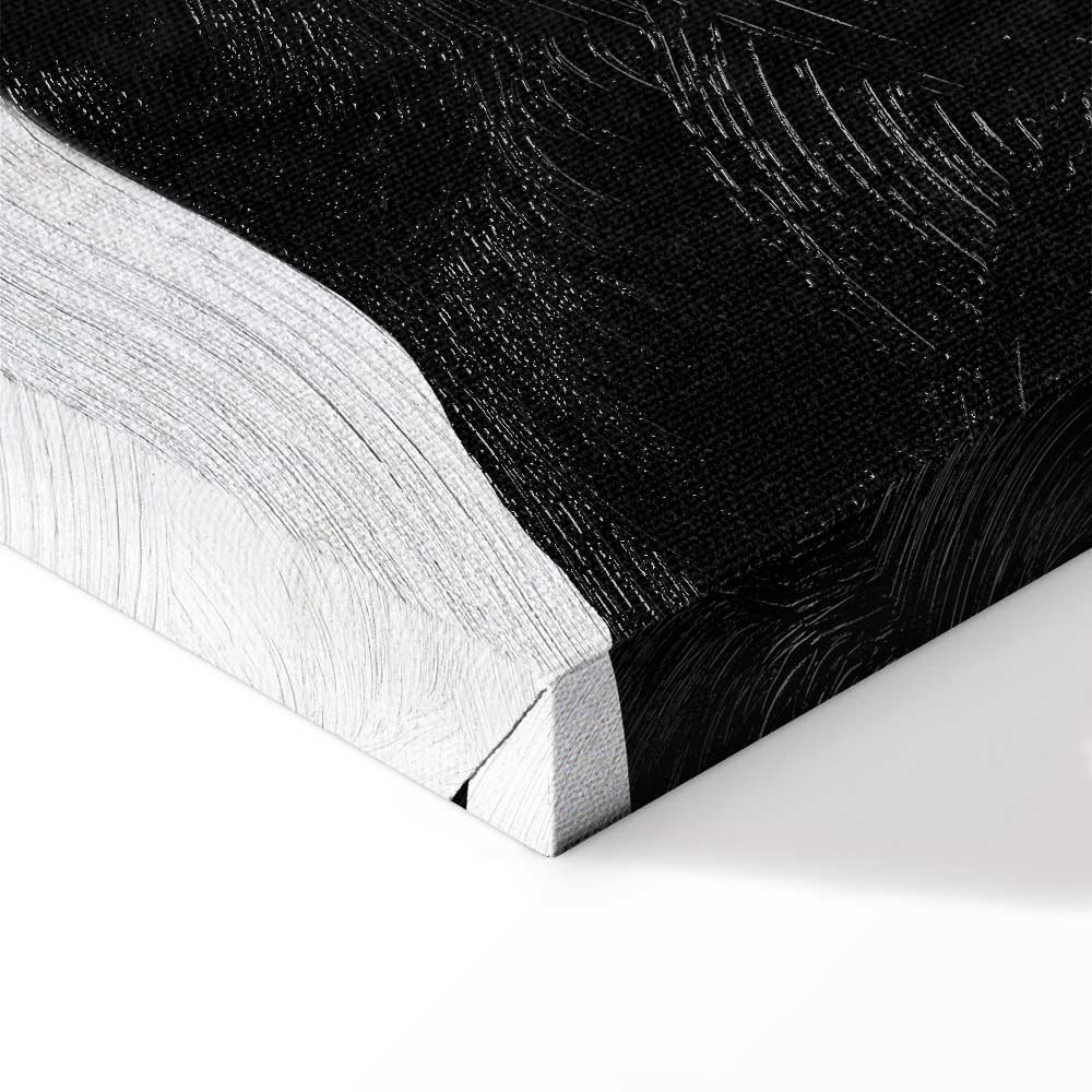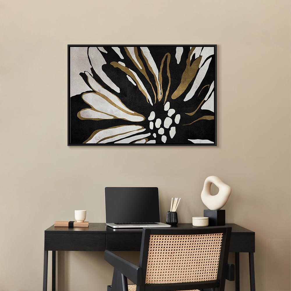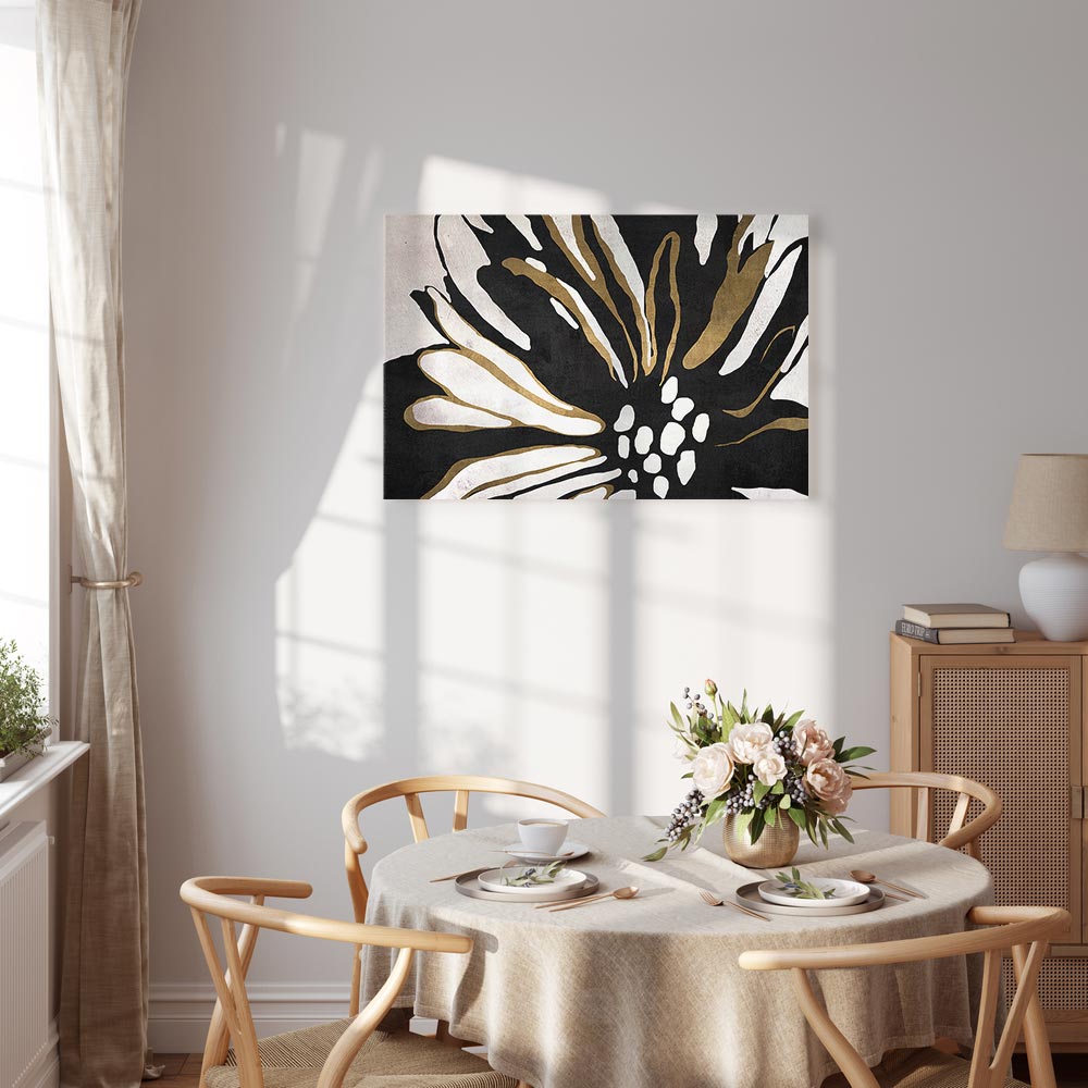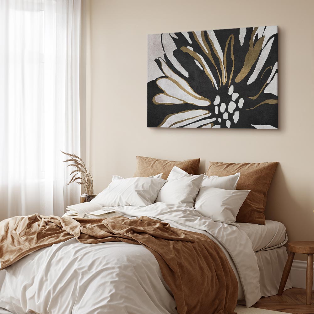 This expressive canvas print with an abstract flower motif draws attention with its bold contrast and modern form. The combination of deep black, soft off white and warm beige gold accents creates an elegant composition that brings character and stylish energy into the interior. This wall art is a perfect choice for a living room, bedroom, office, hotel or hallway, becoming a striking addition to modern and minimalist arrangements. It is an excellent option for those who want to enliven a space with a decoration that offers artistic flair and timeless color appeal.