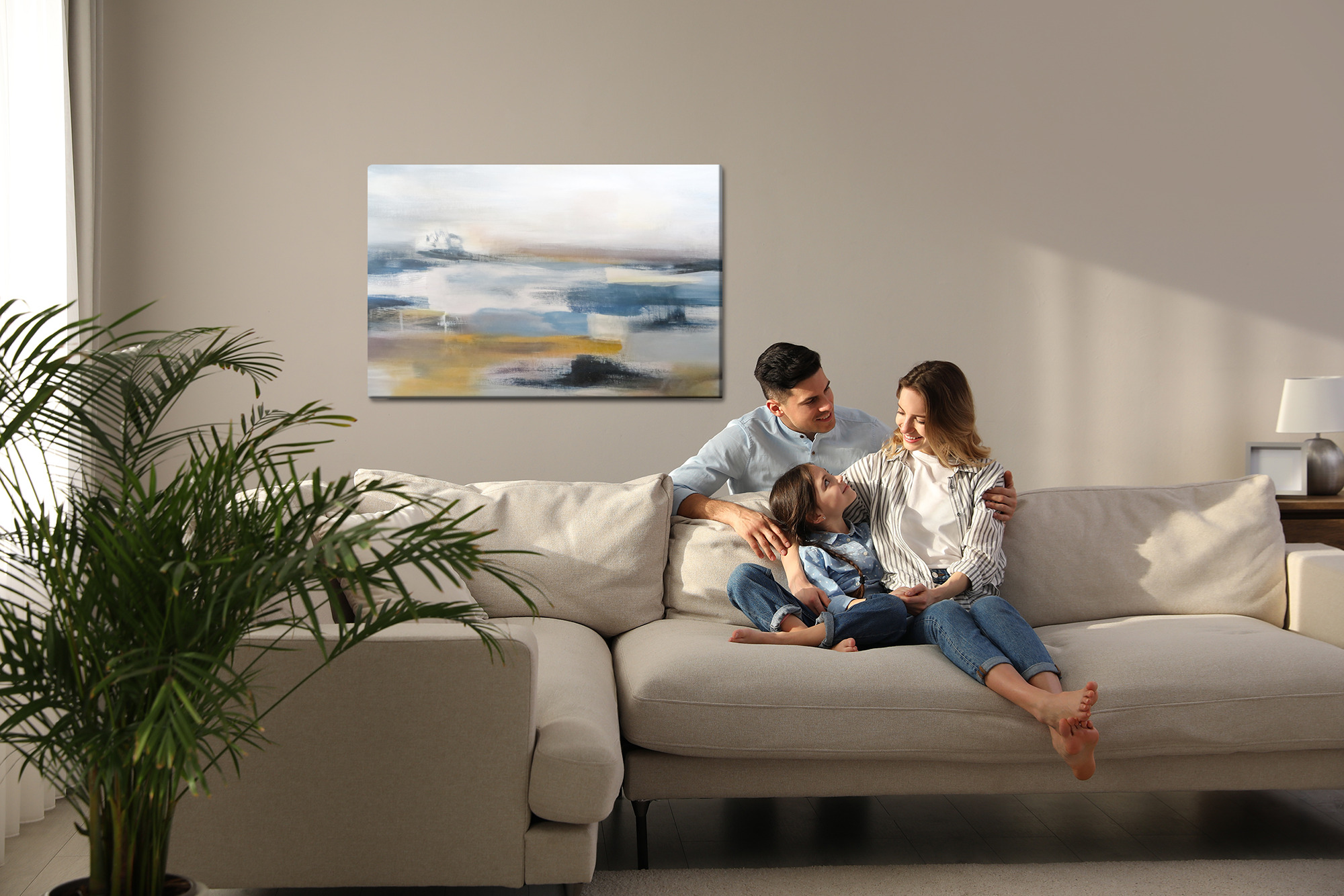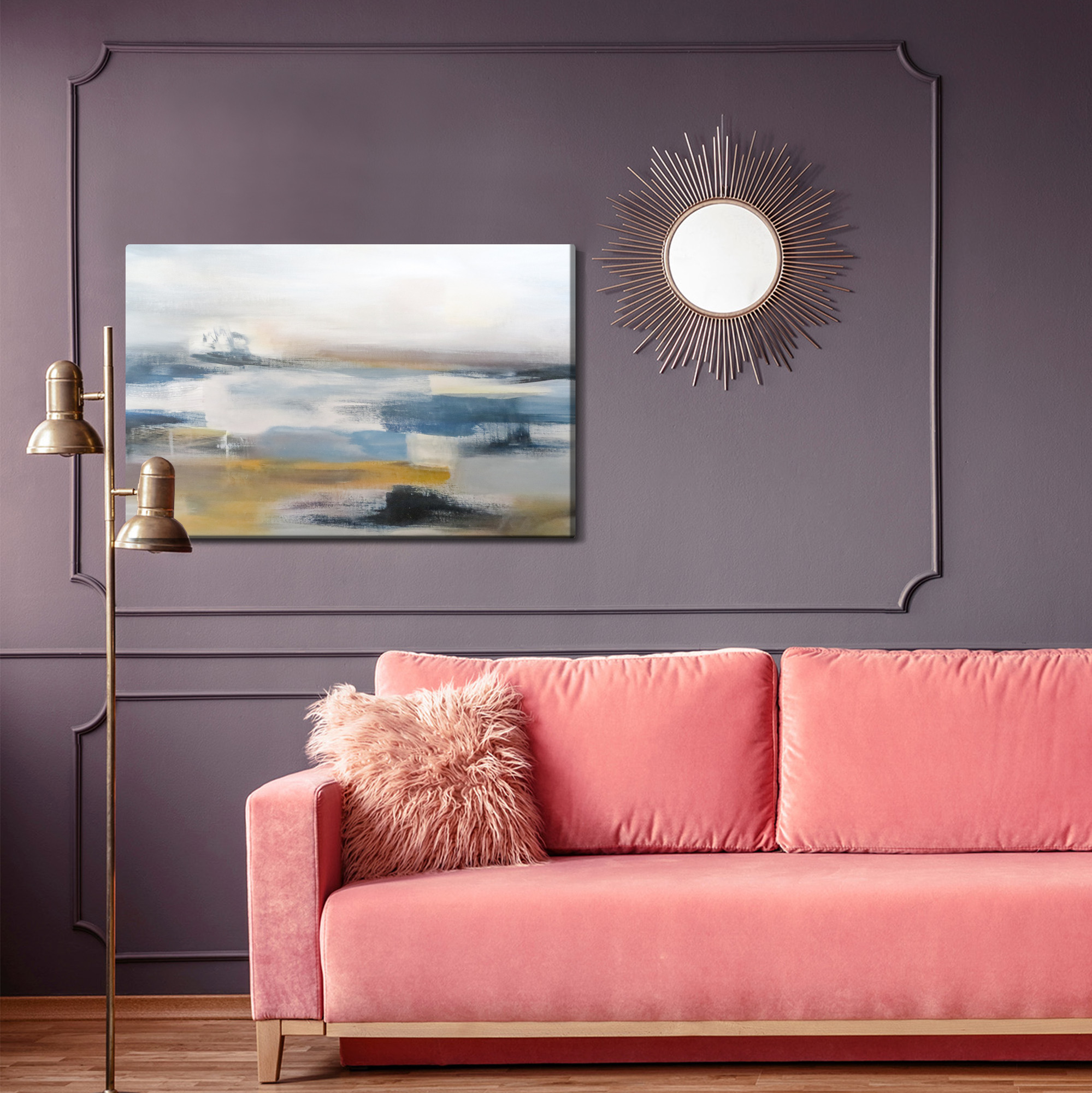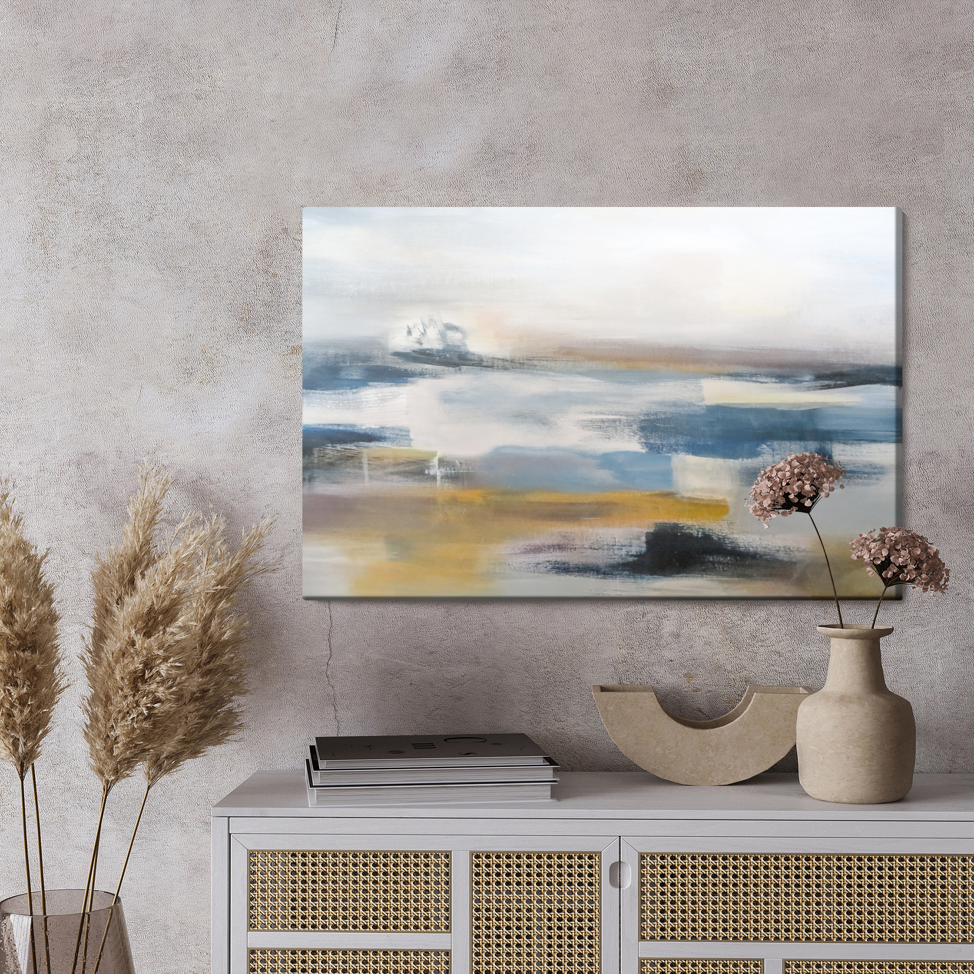 Bring calm and a sense of open space into your interior. This canvas print presents an abstract landscape inspired by the horizon and still water, painted with soft, blurred brushstrokes. The palette is muted and harmonious: cool blues and greys blend with warm beiges and sandy accents, creating a gentle, soothing mood. It’s an ideal wall art choice for the living room, bedroom, or office, and it also works beautifully in a hotel or hallway where you want to add balance and lightness. A subtle decoration that doesn’t overpower the space, but completes it with style.
