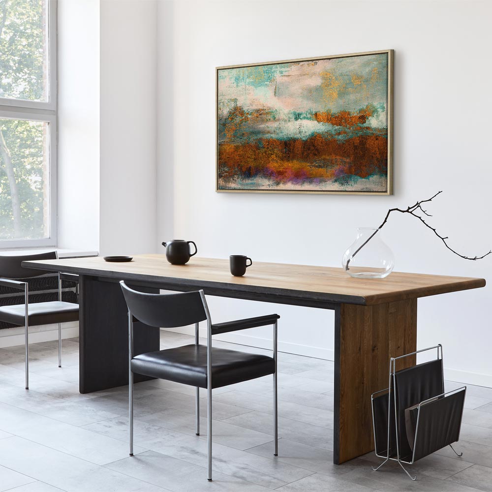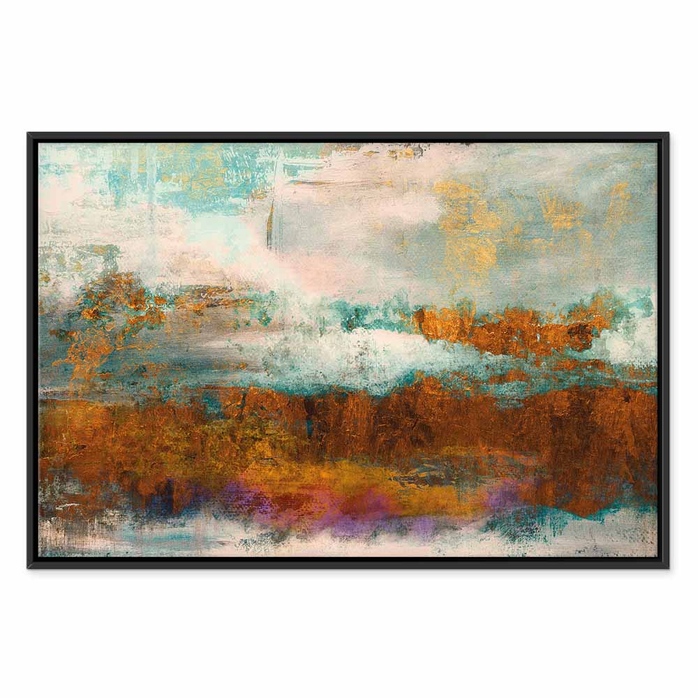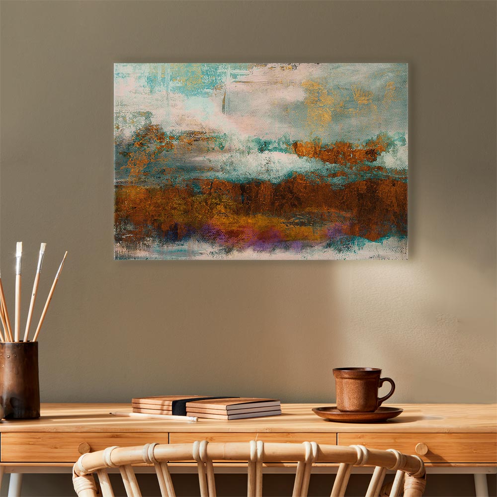 A painterly abstract composition inspired by landscape delights with depth of colour and an elegant, artistic expression. The combination of turquoise, white, rusty brown, muted orange and subtle violet accents creates a warm yet sophisticated arrangement that beautifully enhances the character of the interior. This canvas print works perfectly in a living room, bedroom, office, hotel, restaurant or hallway, adding style and a cosy sense of energy to the space. It is an excellent choice for those who appreciate modern wall art with painterly lightness and a fashionable colour palette.