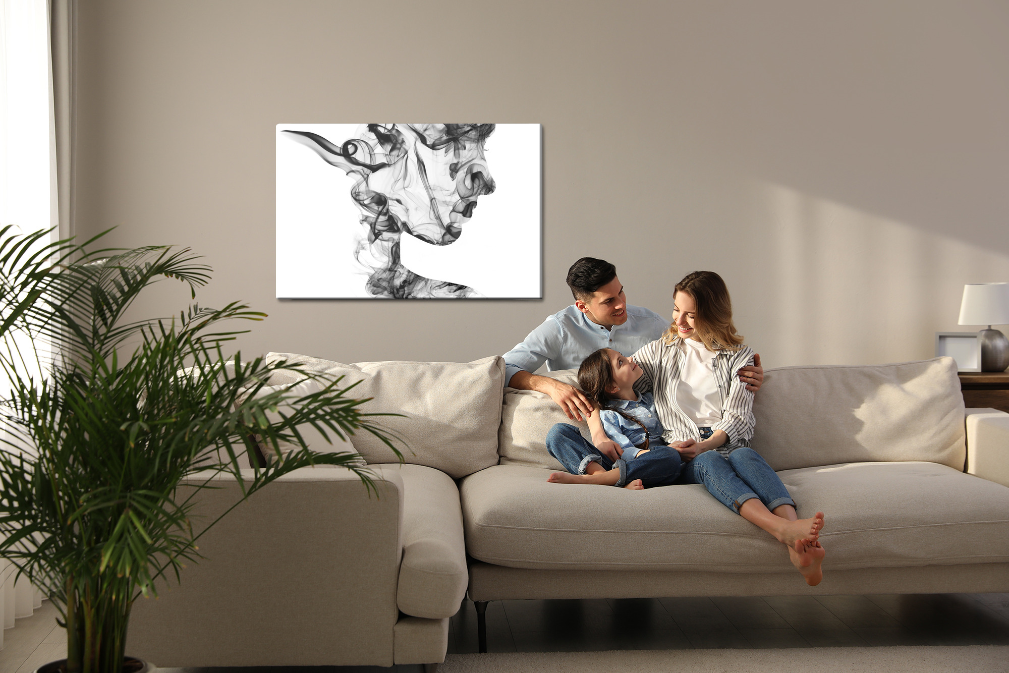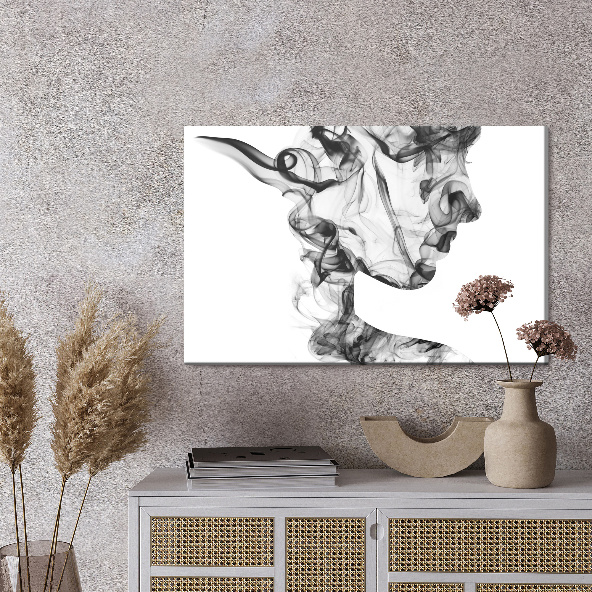 Add mystery and elegance to your interior in a modern way. This canvas print features an abstract female profile formed by light, flowing wisps that create an airy smoke-like effect. The composition is minimalist and highly stylish, so it catches the eye with detail while still feeling subtle. The palette is black and white: deep blacks blend into soft greys against a bright background, creating a strong contrast. It’s an ideal wall art choice for the living room, bedroom, or office, and it also works beautifully in hotels, restaurants, or hallways. A decoration that highlights the character of the space.