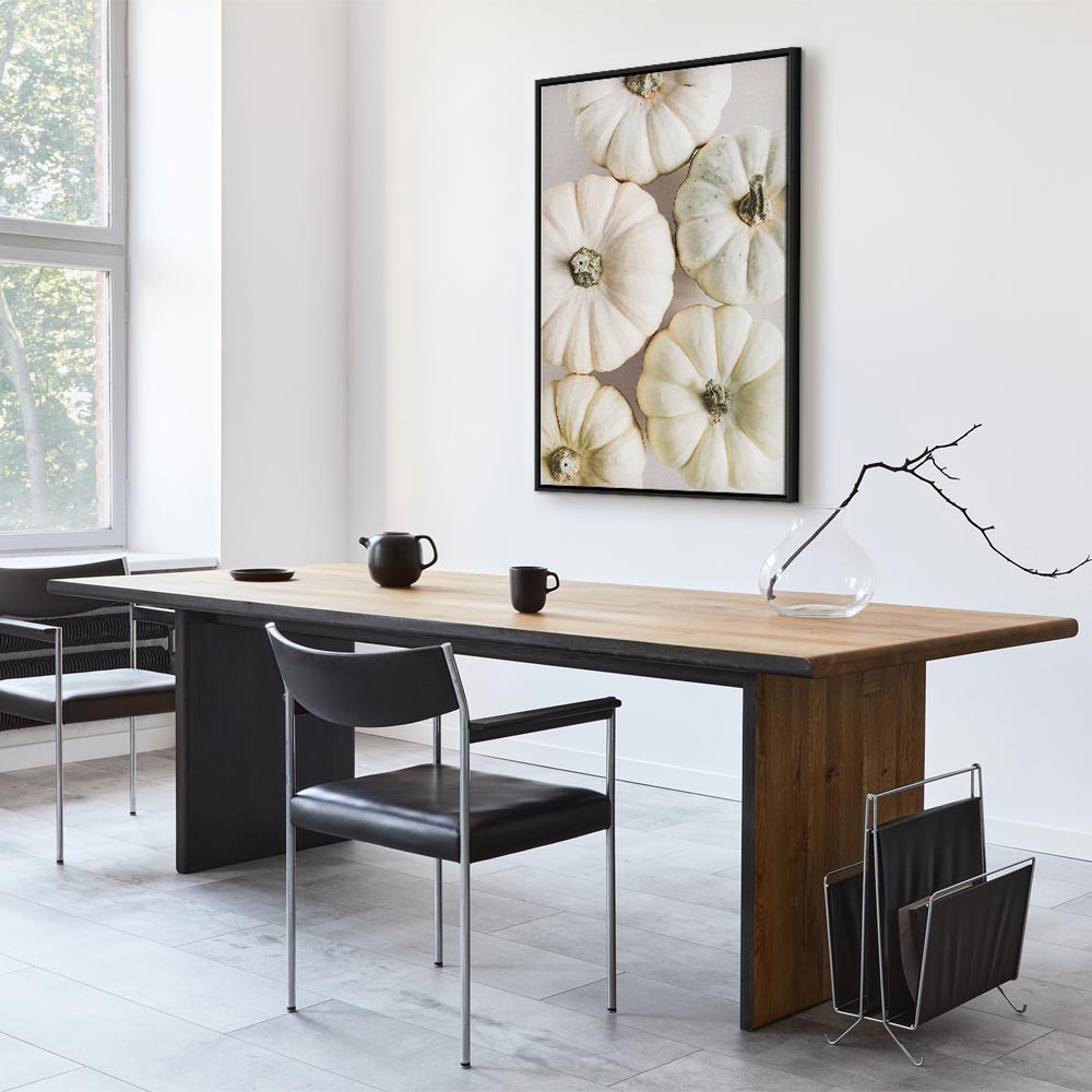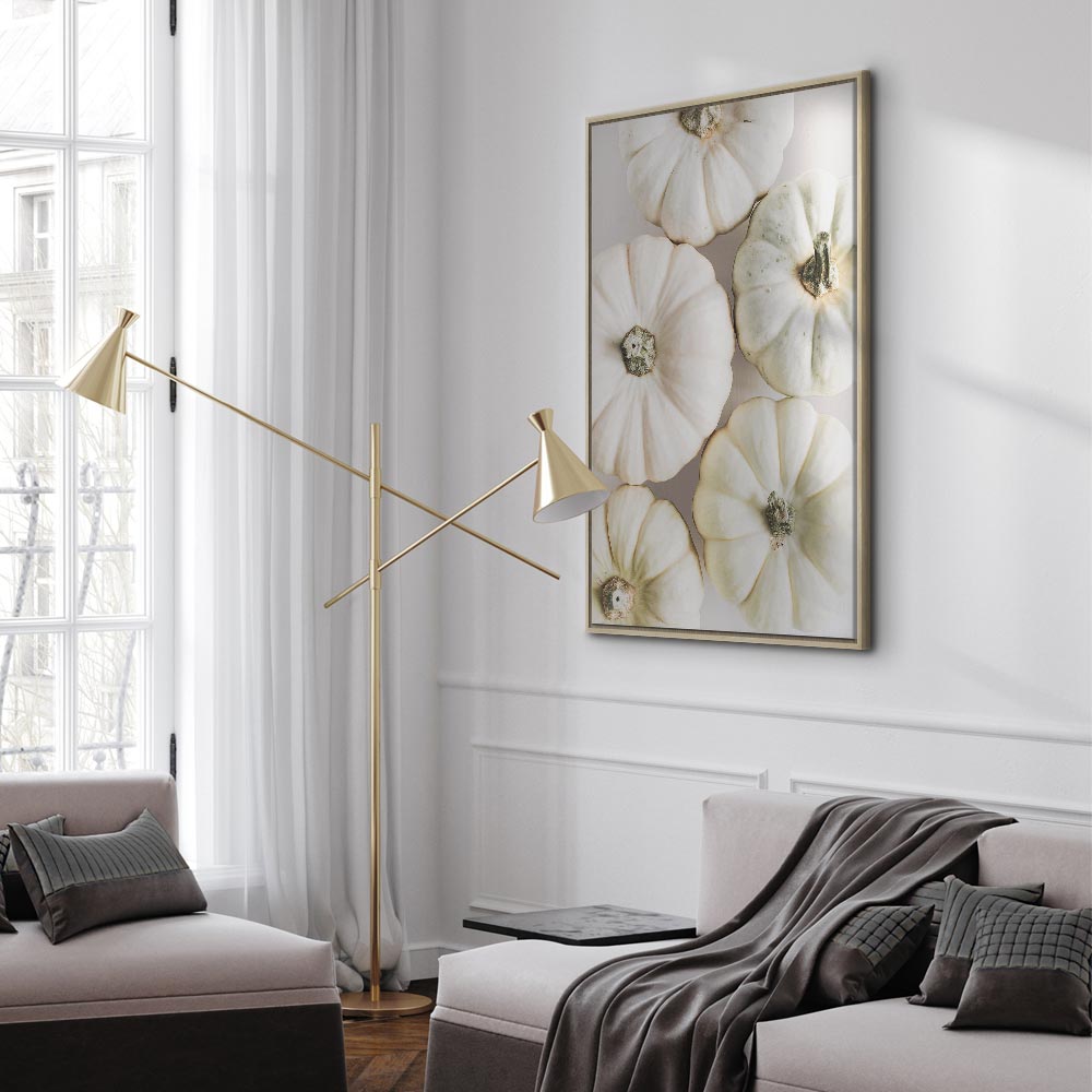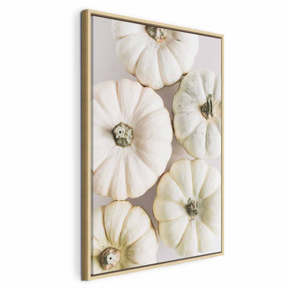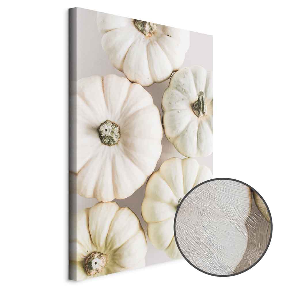A stylish canvas print featuring white pumpkins delights with its simplicity, lightness, and fashionable natural character. The bright composition based on shades of white, cream, and soft beige brings calm and elegant harmony into the interior. It is a perfect canvas print for the living room, kitchen, dining area, restaurant, hotel, or hallway, wherever a cosy atmosphere and an aesthetic wall accent matter. The botanical motif in a modern, minimalist form works beautifully with Scandinavian, natural, and contemporary interiors. This wall decoration gently warms the space and adds a unique, stylish touch.