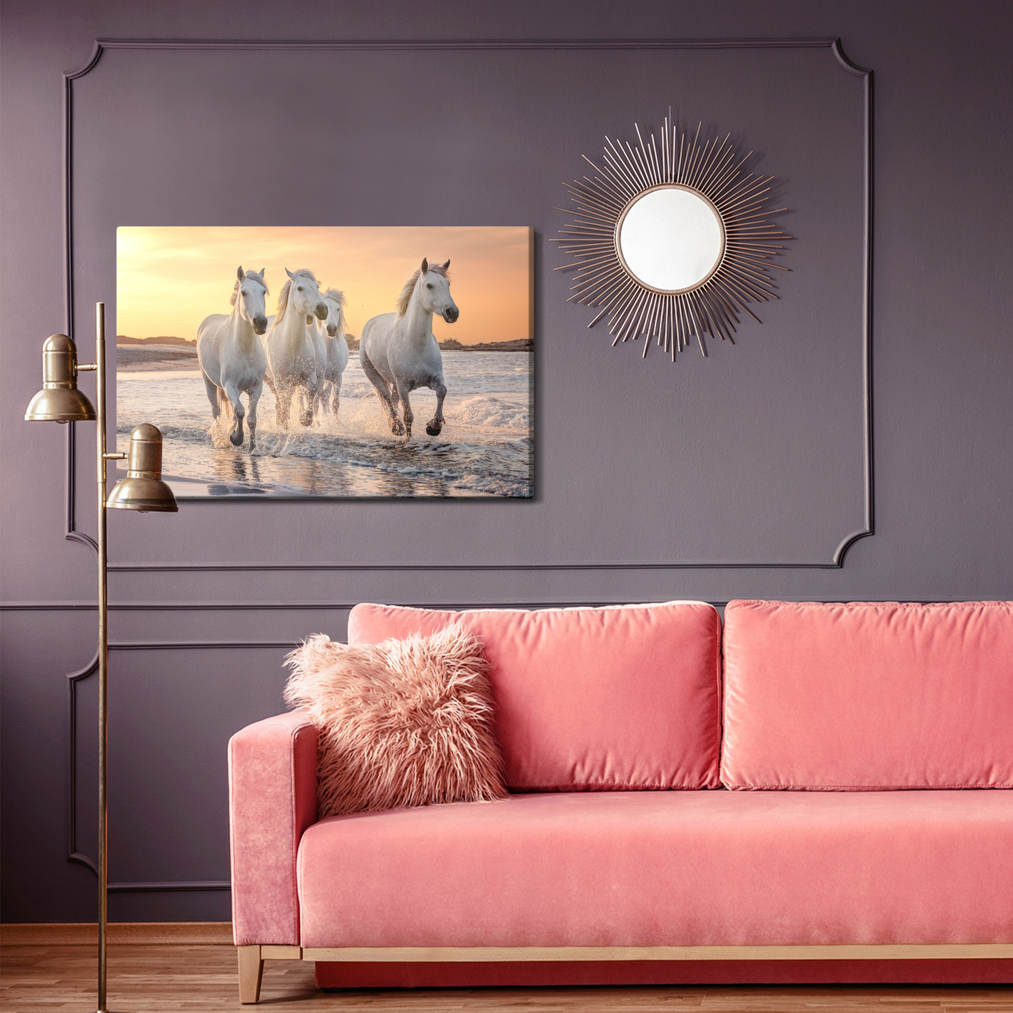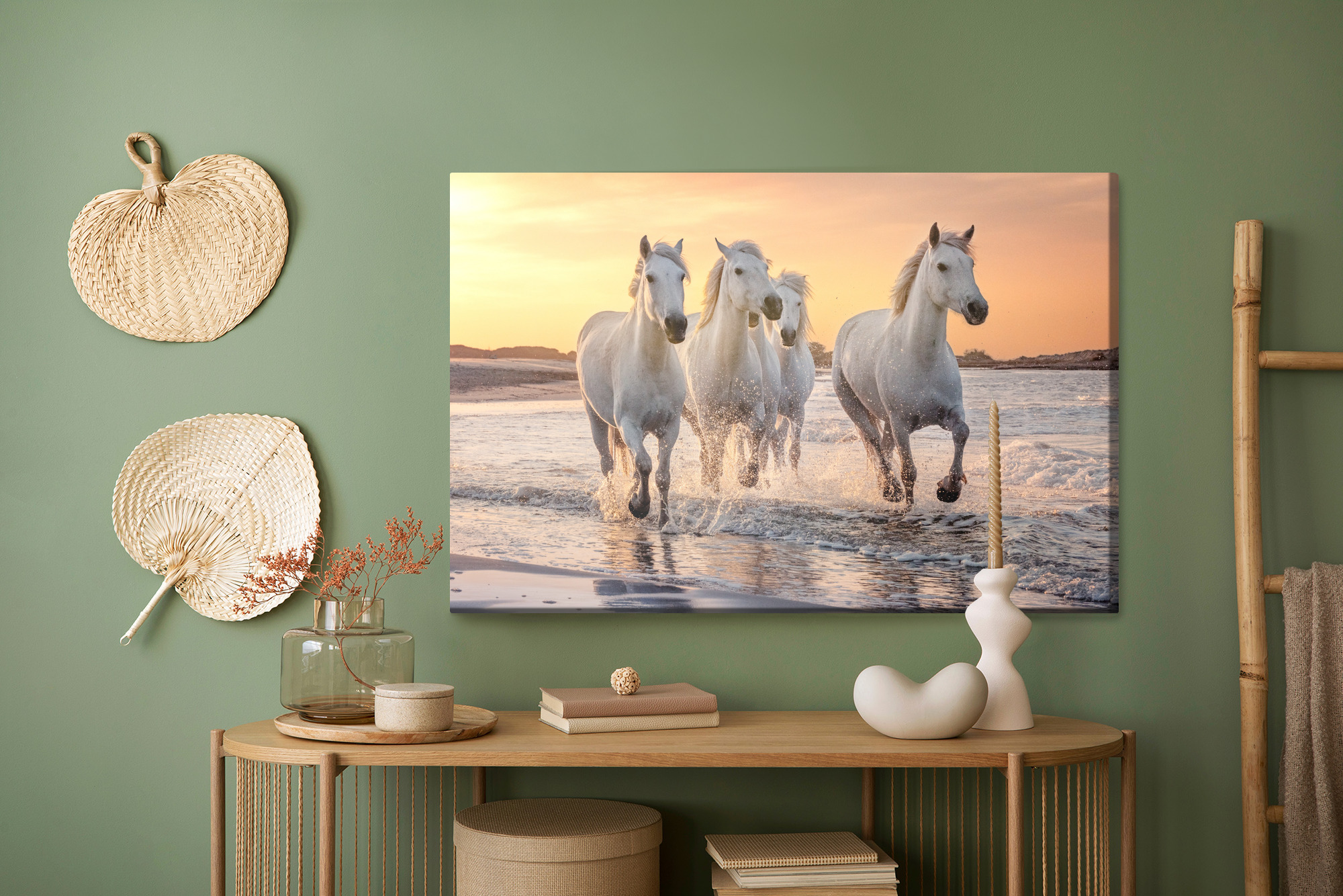 This canvas print captivates with energy and natural beauty. White horses galloping through shallow water create a dynamic scene that instantly enlivens the interior and adds a feeling of space. The photographic style blends elegance with wild freedom, making it a great match for modern decor and nature inspired rooms. The palette is warm and luminous with golden and peach sunset tones, balanced by cool ocean blues and bright white silhouettes. It is a perfect choice for wall art in the living room, bedroom, home office or hallway. It also suits hotels and restaurants where it is meant to impress. A strong pick if you want a canvas print that draws attention and sparks emotion.