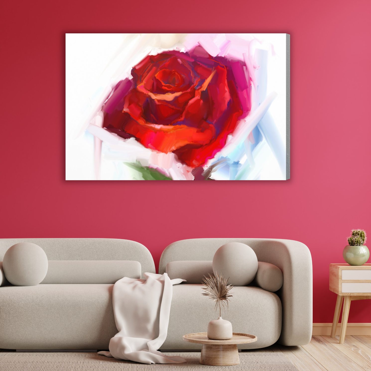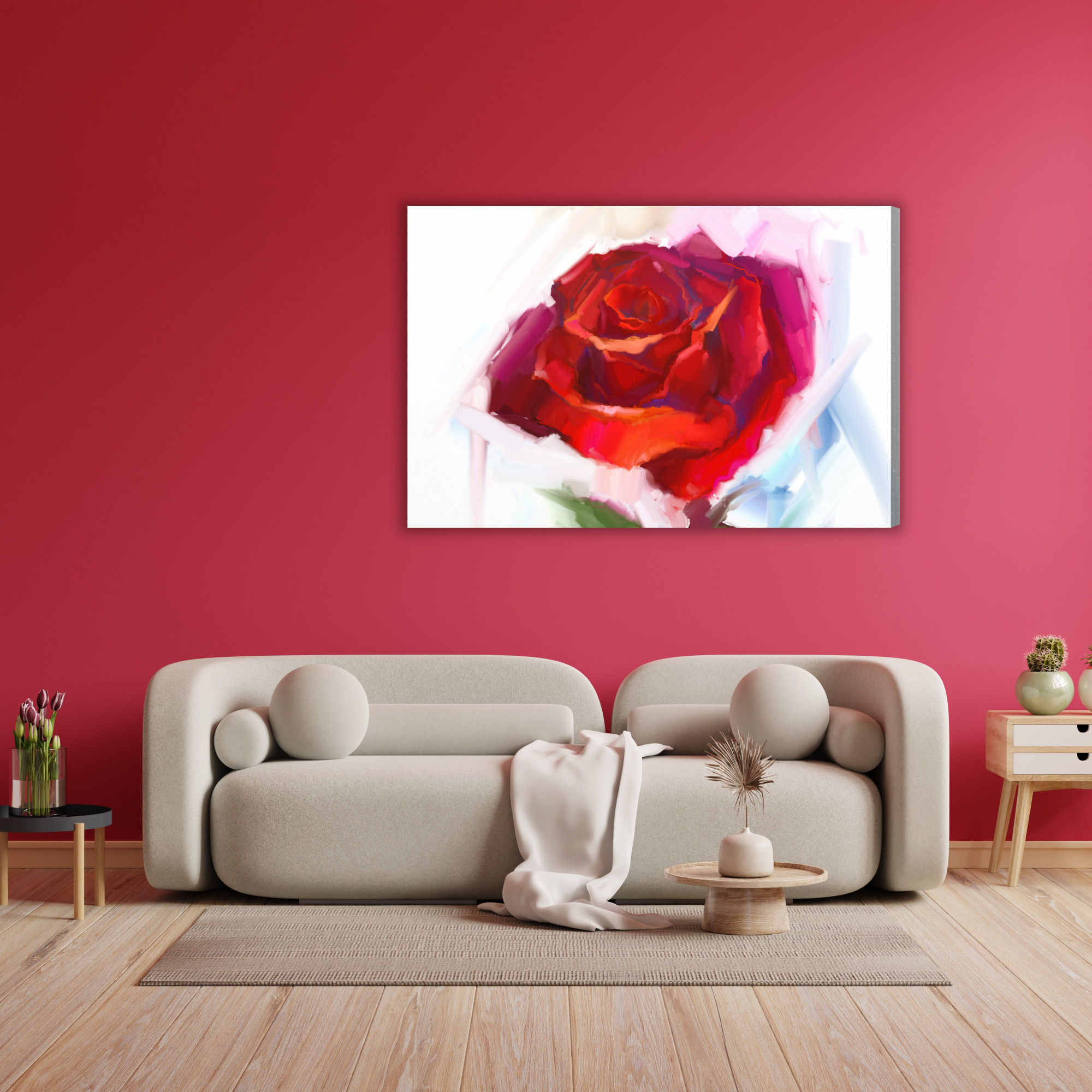 An energetic canvas print with a red rose in a modern, painterly style instantly brings life to your interior. Juicy reds and deep carmine blend into pink and soft pastel tones in the background, creating depth and a gentle sense of brush movement. The composition is bold yet elegant, making it a perfect choice for a living room, bedroom, or hallway. It also suits a hotel or restaurant, adding a touch of class and a romantic accent, especially in modern and glamour interiors.