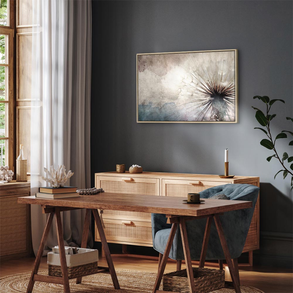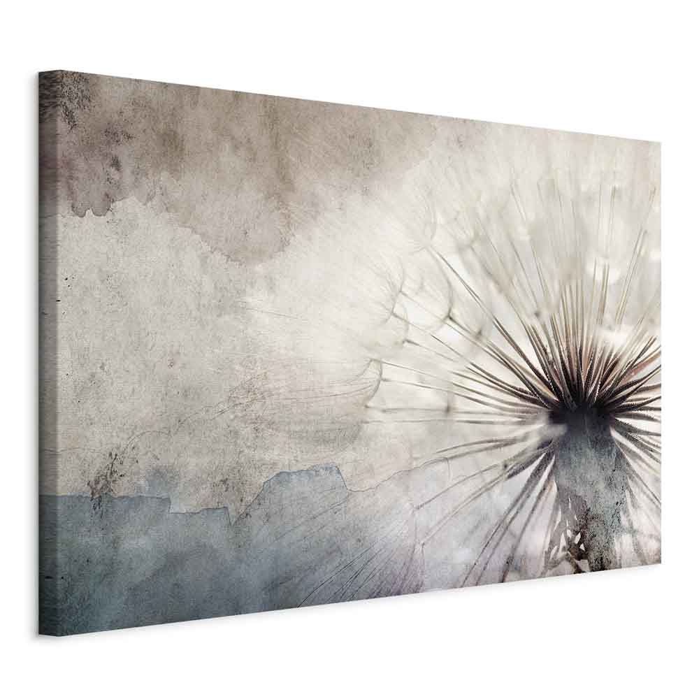 A stylish canvas print featuring a dandelion in an artistic composition captivates with its lightness, subtle charm, and decorative softness of form. The gently blurred arrangement in shades of beige, white, grey, and muted blue brings calm and a harmonious mood into the interior. It is an elegant choice for the living room, bedroom, office, hotel, or hallway, fitting beautifully into modern, Scandinavian, and minimalist interiors. The floral motif in a painterly style draws attention while remaining light and understated, making this wall art a perfect complement to a bright and stylish space.
