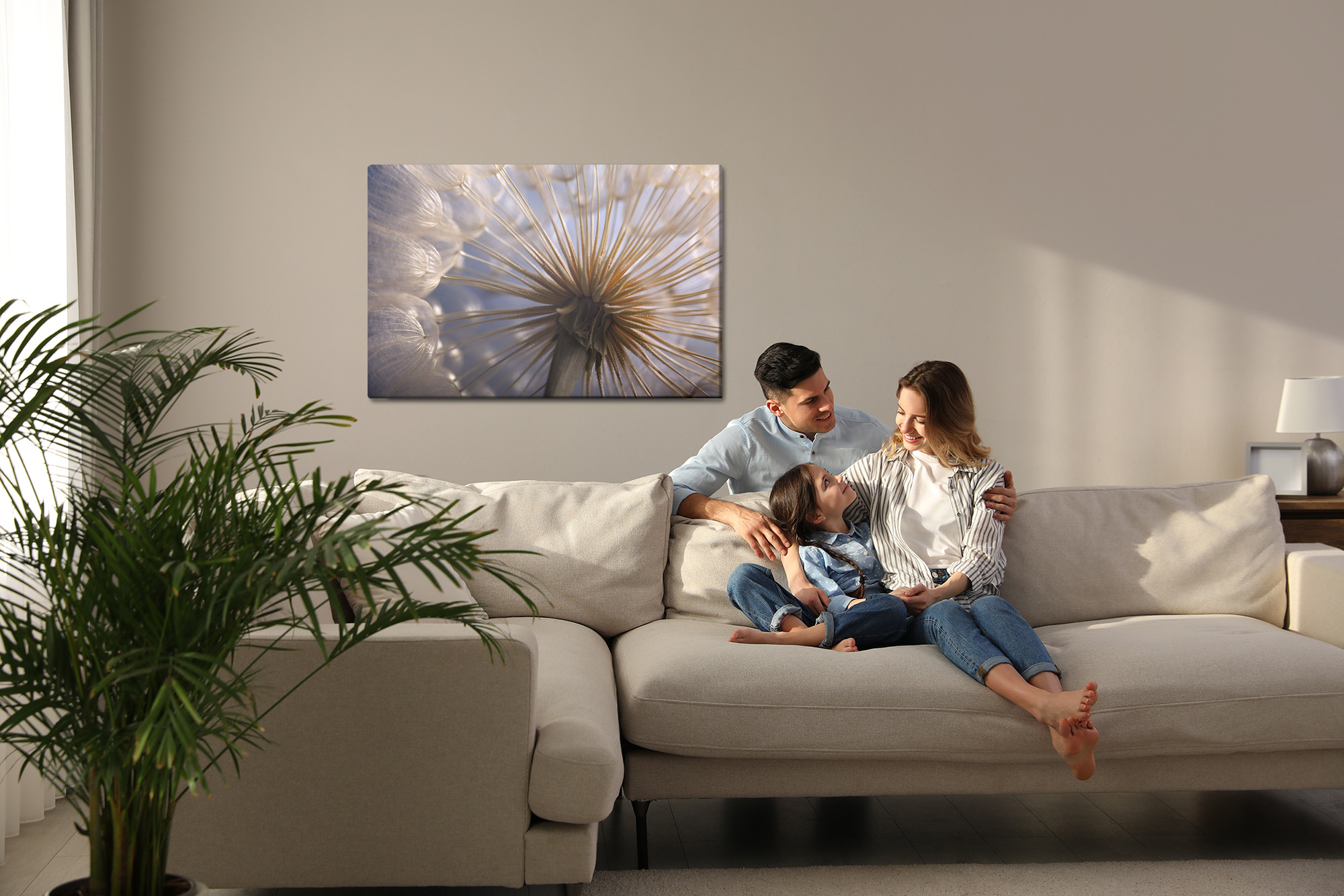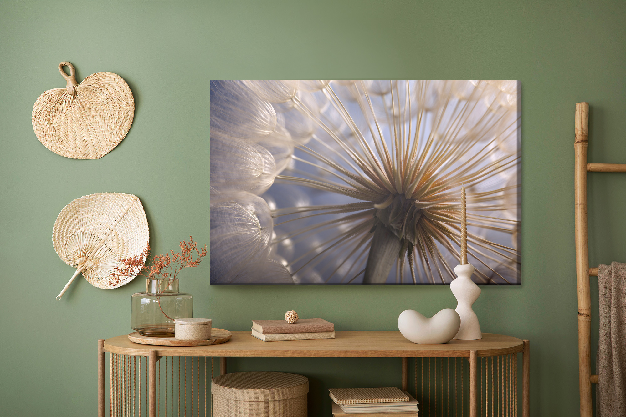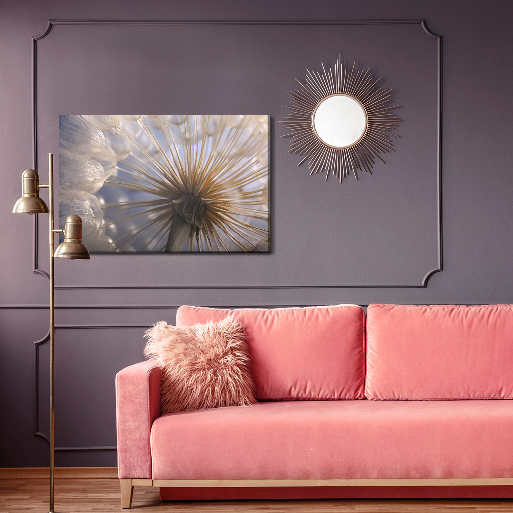 This exceptional canvas art captures the delicate world of nature up close – a macro photograph of a dandelion at the peak of its airy lightness and fragility. The radiant structure of its seeds forms a mesmerizing, almost abstract pattern, while the soft lighting adds a sense of calm and elegance to the composition.