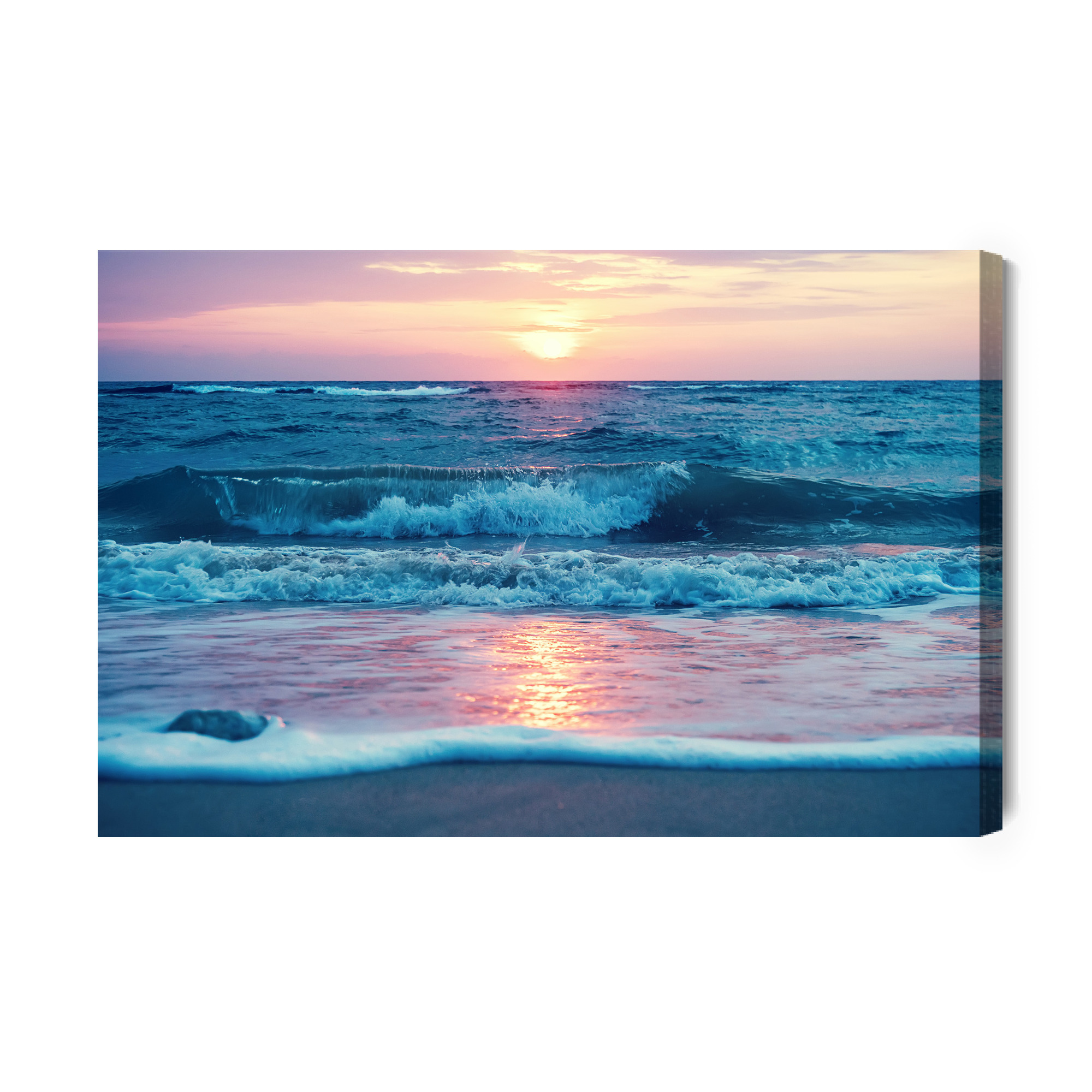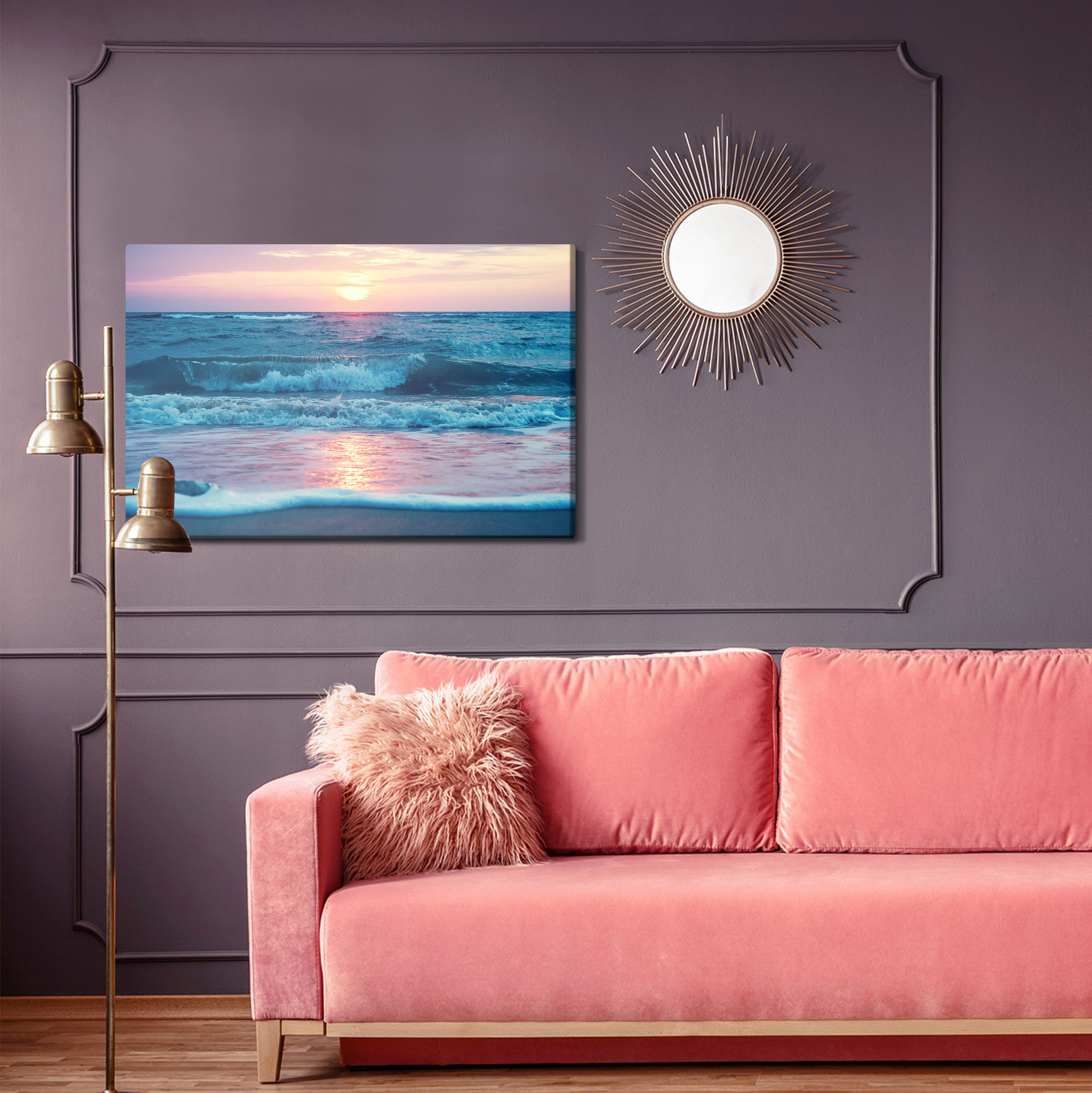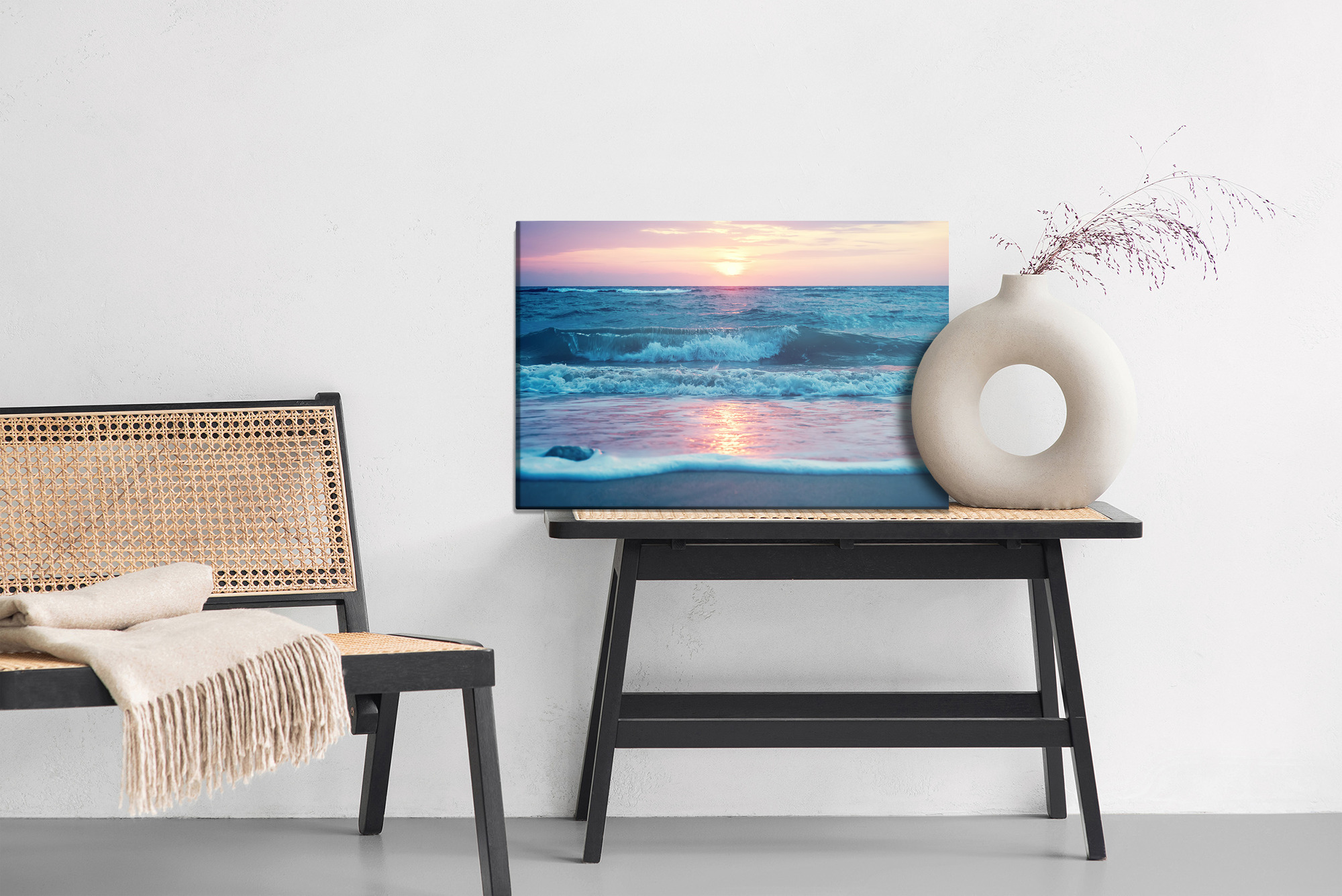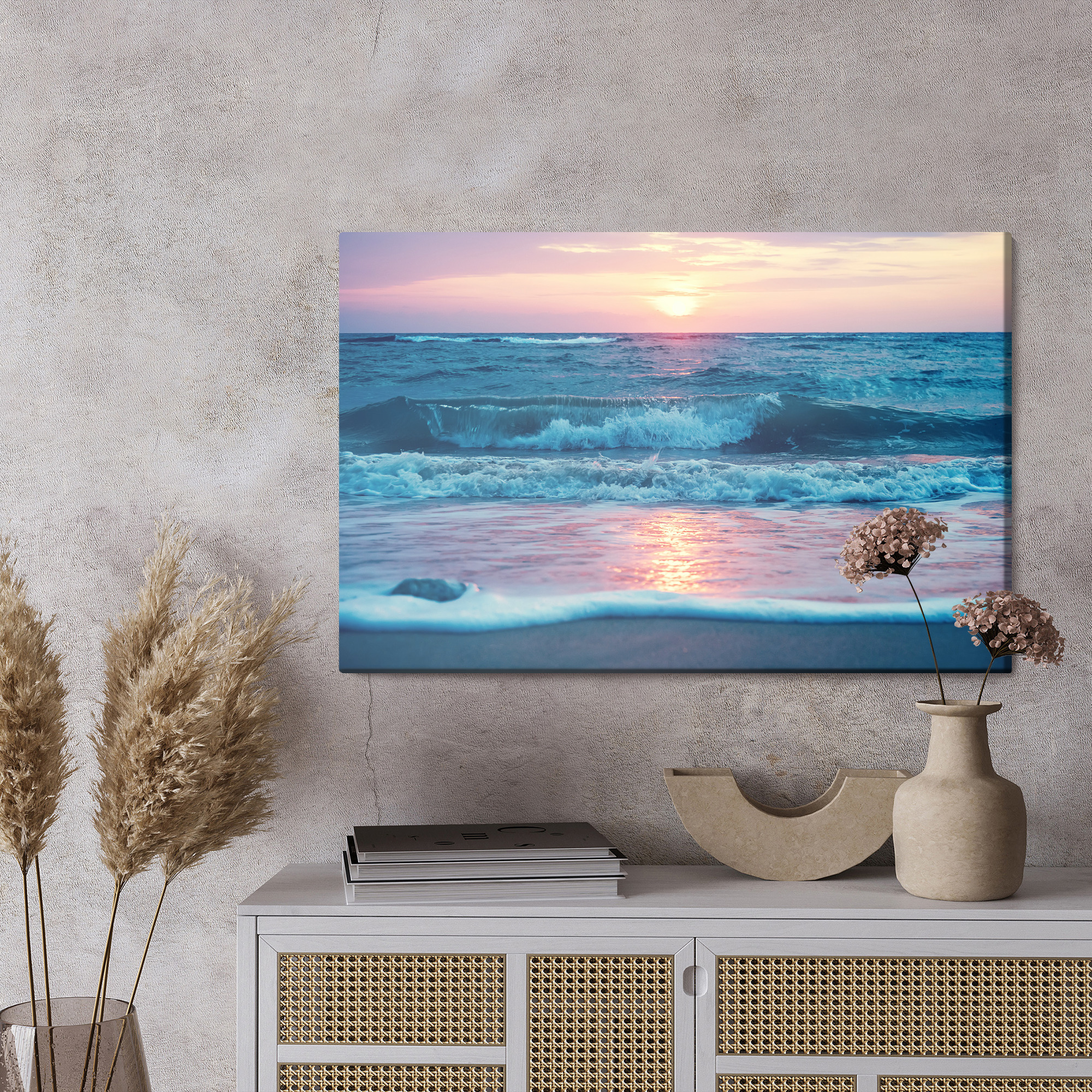 Bring the soothing rhythm of the sea into your interior: gentle waves roll onto the shore while the sun sinks behind the horizon, leaving a glowing trail on the water. This canvas print creates a calm, relaxing mood and visually opens the space, adding lightness. A pastel palette of blues and turquoises combined with warm pinks and a golden sunset reflection delivers a harmonious, elegant look on the wall. Perfect as wall art for a living room, bedroom, office, hotel, restaurant or hallway when you want modern sea-themed decor.