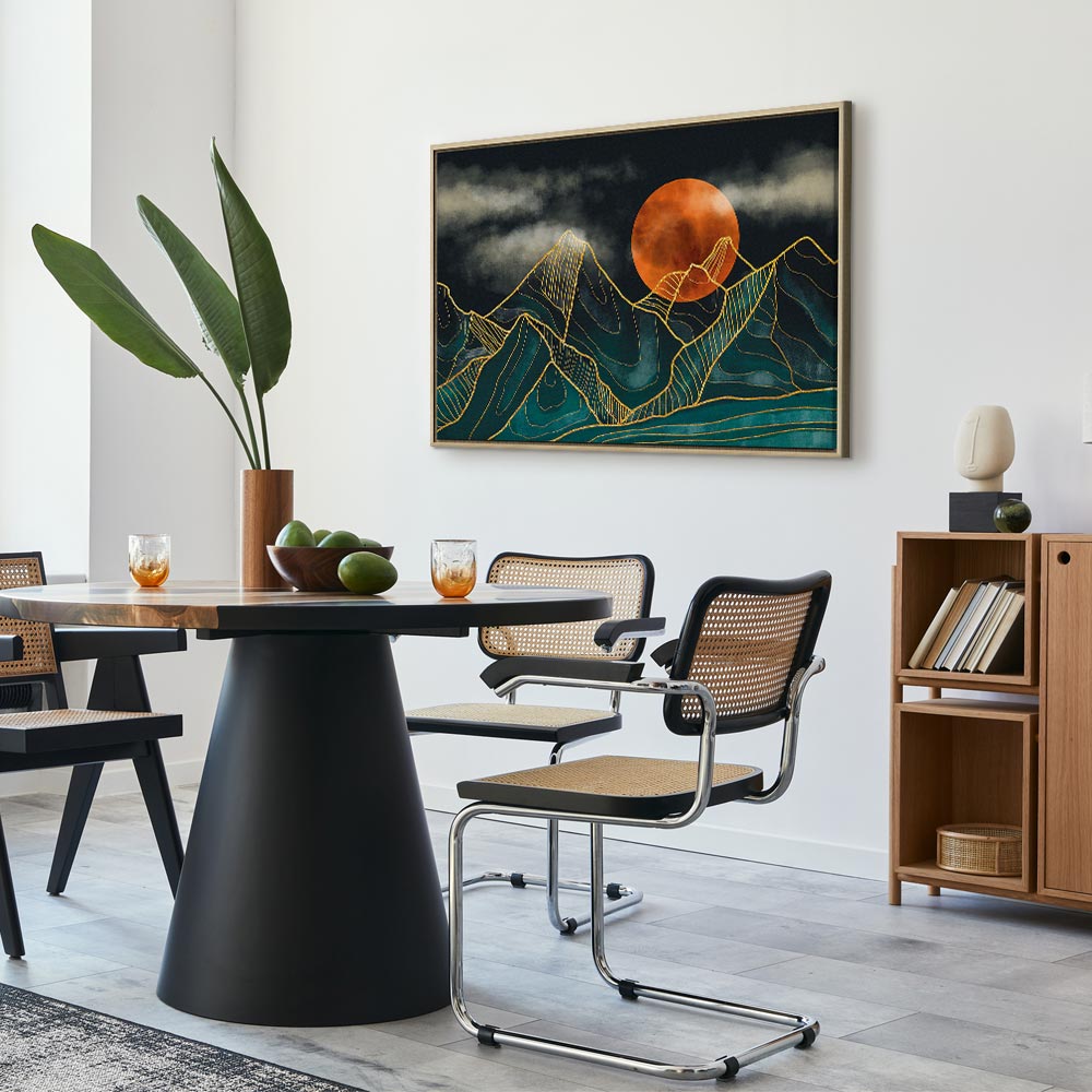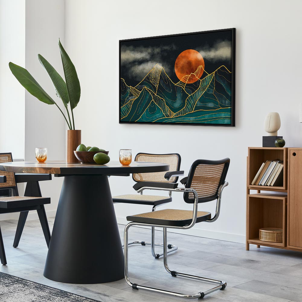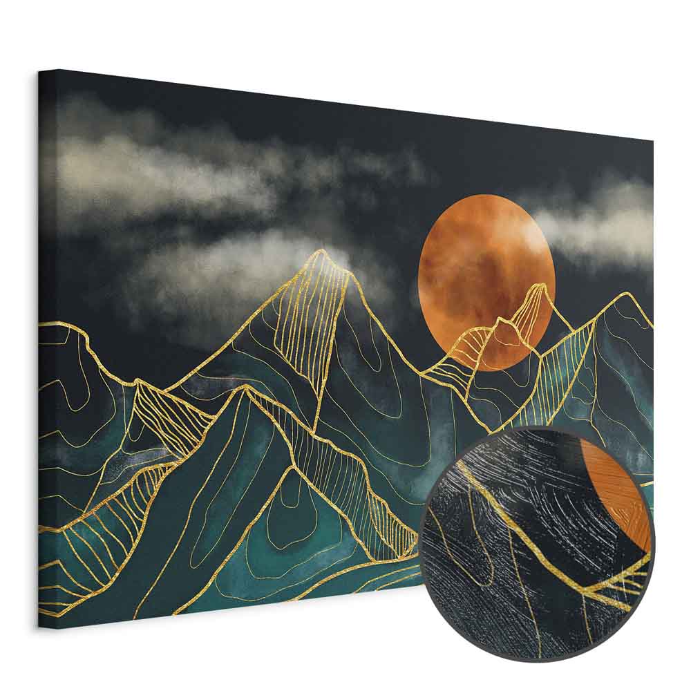 This canvas print captivates with a moody composition where a dark background, deep turquoise and subtle golden lines meet the warm glow of a copper sun. The stylized mountain landscape draws attention with its elegance and modern character, creating wall art full of calm, mystery and refined atmosphere. It is an ideal decoration for a living room, bedroom, office, hotel or restaurant, where it will highlight the style of the interior and add exceptional depth. It fits beautifully into modern, minimalist, industrial and glamour interiors. If you are looking for wall art that makes an impression and builds a unique atmosphere, this design is an excellent choice.