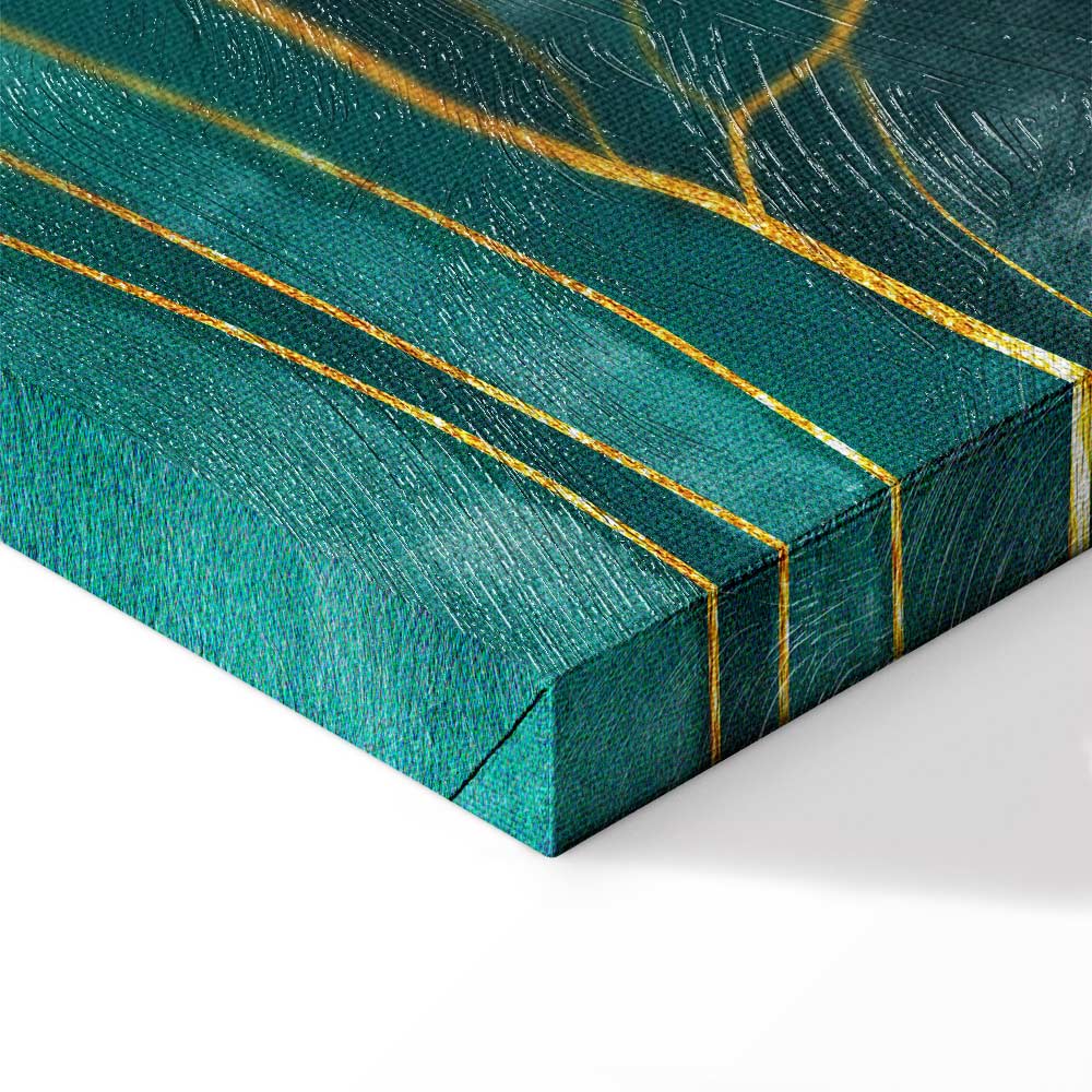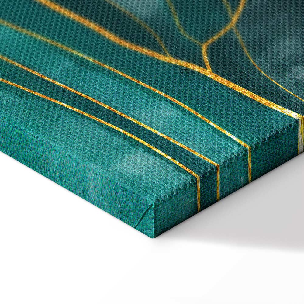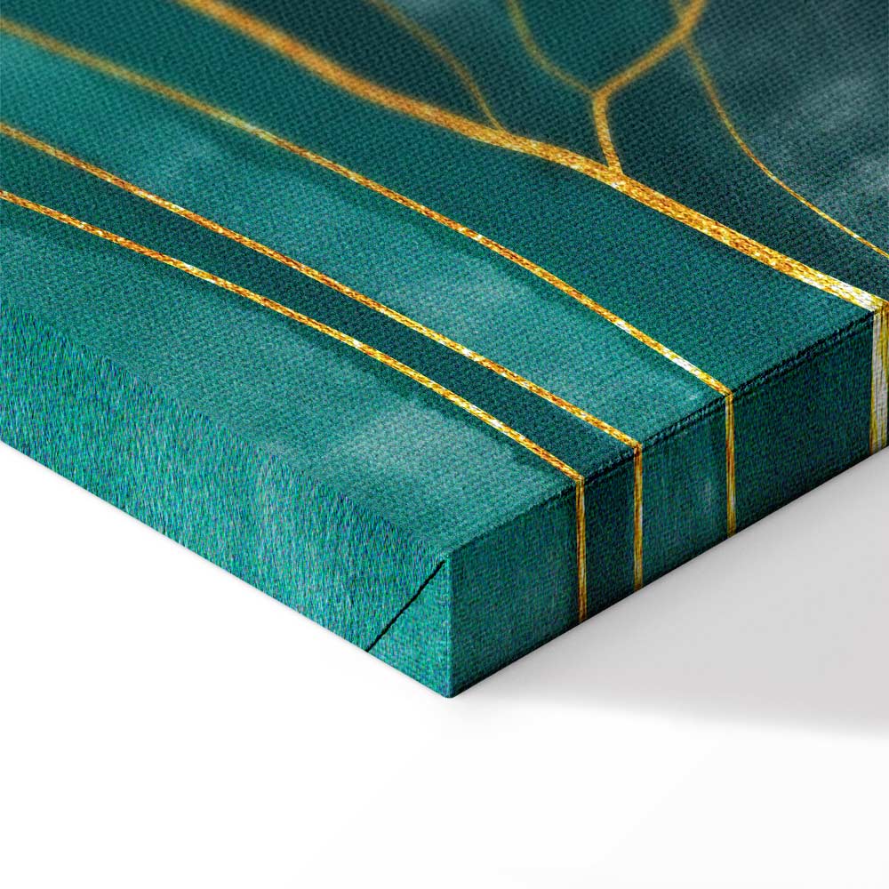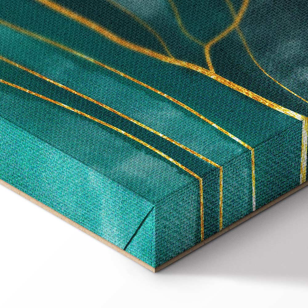 This canvas print captivates with a moody composition where a dark background, deep turquoise and subtle golden lines meet the warm glow of a copper sun. The stylized mountain landscape draws attention with its elegance and modern character, creating wall art full of calm, mystery and refined atmosphere. It is an ideal decoration for a living room, bedroom, office, hotel or restaurant, where it will highlight the style of the interior and add exceptional depth. It fits beautifully into modern, minimalist, industrial and glamour interiors. If you are looking for wall art that makes an impression and builds a unique atmosphere, this design is an excellent choice.