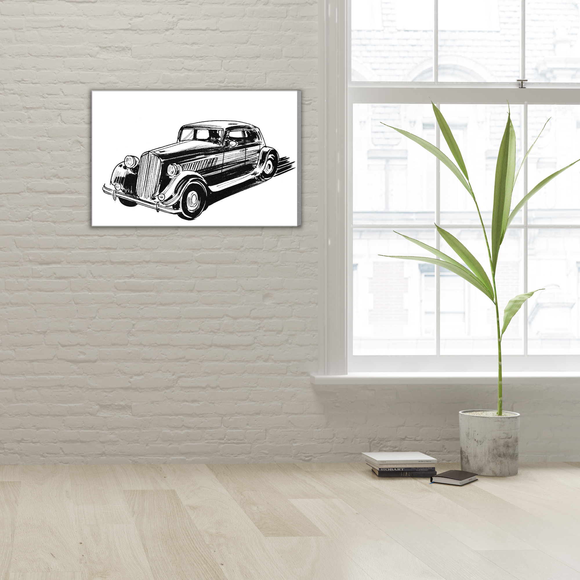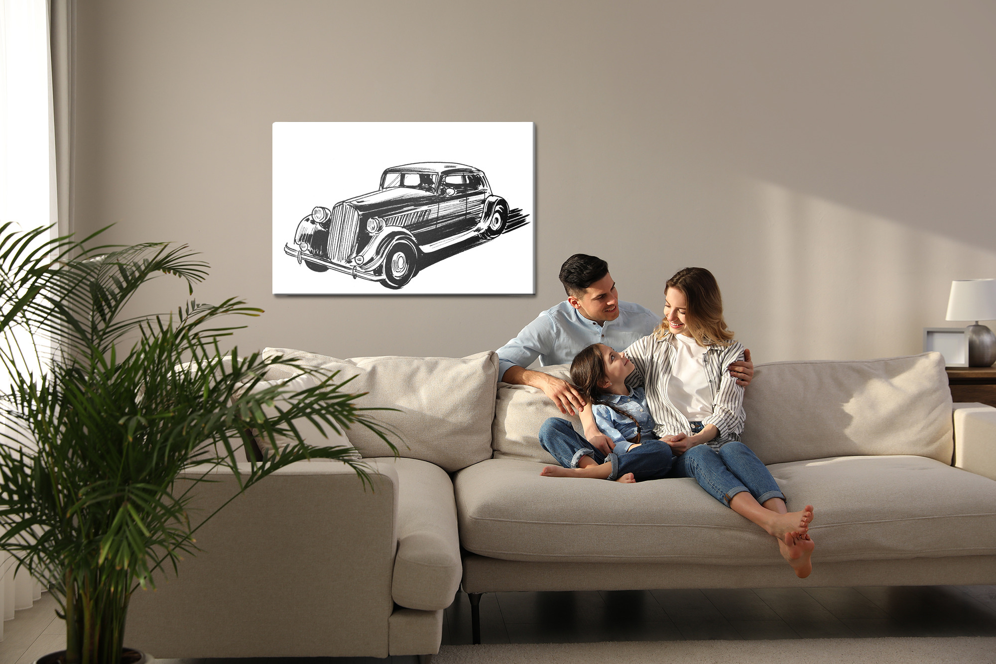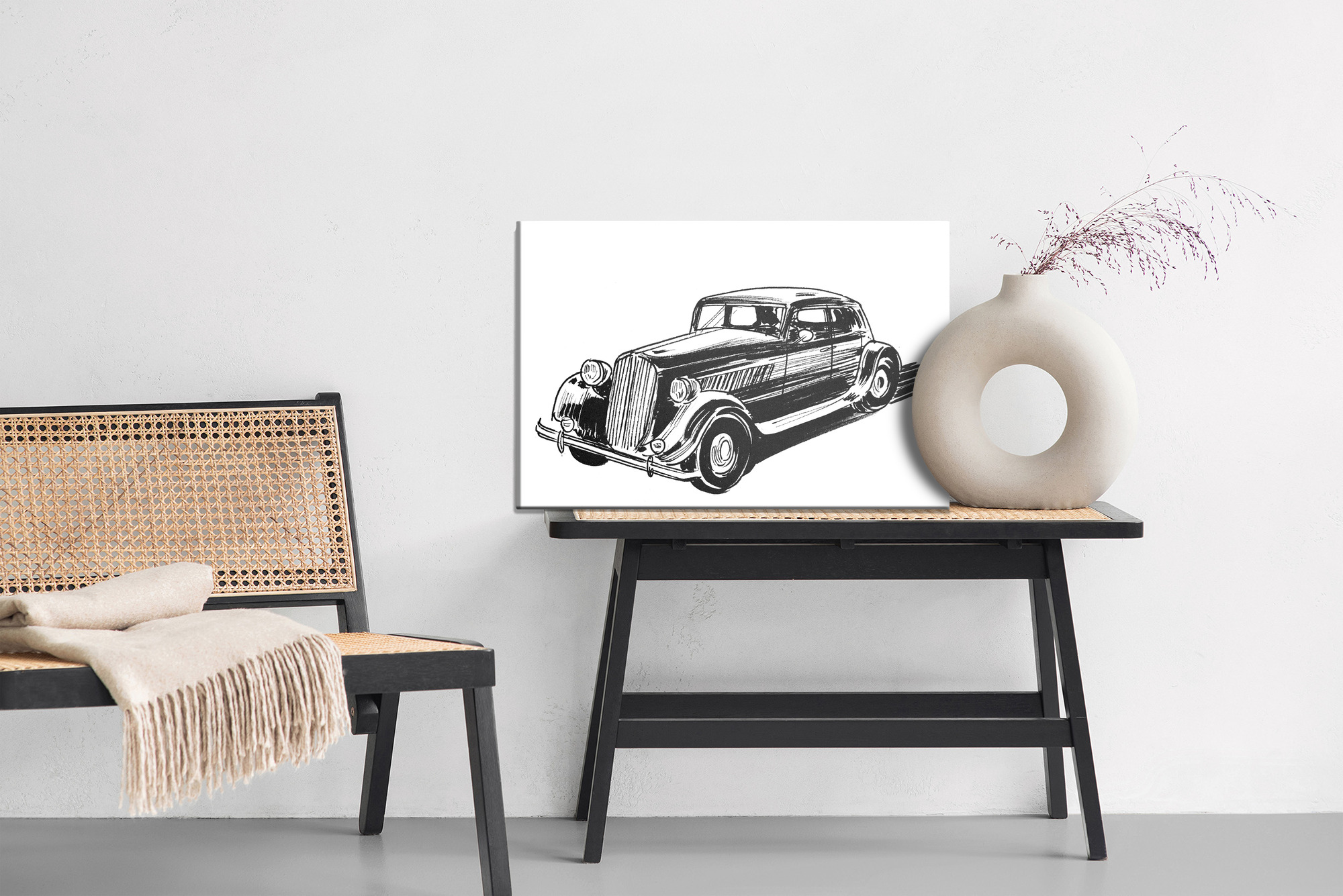 Add character to your interior with a touch of automotive nostalgia. This canvas print features a classic car in a dynamic black and white sketch that draws attention with its detail and instantly upgrades the style of the space. The strong contrast of crisp white and deep black gives the composition an elegant look that fits many interiors. It works beautifully as canvas wall art for the living room, home office, or entryway, and it also suits a hotel or restaurant, especially where a vintage vibe and design matter. A perfect pick for car lovers and for industrial or modern interiors.