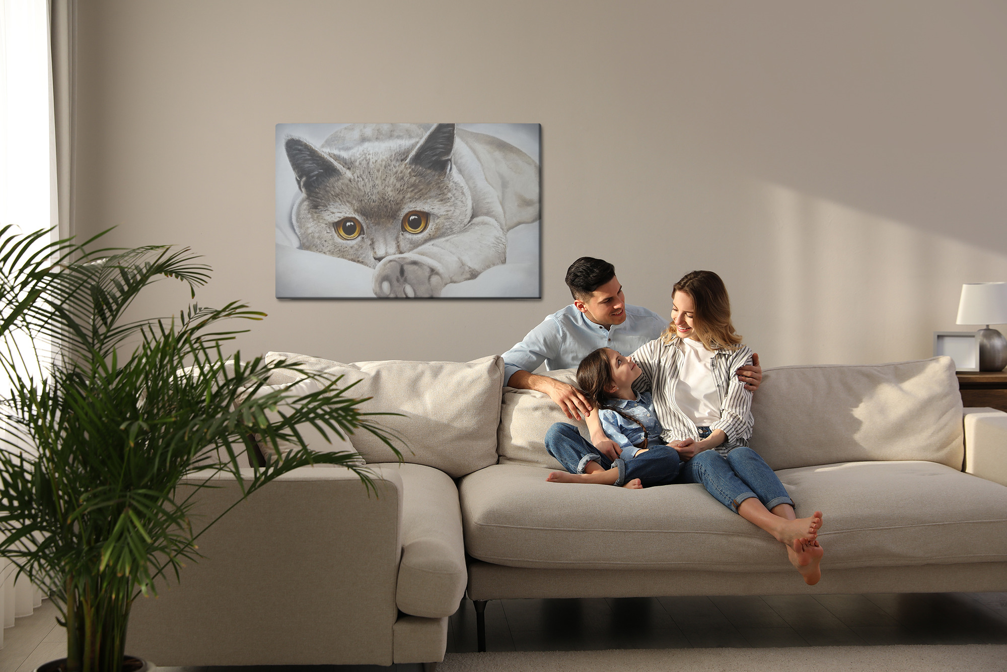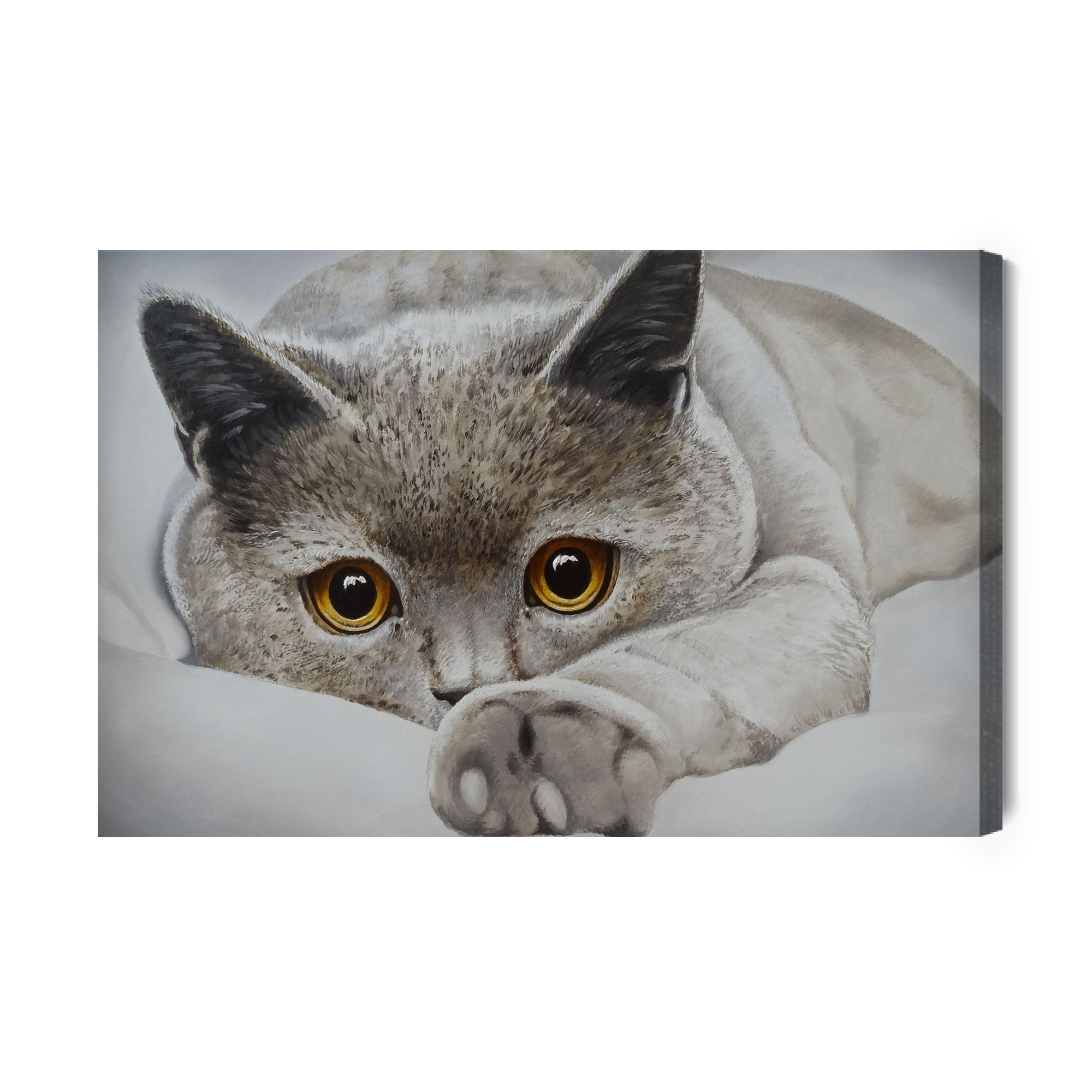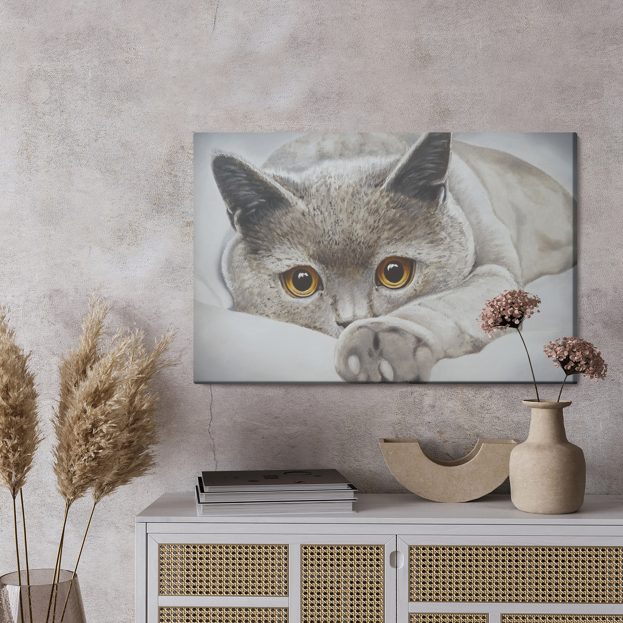 This canvas print featuring a cat captivates with its subtle form and draws attention with an exceptionally deep, piercing gaze. The gently painterly style, soft fur and toned down composition bring calm, coziness and an elegant accent into the interior. The light color palette based on shades of white, gray, beige and warm brown fits beautifully into modern, Scandinavian and minimalist spaces. It is a perfect wall art choice for the living room, bedroom, hallway, office or hotel, especially for those looking for stylish animal themed wall decor.