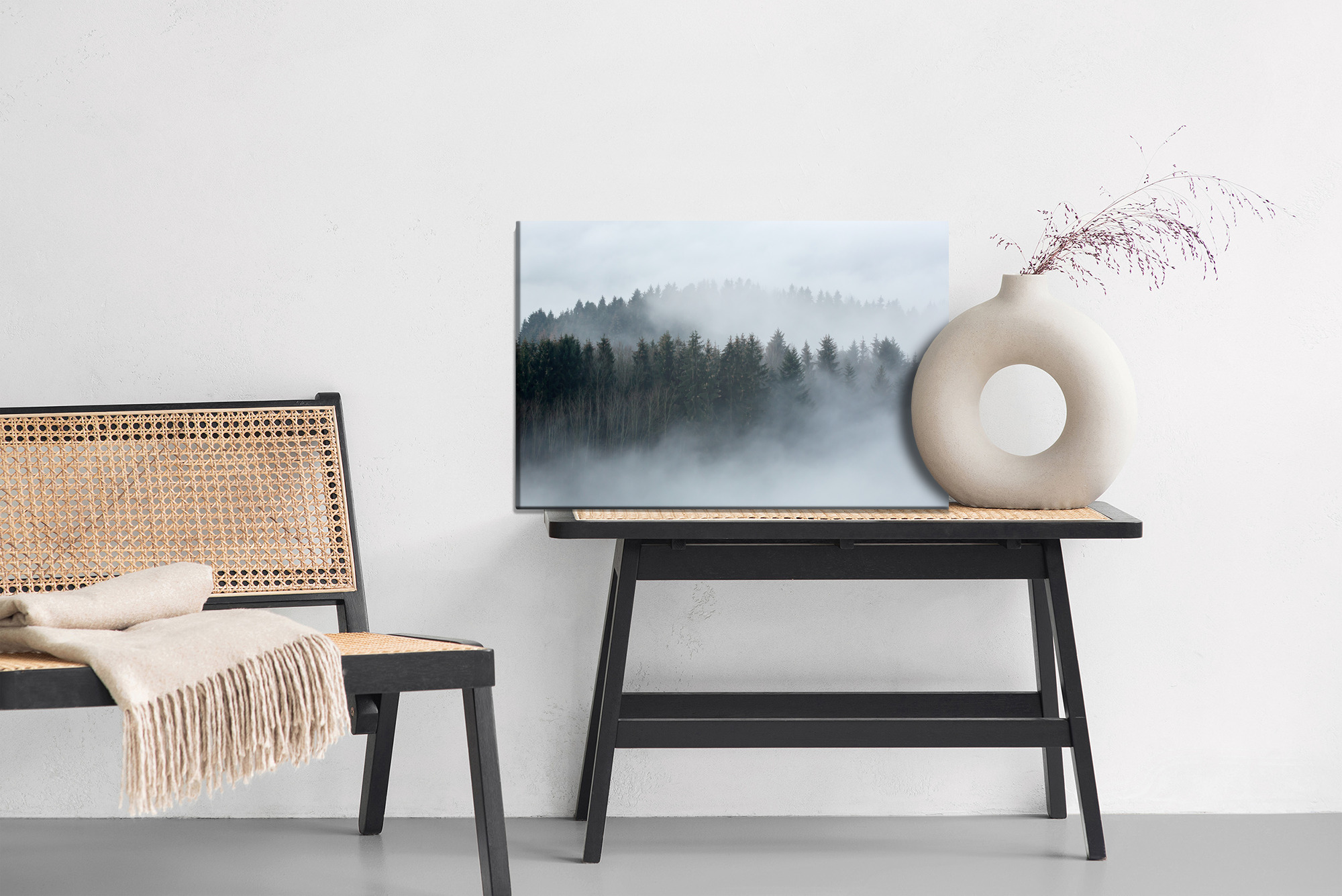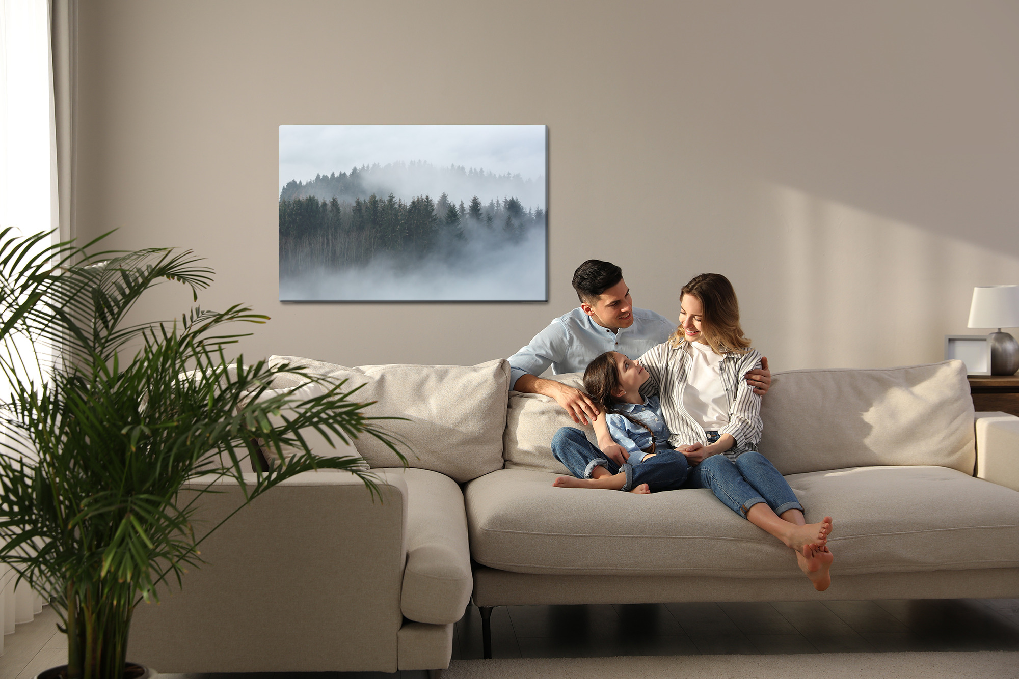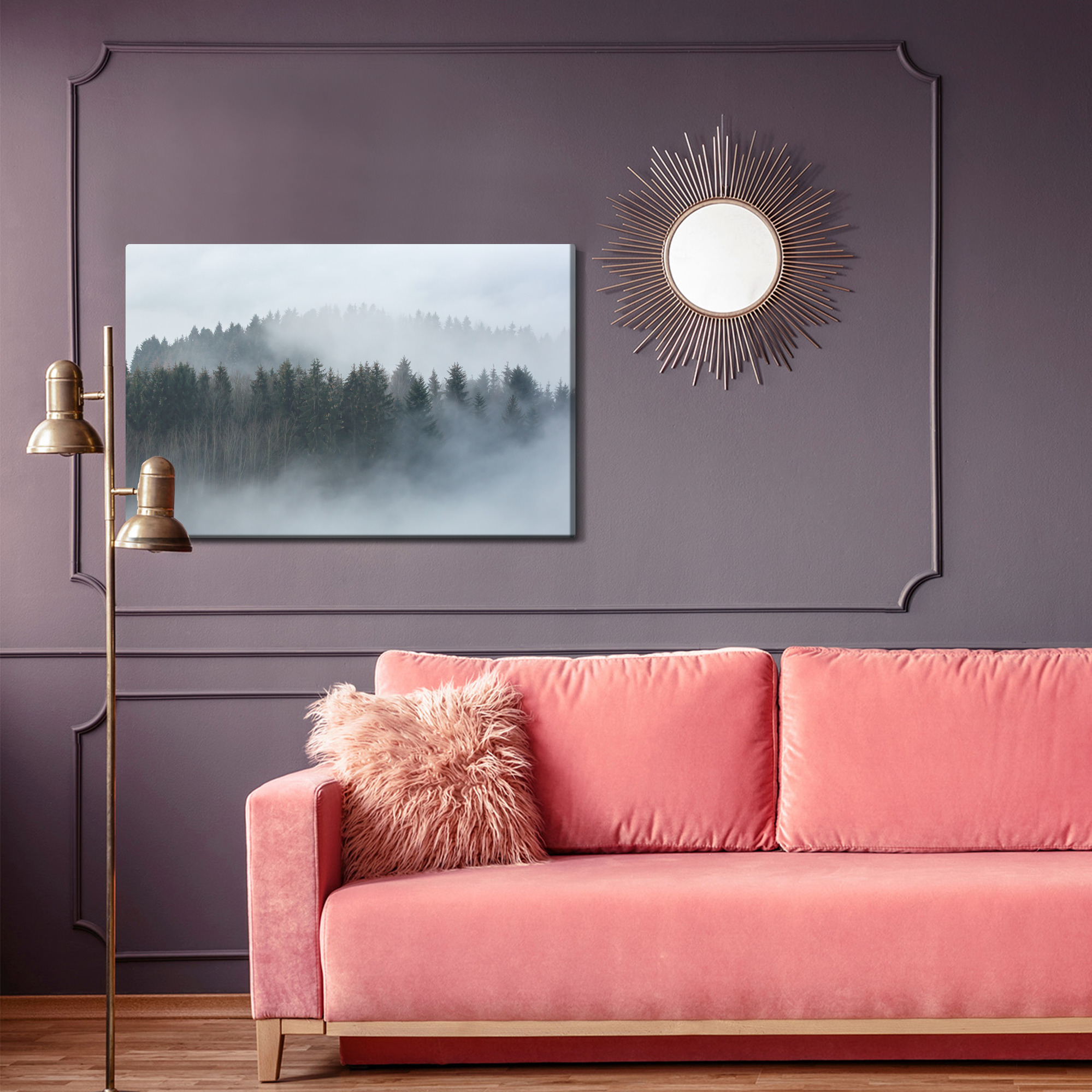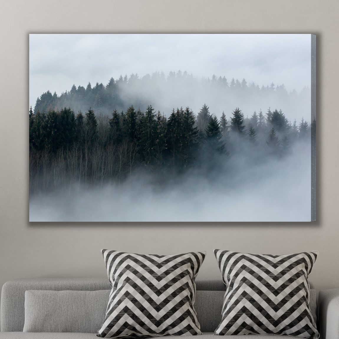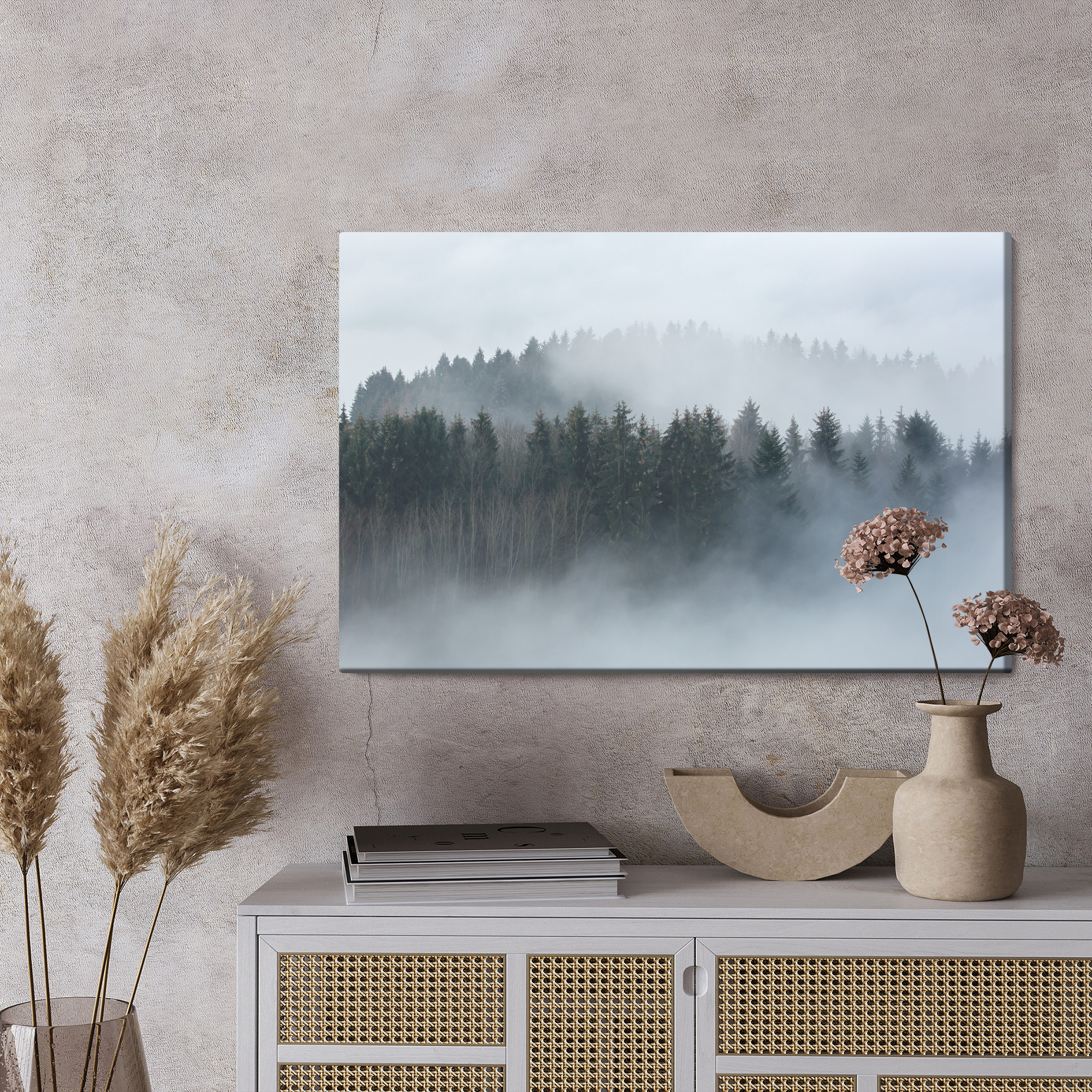 This atmospheric canvas art depicts a dense coniferous forest enveloped in mist, softly surrounding the trees and creating an ambiance of calm, silence, and mystery. It’s a unique composition that brings the harmony of nature indoors, giving a sense of connection with the wild and untamed outdoors. Gentle shades of gray, green, and blue create a cool, subdued tone, perfect for interiors in modern, Scandinavian, minimalist, or boho styles.