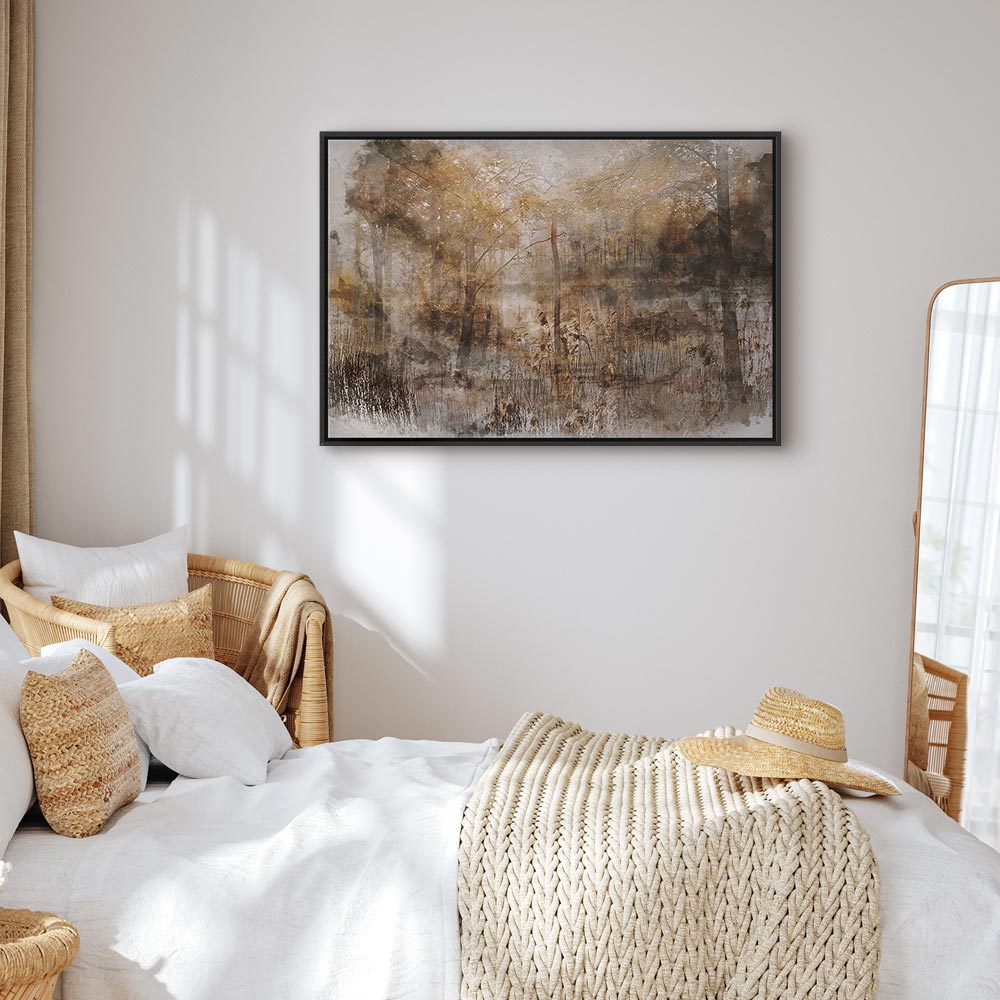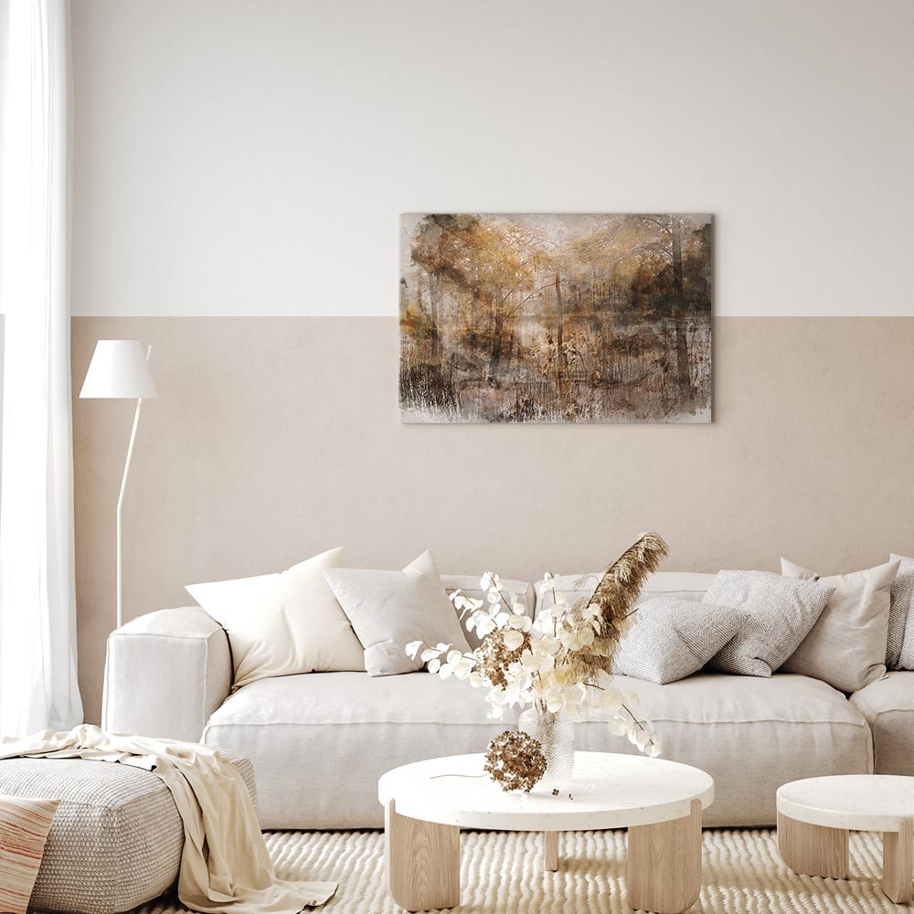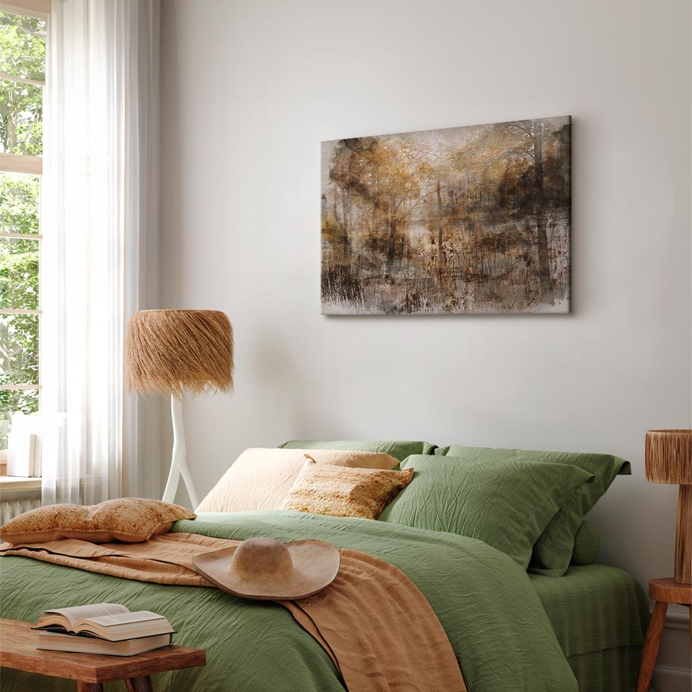 A canvas print with a misty forest motif delights with its subtle atmosphere of calm and natural elegance. Gently blending trees, grasses and soft light create a composition that brings harmony and a sense of lightness into the interior. The beige and brown palette with a hint of grey makes this artwork a perfect fit for a living room, bedroom, hallway, office, hotel or restaurant. It is an excellent choice for anyone looking for stylish wall art that combines nature with timeless character. This canvas print for the living room adds warmth to the space and helps create a cosy and soothing atmosphere.