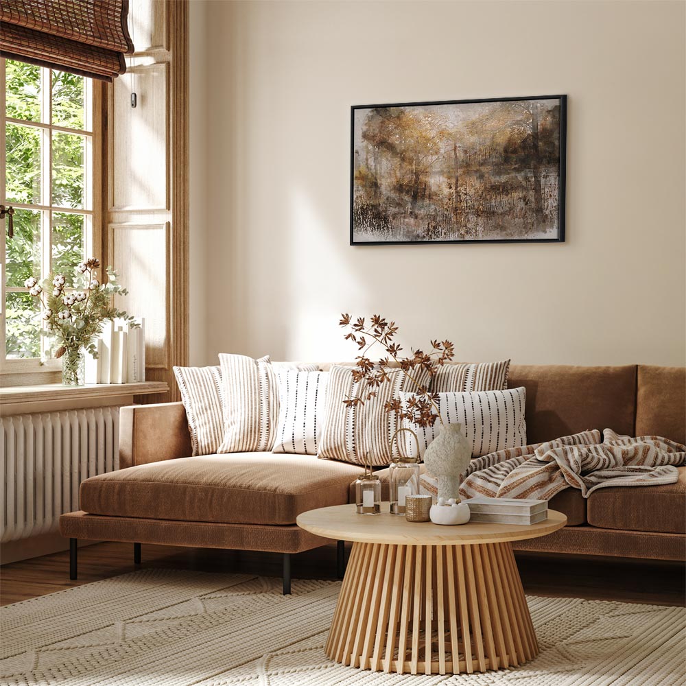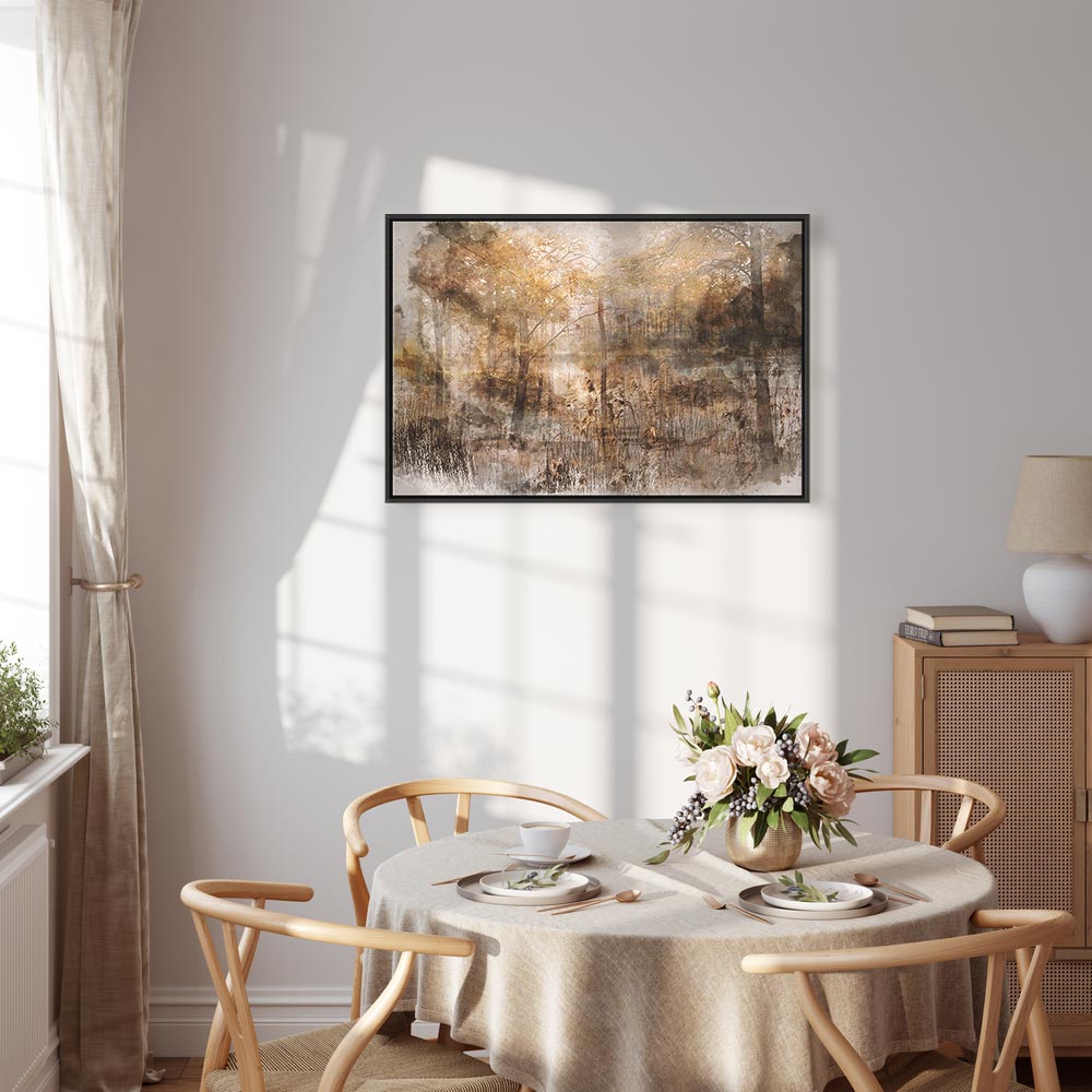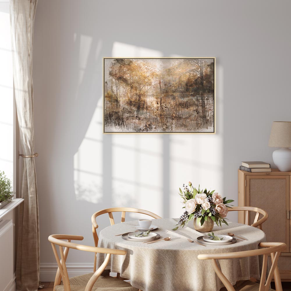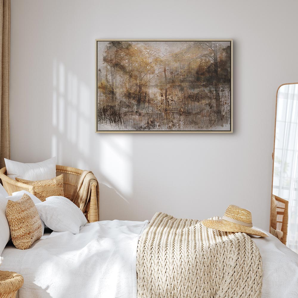 A canvas print with a misty forest motif delights with its subtle atmosphere of calm and natural elegance. Gently blending trees, grasses and soft light create a composition that brings harmony and a sense of lightness into the interior. The beige and brown palette with a hint of grey makes this artwork a perfect fit for a living room, bedroom, hallway, office, hotel or restaurant. It is an excellent choice for anyone looking for stylish wall art that combines nature with timeless character. This canvas print for the living room adds warmth to the space and helps create a cosy and soothing atmosphere.