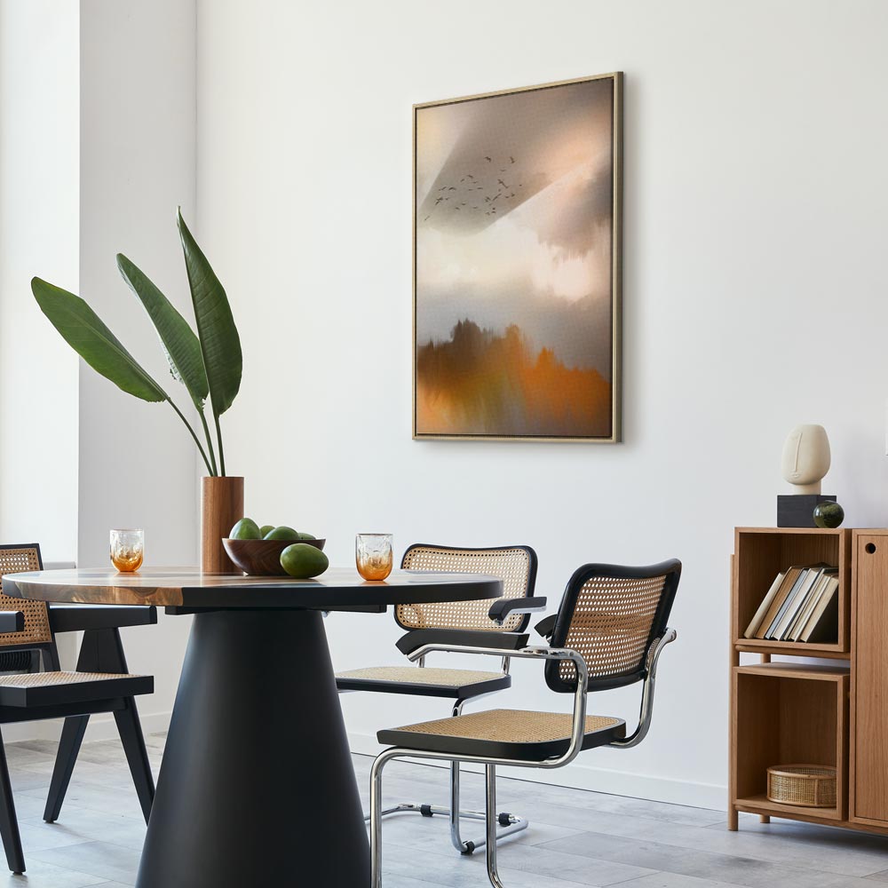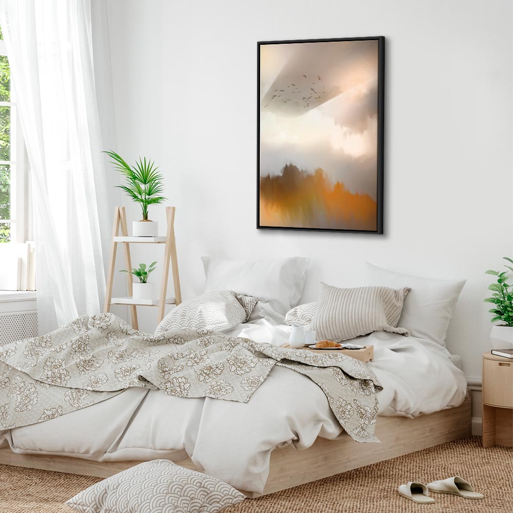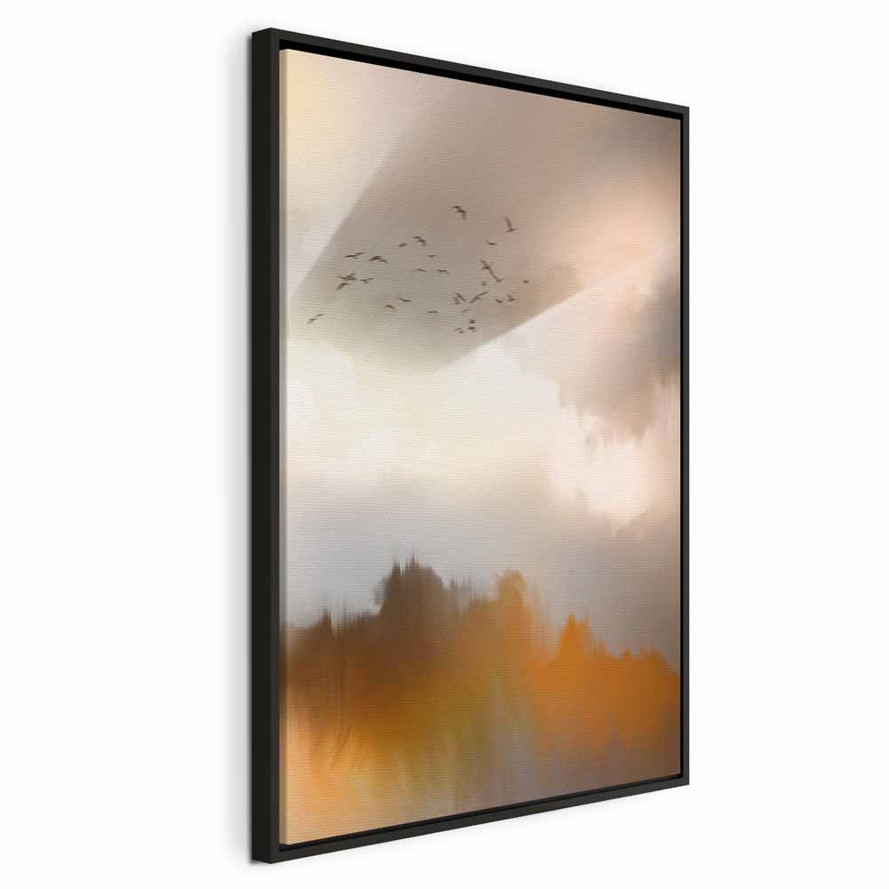 This canvas print enchants with a delicate, painterly composition inspired by the calm of nature. Blurred forms, subtle silhouettes of birds and warm reflections of gold and beige create an exceptionally harmonious wall decoration that brings lightness, quiet and an elegant mood into the interior. The bright, pastel color palette makes the artwork perfect for visually brightening a space and beautifully complementing a living room, bedroom, office, hotel or hallway. It is an excellent choice for those who appreciate modern wall art for the living room while looking for decoration full of subtlety and emotion. This wall art helps create an interior that encourages relaxation and everyday calm.