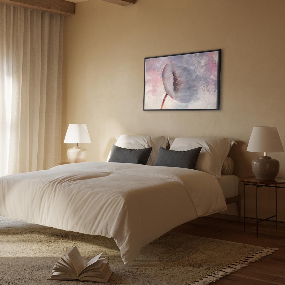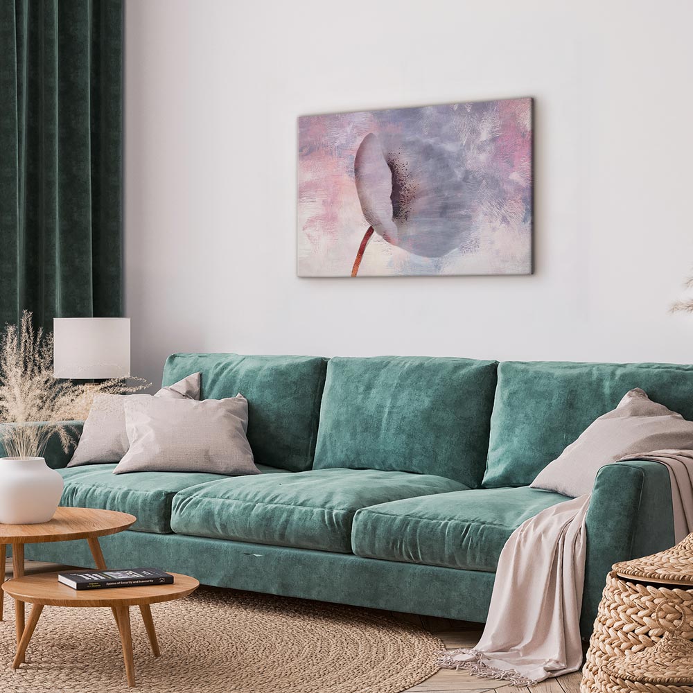 This subtle canvas print with a floral motif enchants with its lightness, calm mood and exceptionally soft color palette. Washed out shades of pink, violet, grey and white create a pastel composition that brings harmony, freshness and elegant softness into the interior. This wall art is a perfect choice for a living room, bedroom, hallway, hotel or office, beautifully complementing modern, minimalist and feminine arrangements. It is an ideal option for those who are looking for a decoration full of delicate charm, helping to create a cozy atmosphere and adding a gentle artistic accent to the space.