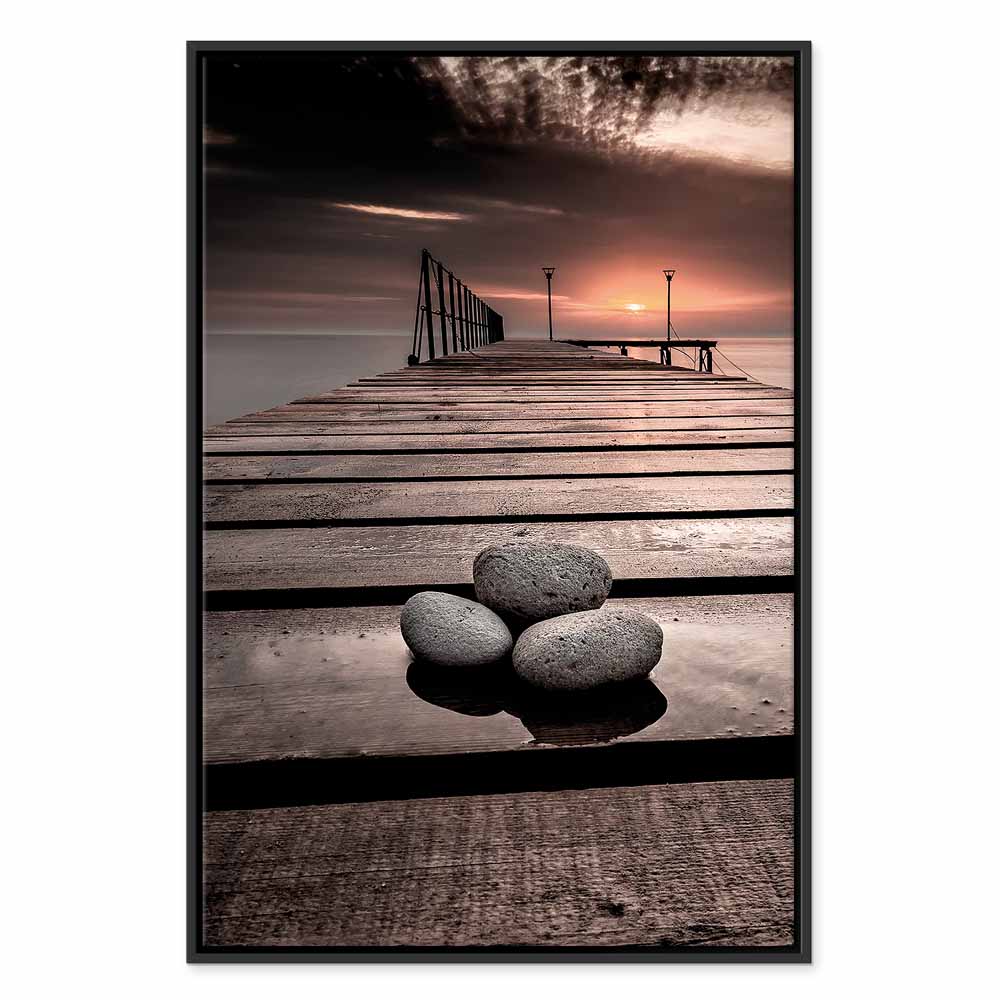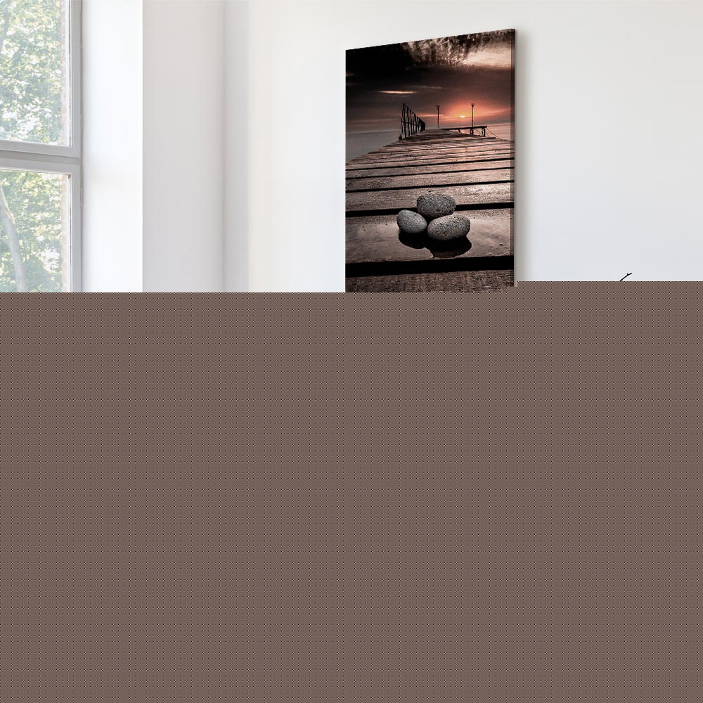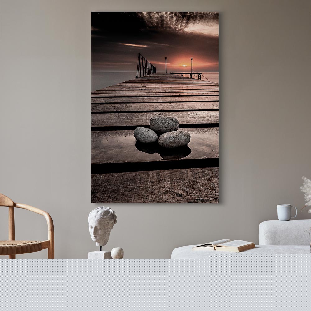 A moody canvas print featuring a wooden pier, stones, and a calm water surface captivates with its elegant composition and soothing atmosphere. The warm light of the setting sun subtly brightens the darker scenery, creating a harmonious blend of brown, grey, beige, and muted pink tones. It is a stylish choice for the living room, bedroom, hotel, office, or hallway, perfect for modern, minimalist, and nature inspired interiors. This wall art draws attention with its depth of perspective and peaceful character, beautifully creating an atmosphere of relaxation and timeless elegance.