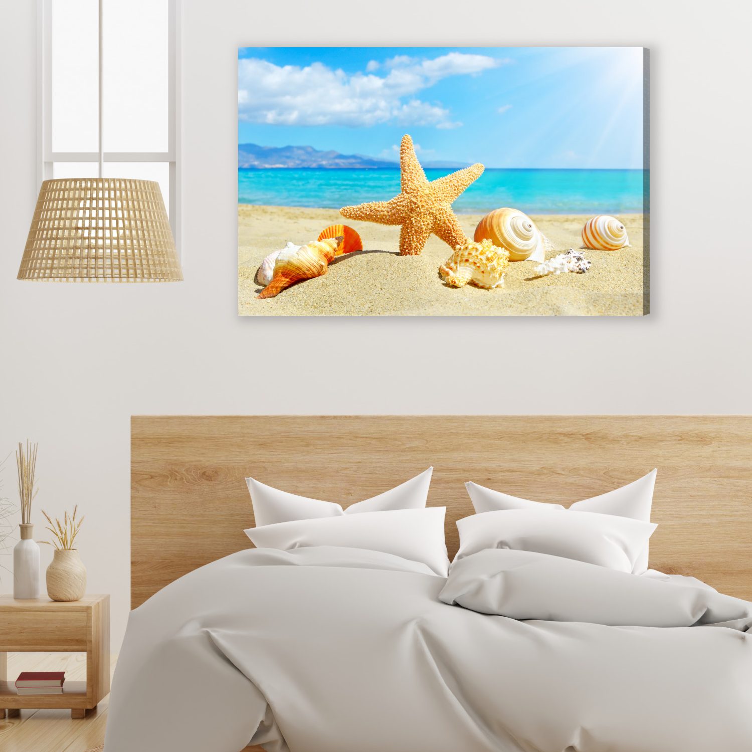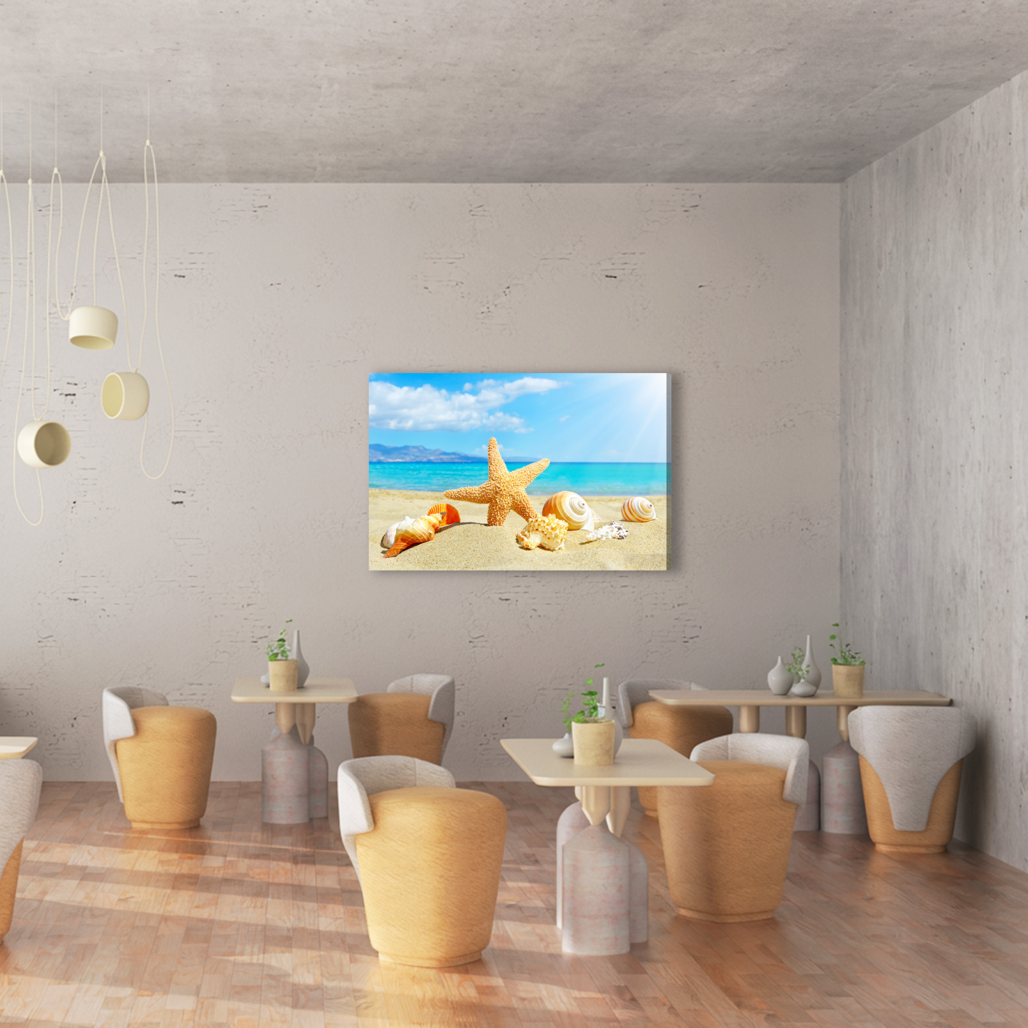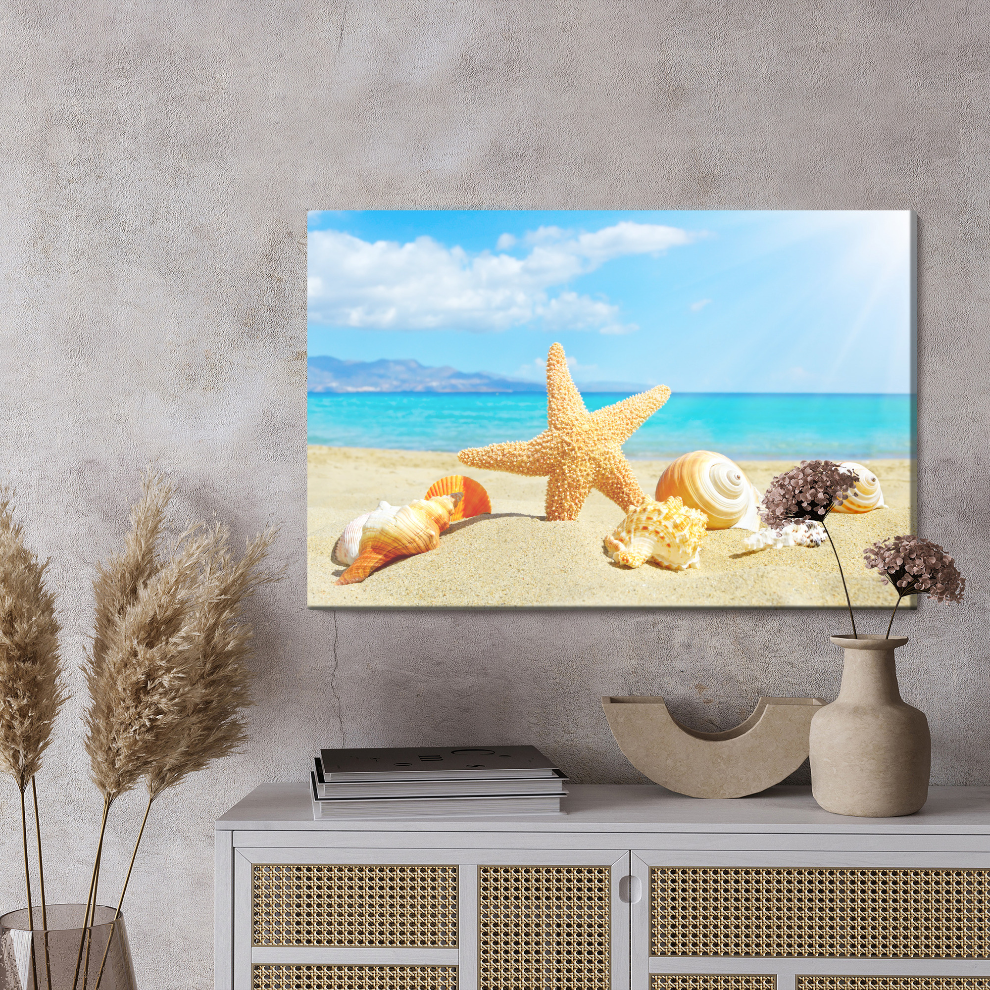 A sunny canvas print featuring a starfish and seashells on warm sand brings a holiday sense of calm and lightness into your interior. Turquoise water, a blue sky, and soft sandy tones create a bright, fresh palette that visually opens up the space. This wall art is perfect for a living room, bedroom, bathroom, or hallway when you want to feel a coastal relax vibe every day. It also works beautifully in a hotel or restaurant, adding summery energy and a welcoming atmosphere.