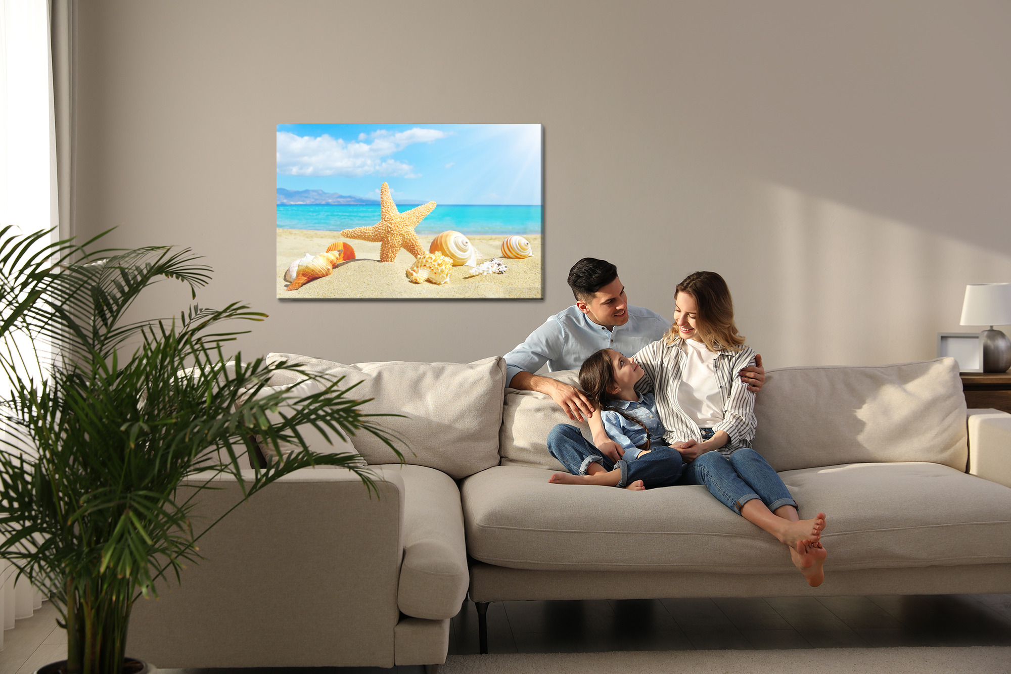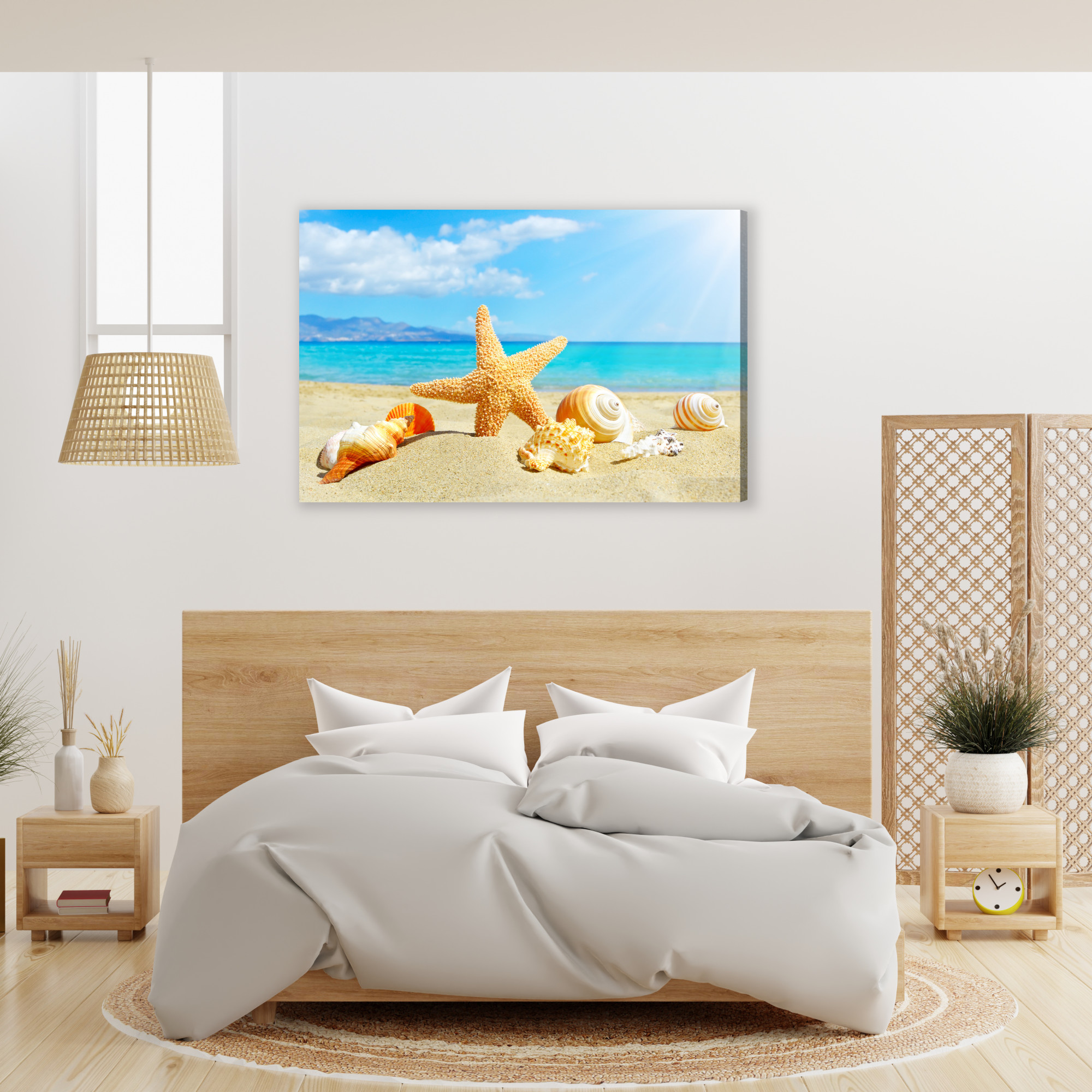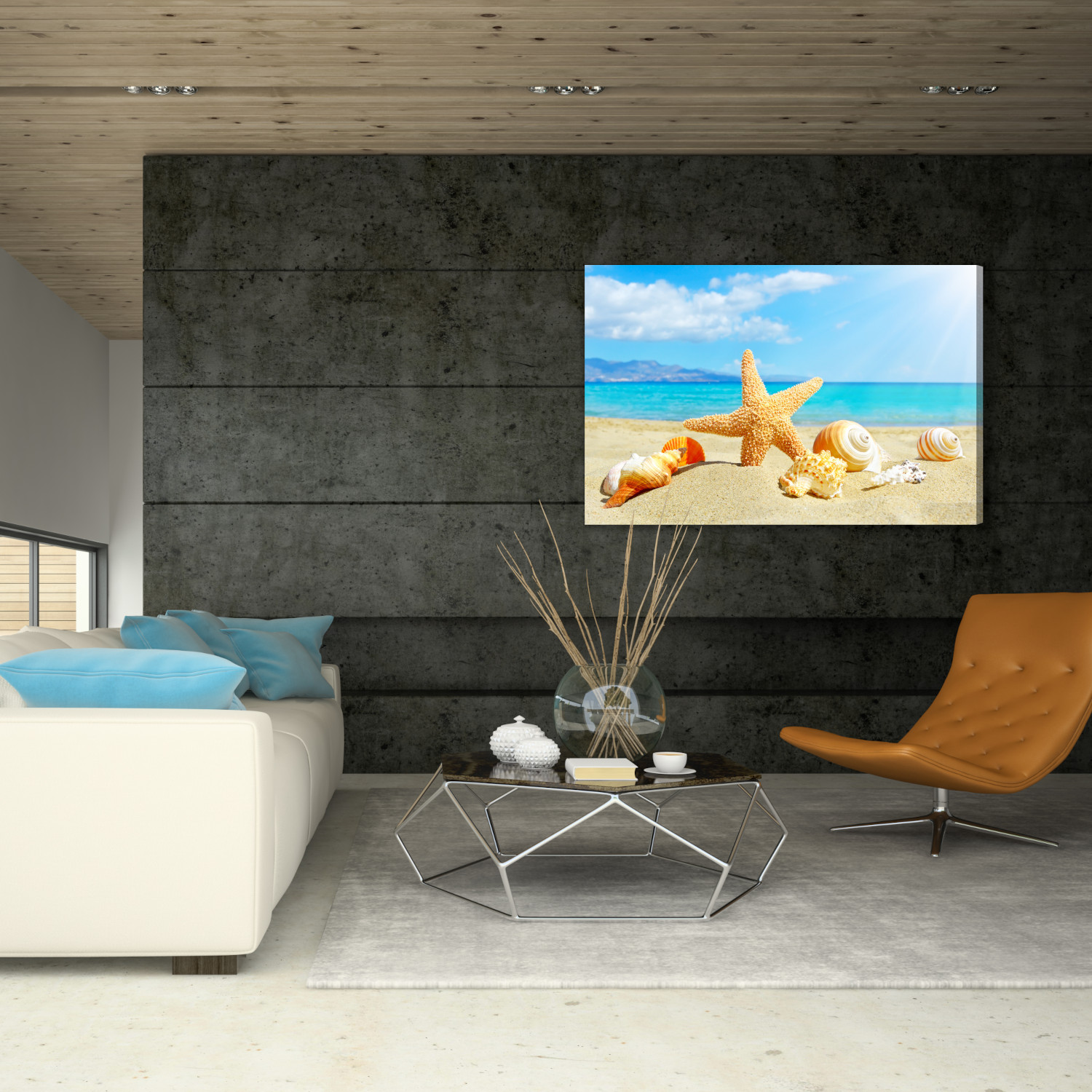 A sunny canvas print featuring a starfish and seashells on warm sand brings a holiday sense of calm and lightness into your interior. Turquoise water, a blue sky, and soft sandy tones create a bright, fresh palette that visually opens up the space. This wall art is perfect for a living room, bedroom, bathroom, or hallway when you want to feel a coastal relax vibe every day. It also works beautifully in a hotel or restaurant, adding summery energy and a welcoming atmosphere.